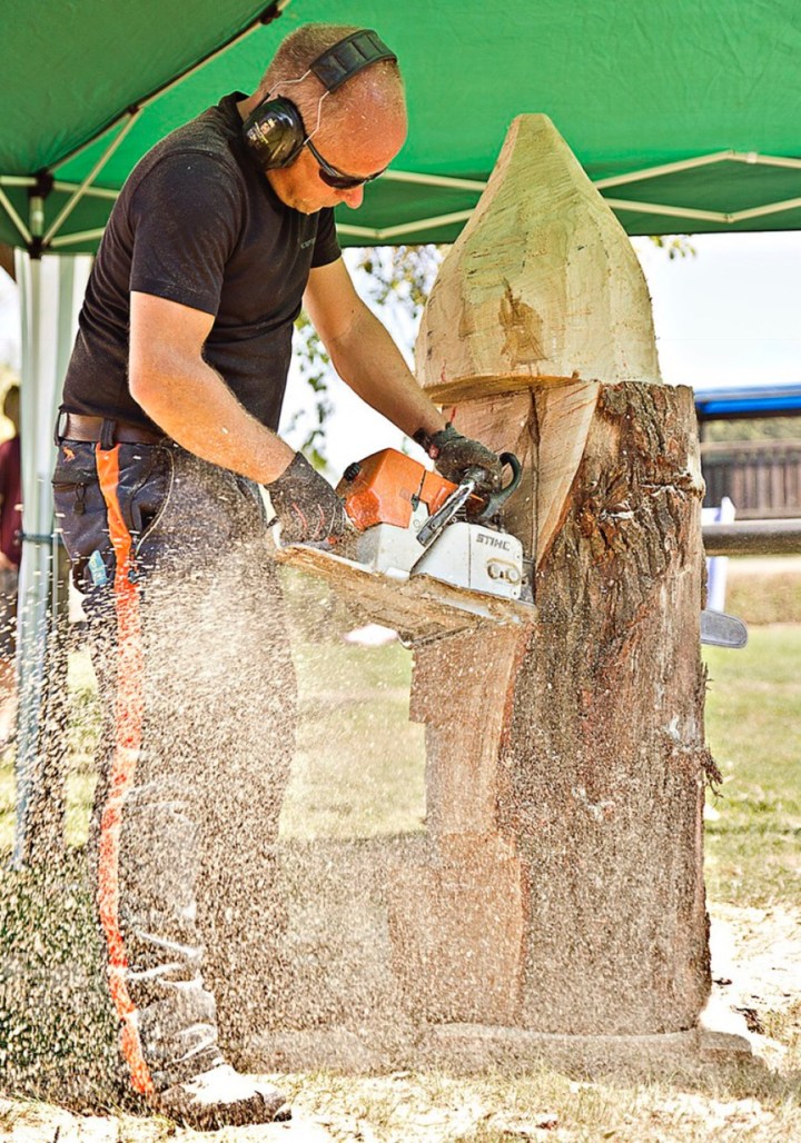Um die Formen und Skulpturen entstehen zu lassen, arbeitet Ingo Luke dann mit der Kettensäge. Für die filigranen Elemente, wie etwa die nachgebildeten Fichten, nutzt er die kleinere, für gröbere logischerweise die größere. Auch hier wird Schicht für Schicht abgetragen, bis nach und nach das Kunstwerk zu erkennen ist.