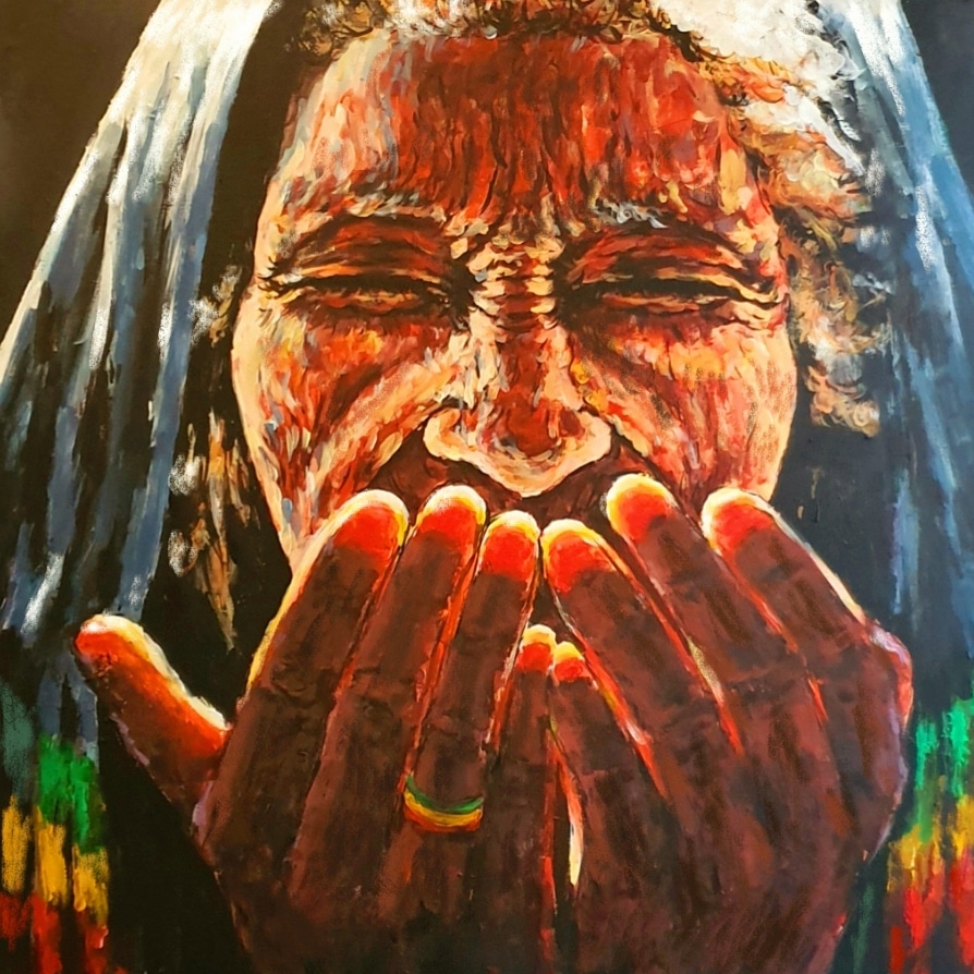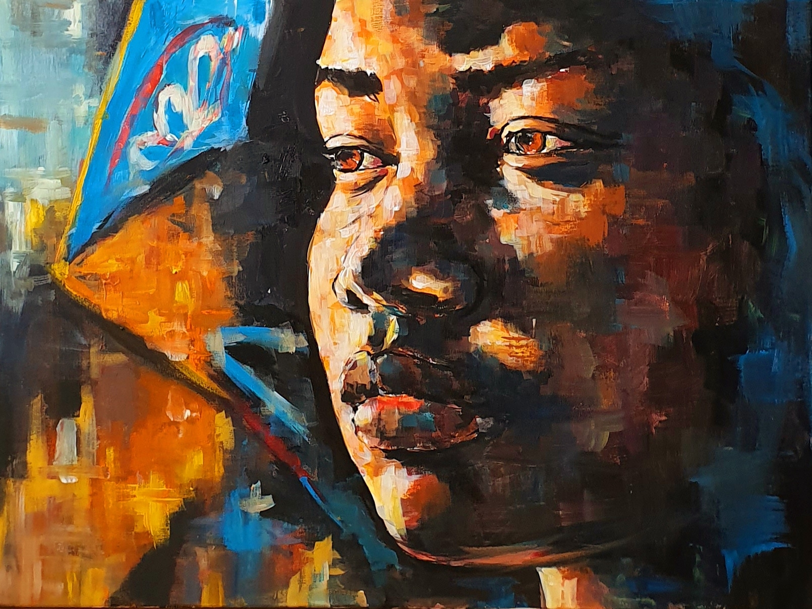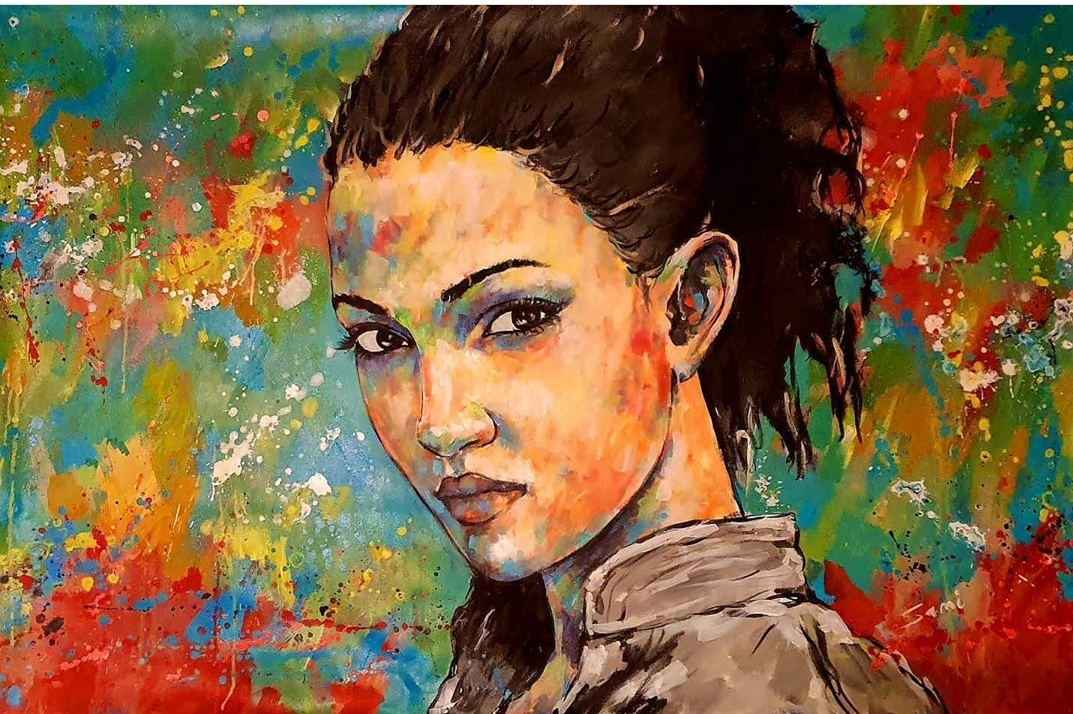 Hauptsächlich malt Sami großflächige Portraits mit Acryl, häufig mit abstraktem Hintergrund – ganz anders als die Kreidebilder, aber ebenso atemberaubend schön…