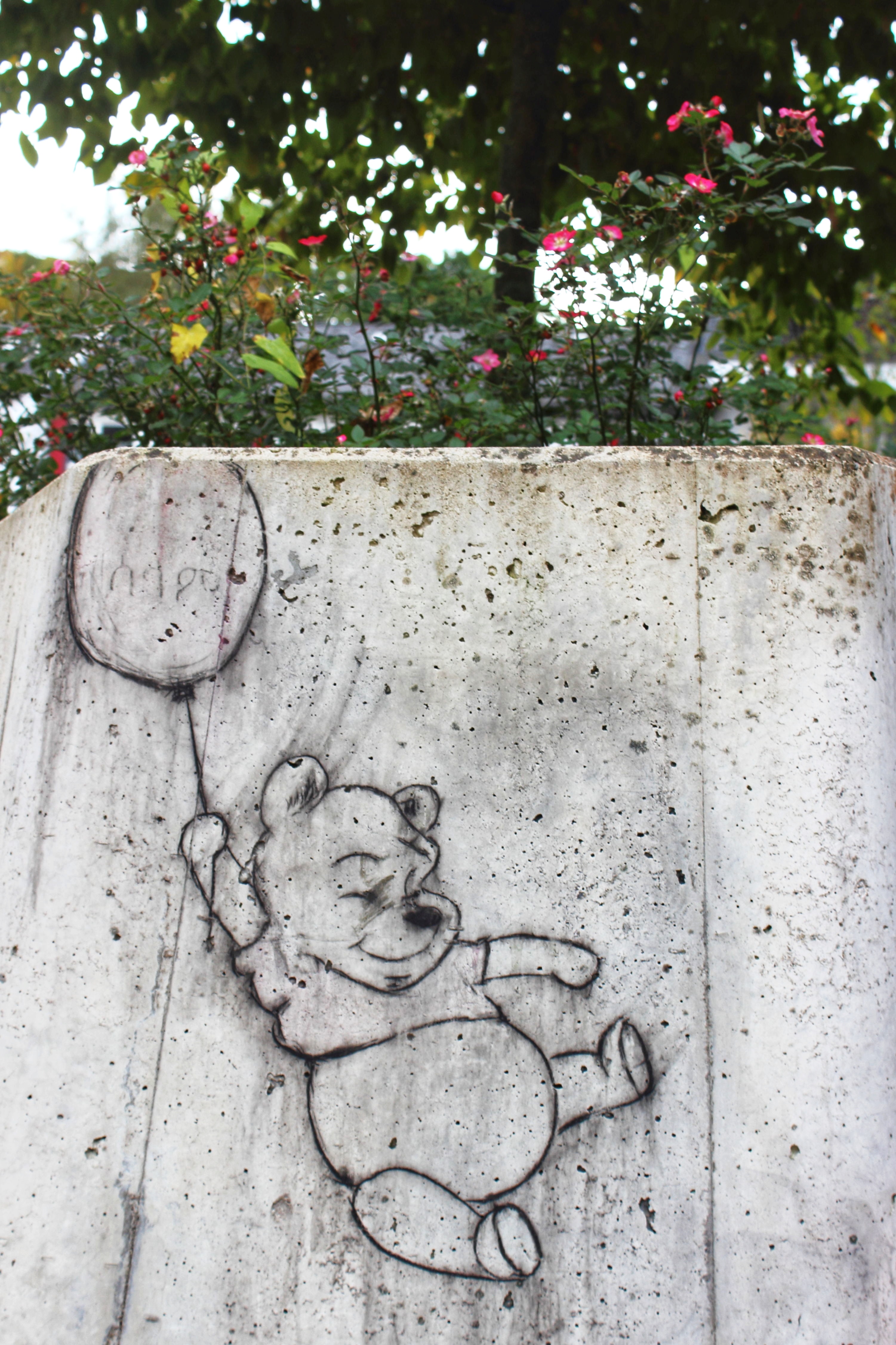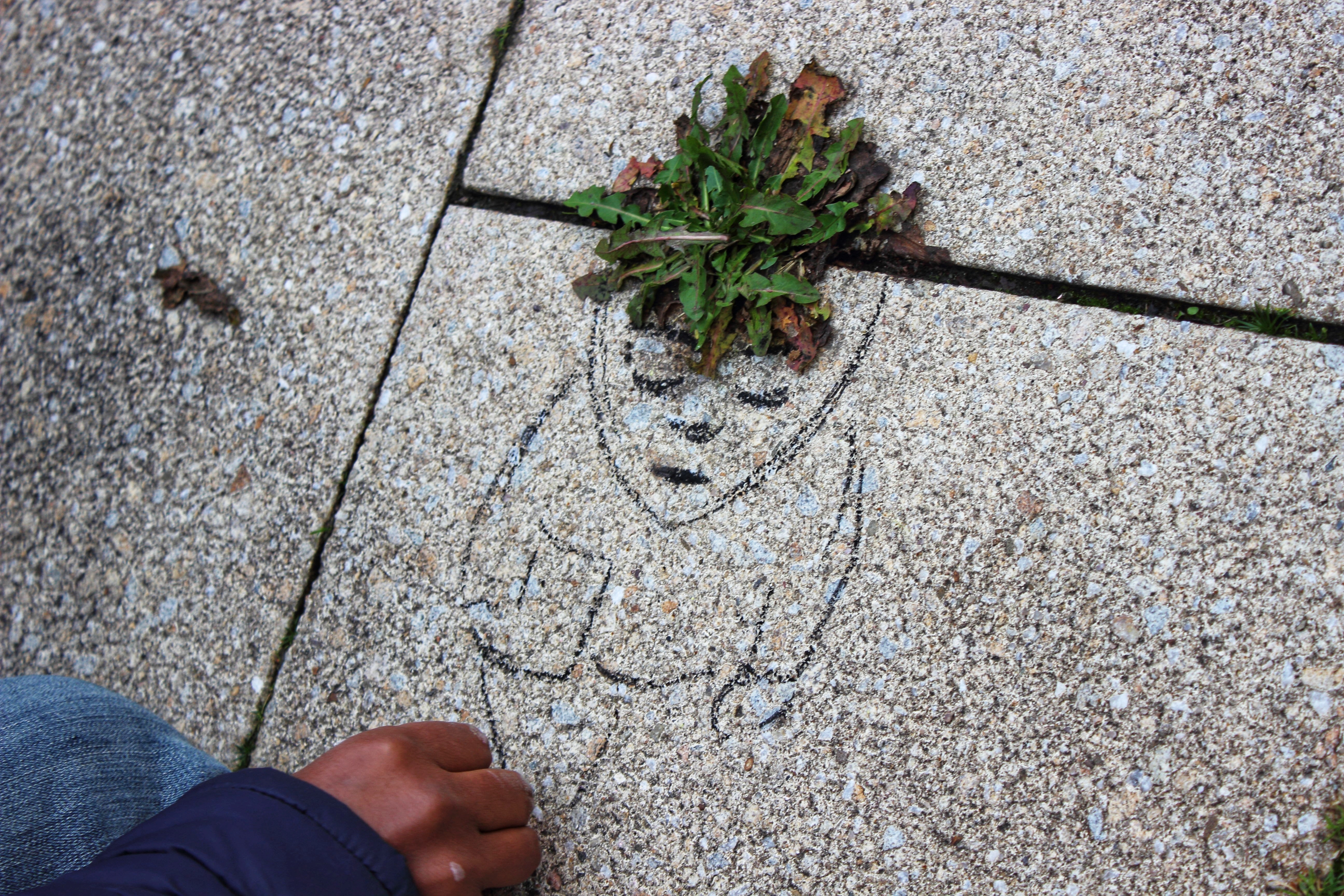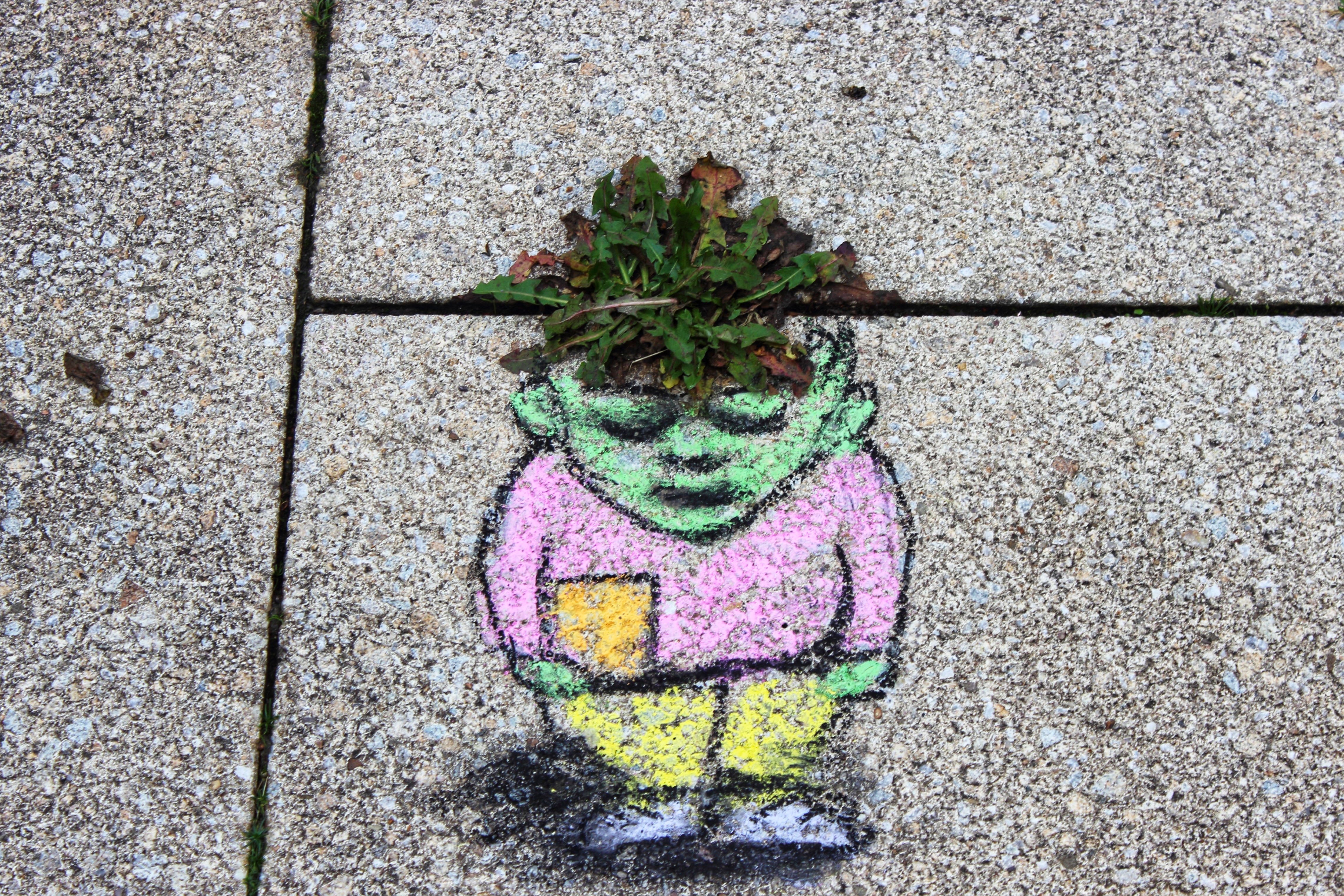 Auch wenn sie nicht so aussehen: Die Kreidebilder entstehen ganz spontan. Sami hat seine Kreide immer dabei, und wenn ihn eine Stelle inspiriert, hat er das Motiv dazu direkt im Kopf. Zum Glück sind die Bilder nicht so blitzschnell wieder verschwunden, wie sie aufgetaucht sind, aber meist hält die bunte Farbe nicht länger als bis zum nächsten Regen. Die schwarzen Umrandungen bleiben allerdings für drei bis vier Wochen, und so hat das kleine Pflänzchen auch nach dem Regen noch Gelegenheit, liebevoll mit Wasser versorgt zu werden 😉