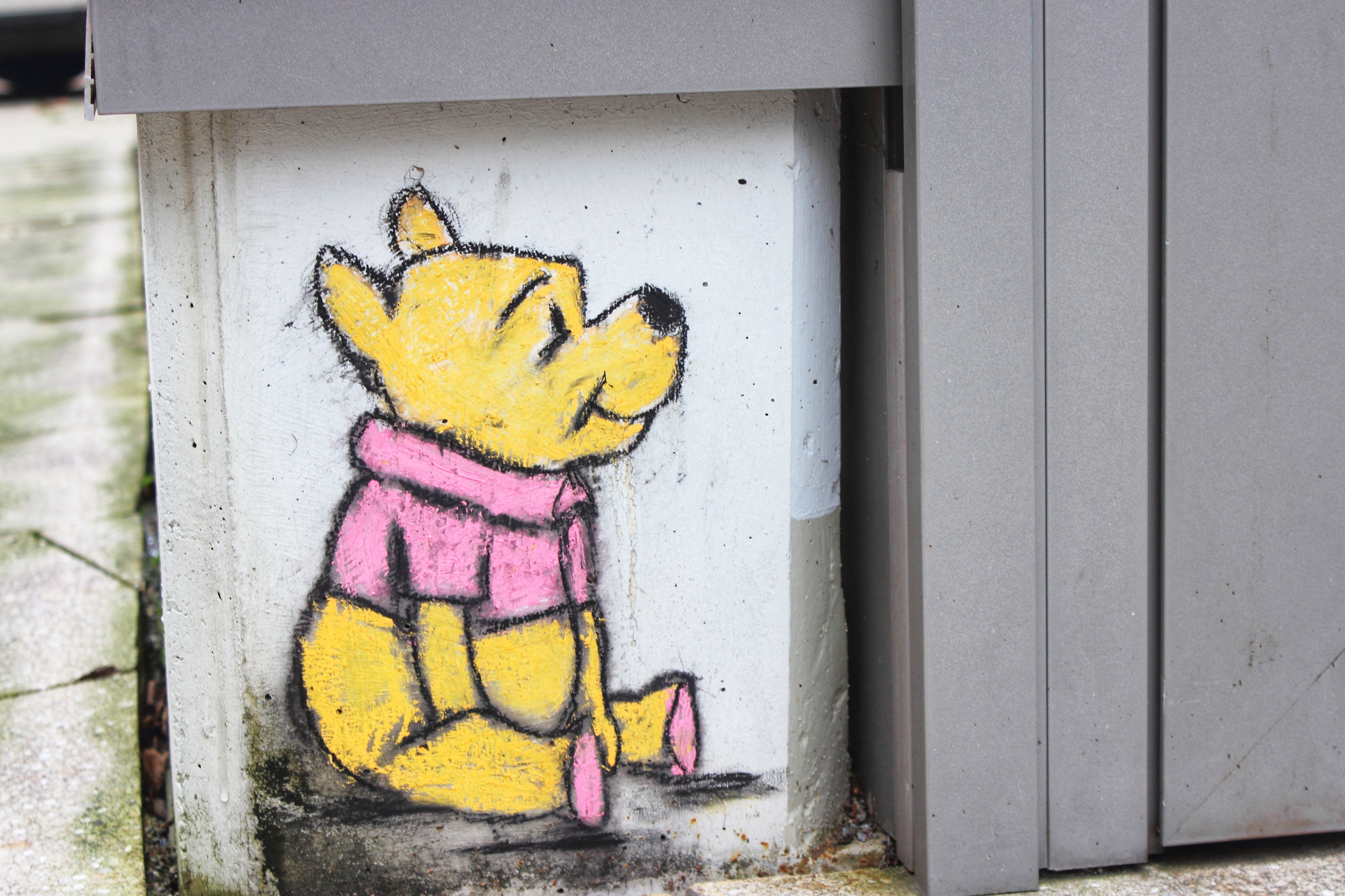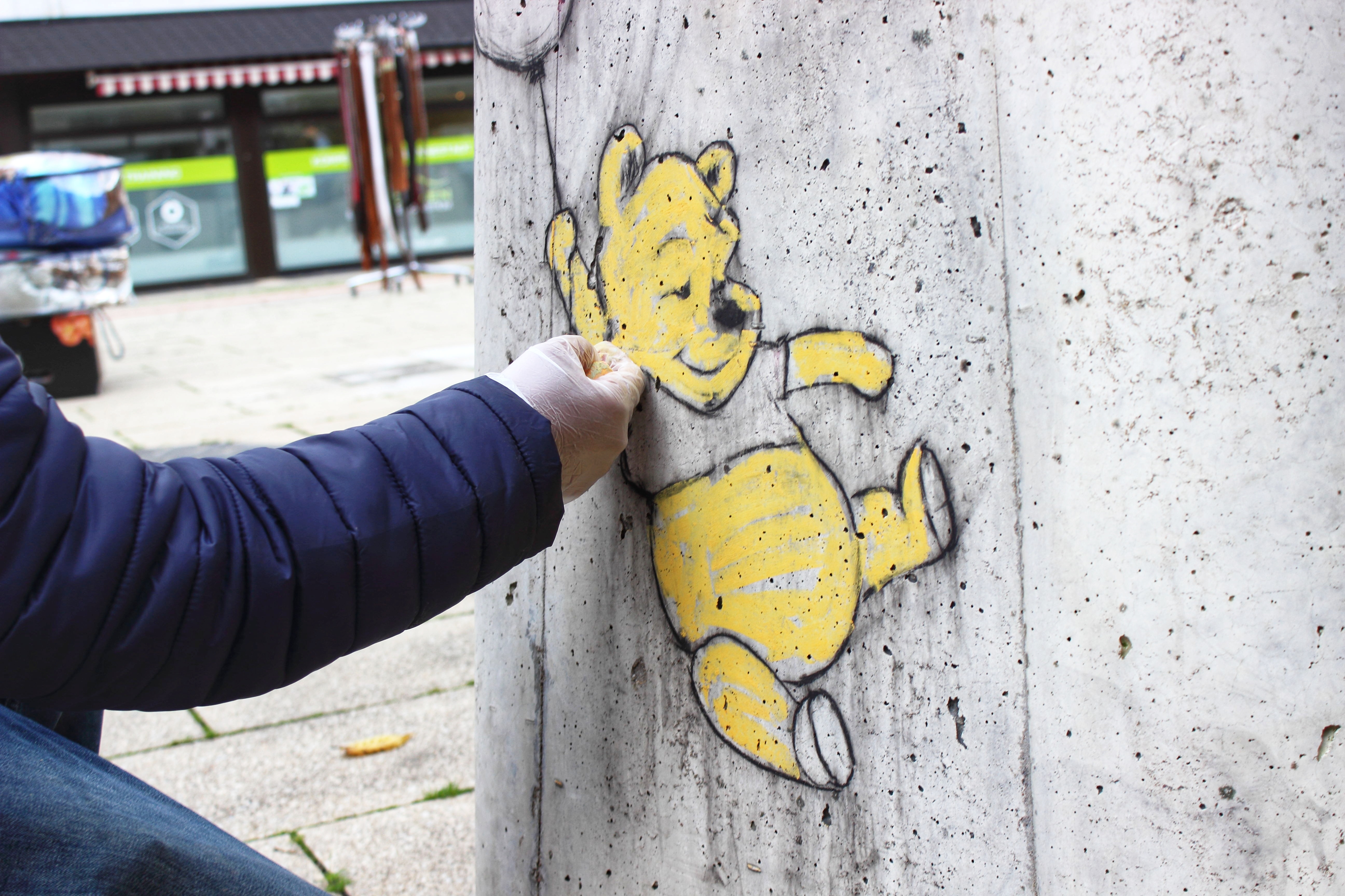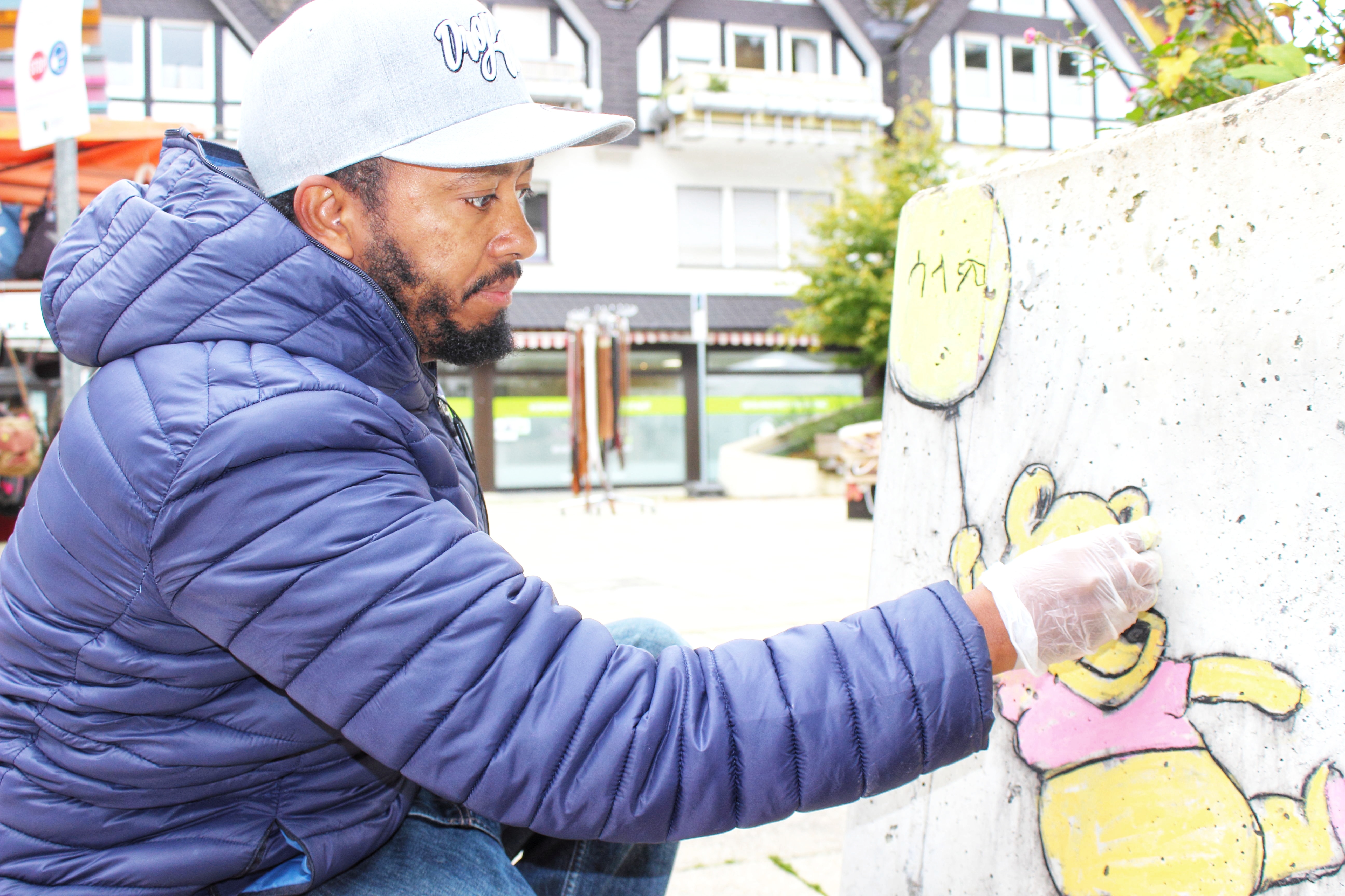 Eigentlich hätten die zauberhaften Kreidebilder ja schon völlig ausgereicht, um einen Blogpost zu schreiben… Tatsächlich sind sie aber nur die Spitze des Eisbergs; entstanden in der trüben Corona-Zeit sollen sie etwas Freude und auch Frieden, wie es in äthiopischen Buchstaben auf Winnie Puuhs Ballon steht, verbreiten. Sami Gebremariam kann aber noch viel mehr: Schon in seiner Heimat Äthiopien hatte er sein eigenes Atelier; aufgrund der politischen Lage musste er fliehen, sein Talent aber hat er mitgenommen.
