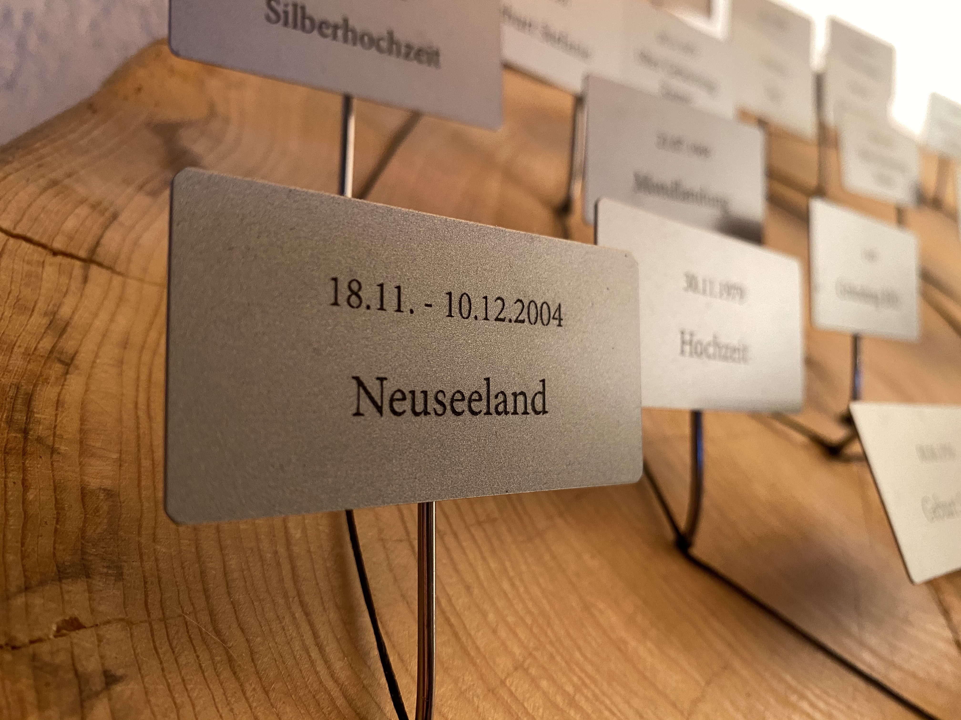 Doch nicht nur an Weihnachten, das ganze Jahr über gibt es Anlässe für individuelle Geschenke! Auch Matthias Loer wollte sich nicht mit einem 0815-Präsent begnügen, als seine Eltern vor ziemlich genau einem Jahr ihren 40. Hochzeitstag feierten. Kurzerhand organisierte er eine große Baumscheibe und dokumentierte anhand der Lebenslinien des Baumes das Leben seiner Eltern mit Meilensteinen.