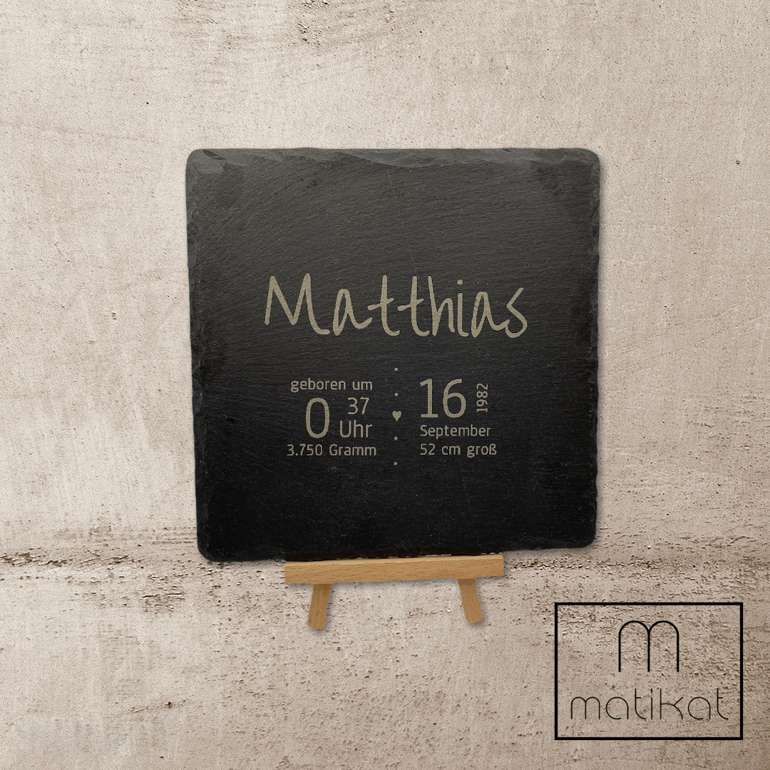 Doch nicht nur auf Metall, Holz und Leder kann er sich mit seinem Gravurlaser austoben; auch Schieferplatten eignen sich ganz wunderbar. So entstehen Geschenke zur Geburt oder zur Hochzeit – der Fantasie sind hier wirklich keine Grenzen gesetzt!