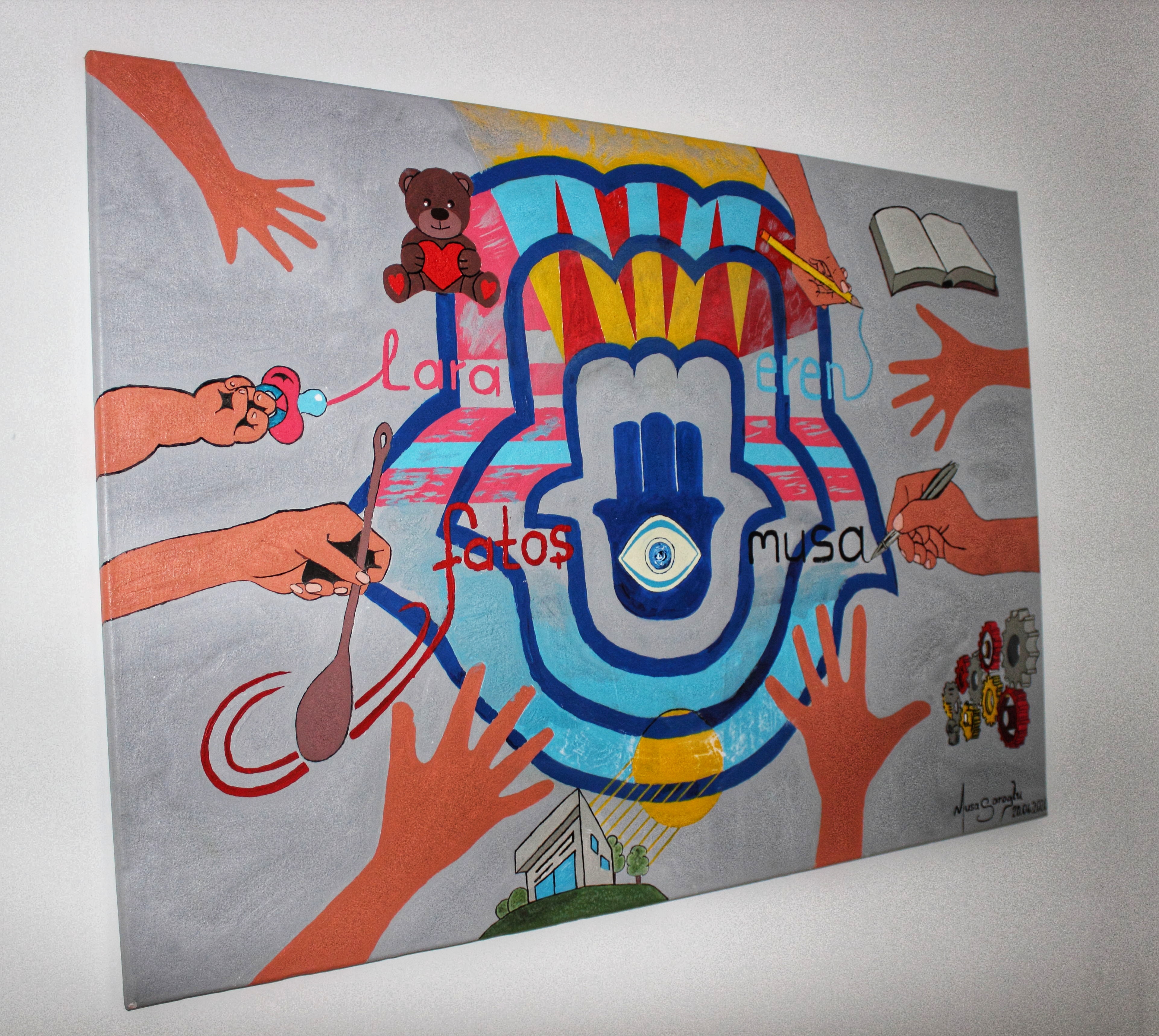 Das wichtigste Thema ist die Familie, und so ist auch das große Bild im Flur der Familie Saroglu gemeinsam entstanden: Jeder durfte den Umriss seiner Hand beitragen, Musa gestaltete den Rest mit den Vorlieben der einzelnen Familienmitglieder.