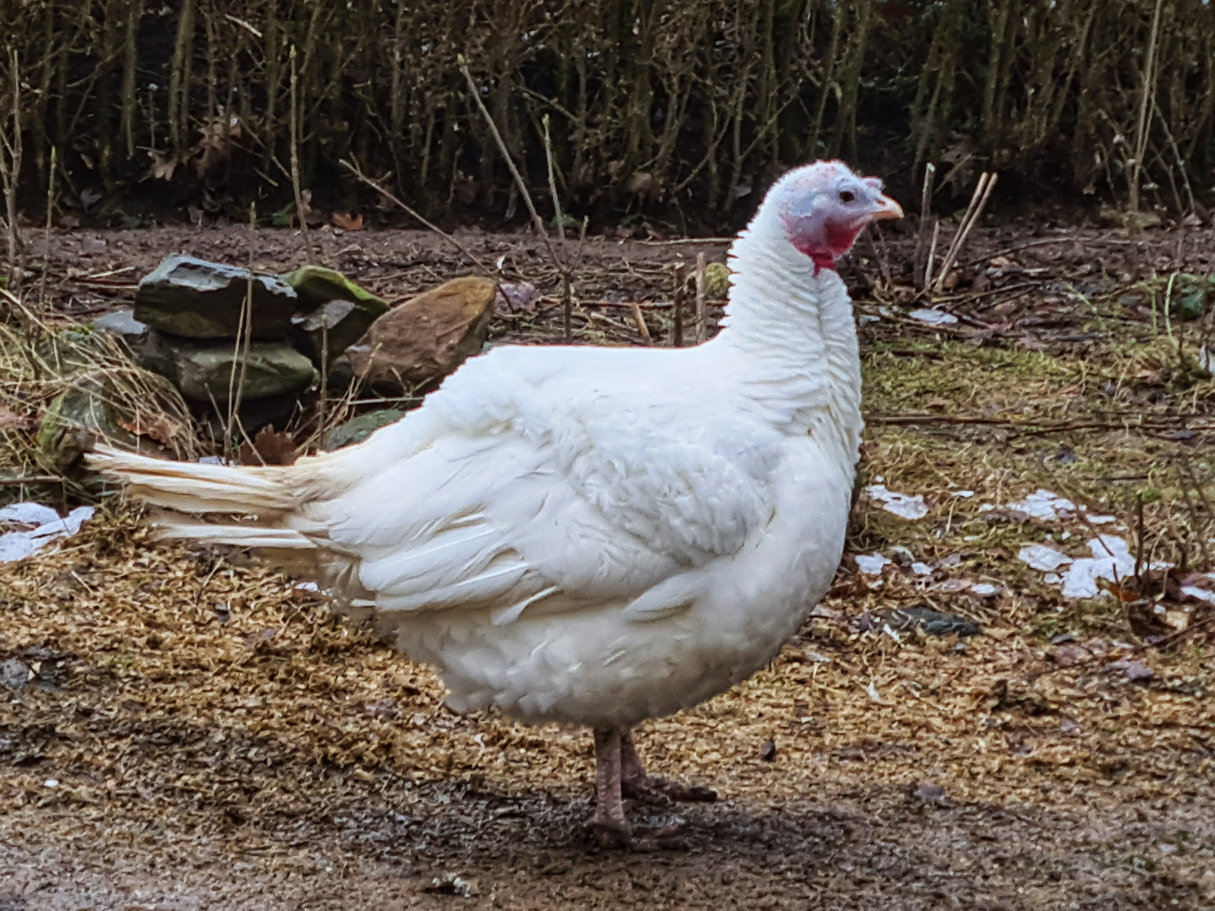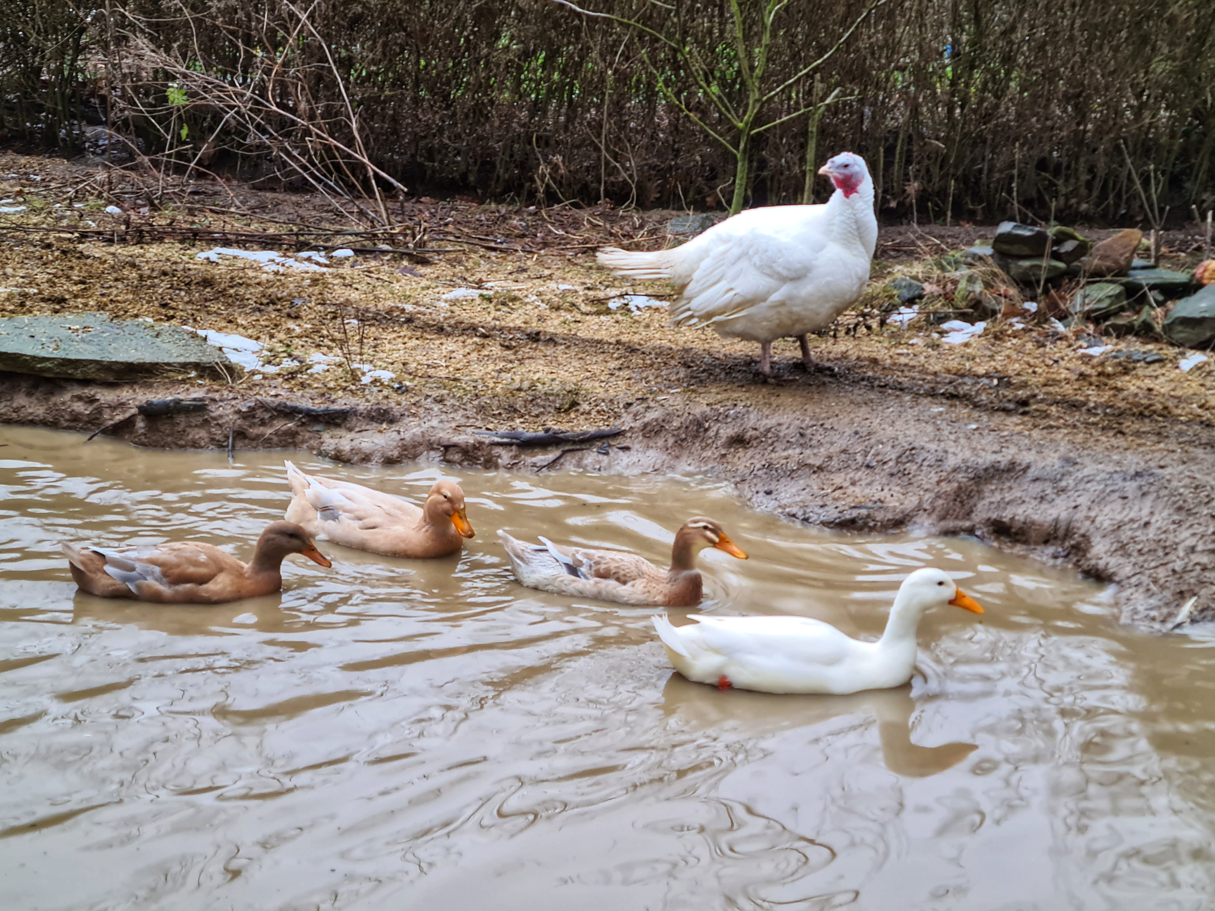 Das ist übrigens eine Pute, die hier auf die Enten aufpasst. Sehr zutraulich, was wohl an der liebevollen Haltung liegt, und irgendwie auch total schön, oder!? Normalerweise werden diese Tiere nicht älter als vier bis fünf Monate, lernen außer den Mastställen nichts Anderes kennen; auf dem Lebenshof dürfen sie den ganzen Tag völlig frei mit ihren WG-Freunden umherspazieren – und zwischendurch auch mal Pause machen. Tolle Tiere – von wegen dumme Pute…