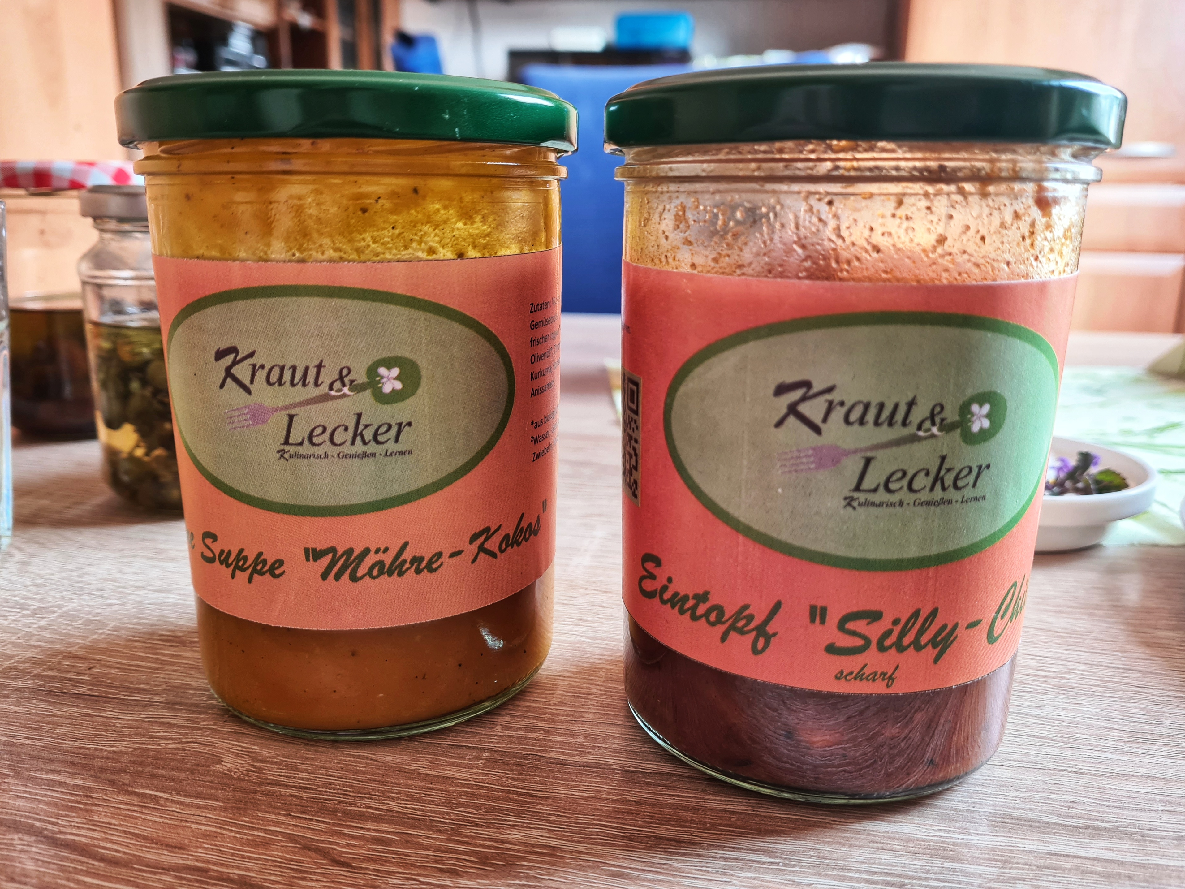 So, da solltest du für den Anfang erstmal gut beschäftigt sein! Bestimmt sind auch demnächst wieder Kräuterwanderungen mit Sylvia möglich – da bekommst du viele weitere Tipps… In der Zwischenzeit kannst du auch gern mal im Online-Shop von „Kraut & Lecker“ vorbeischauen: Die vegane und glutenfreie Möhre-Kokos-Suppe und den Eintopf „Silly-Chili“ hat Sylvia schon vorbereitet, ebenso Bärlauch- und Tannensalz für ein ganz besonderes Aroma. Und da die Natur immer wieder Neues zu bieten hat, wird es auch bei „Kraut & Lecker“ immer wieder etwas Neues geben. Guten Appetit!