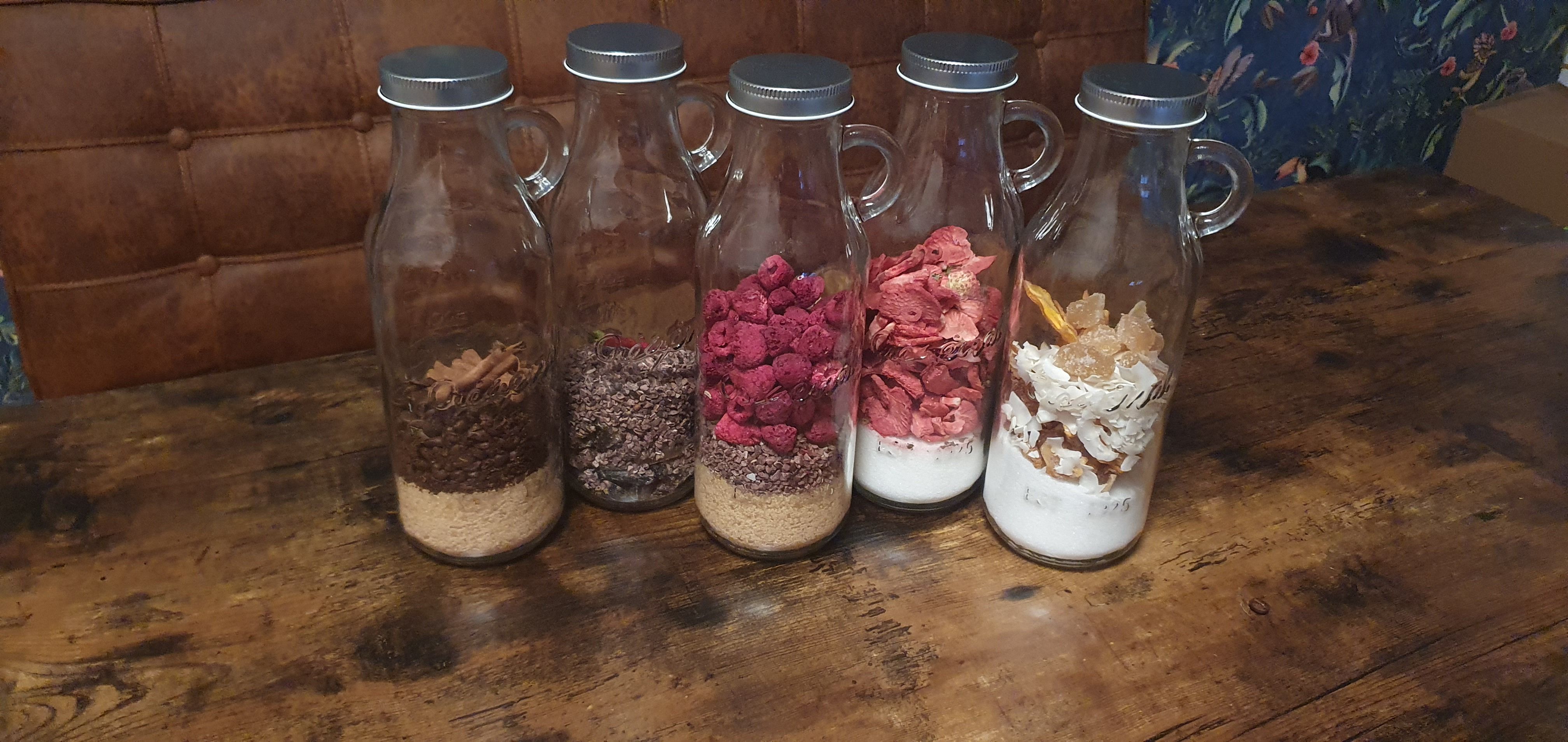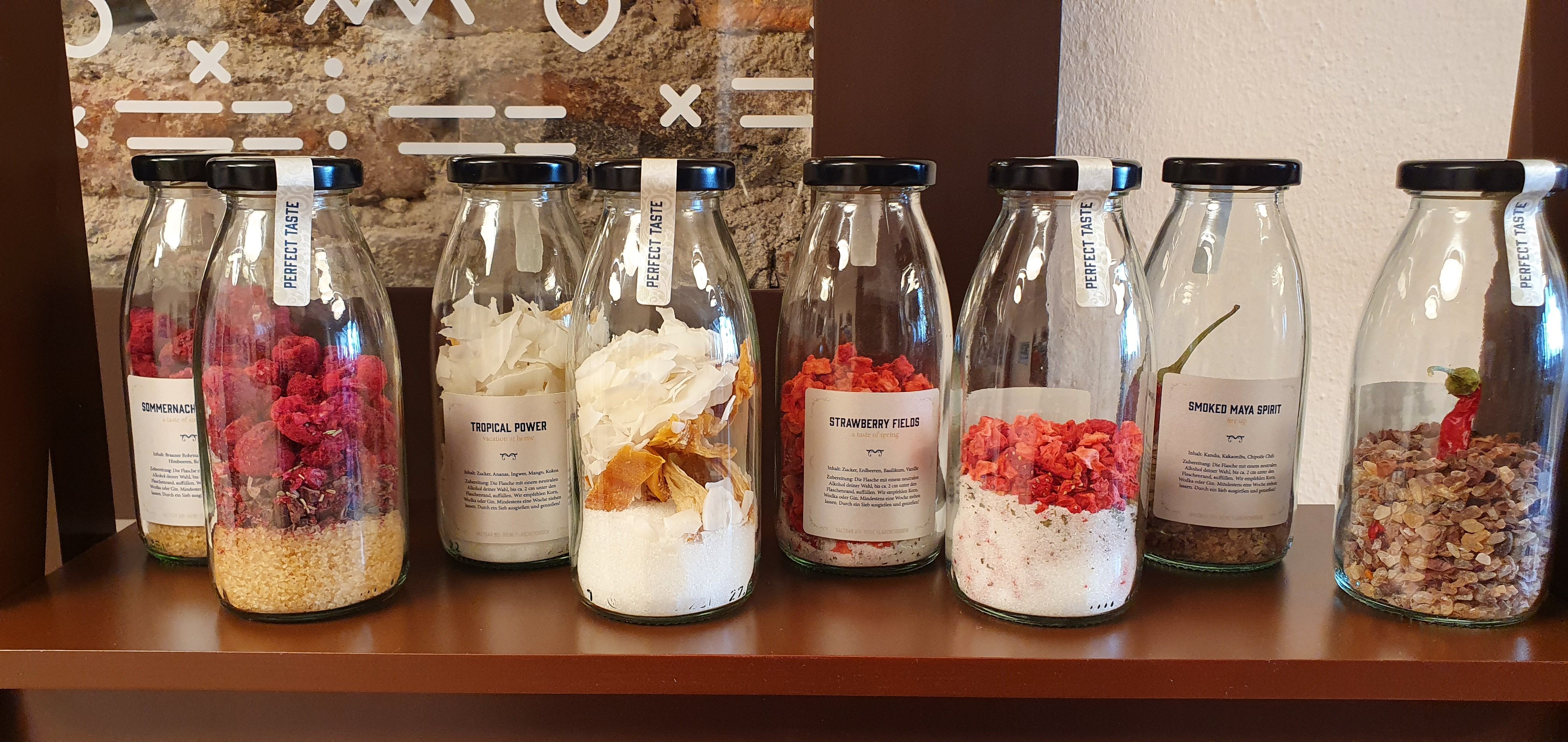 Zunächst gehen die Beiden mit fünf Sorten an den Start: „Coffeelicious“ mit braunem Rohrzucker, Kaffeebohnen, Zimt, Anis und Vanille, „Smoked Maya Spirit“ mit Kandis, Kakaonibs und Chipotle Chili, „Sommernachtstraum“ mit braunem Rohrzucker, Kakaonibs, Himbeeren und Rosmarin, „Strawberry Field“ mit Zucker, Erdbeeren, Basilikum und Vanille sowie „Tropical Power“ mit Zucker, Ananas, Ingwer, Mango und Kokos – für den Urlaub zuhause.