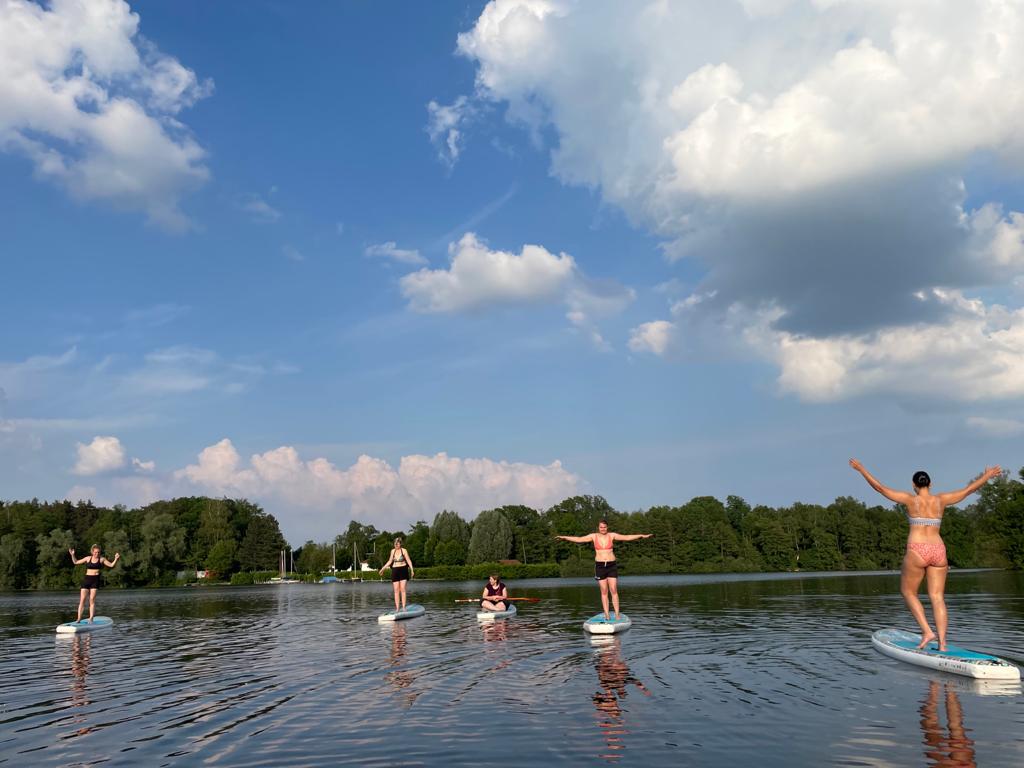 Du musst weder Erfahrung im SUP noch im Yoga haben; einzige Voraussetzung ist, dass du schwimmen kannst! Gemeinsam paddelt ihr in den hinteren Teil des Sees, sodass ihr auch wirklich eure Ruhe habt. Hier legt Lisa den Anker und macht die maximal acht Teilnehmerbretter mit einem Karabinerhaken an ihrem fest, sodass du dich voll und ganz auf die Übungen konzentrieren kannst.