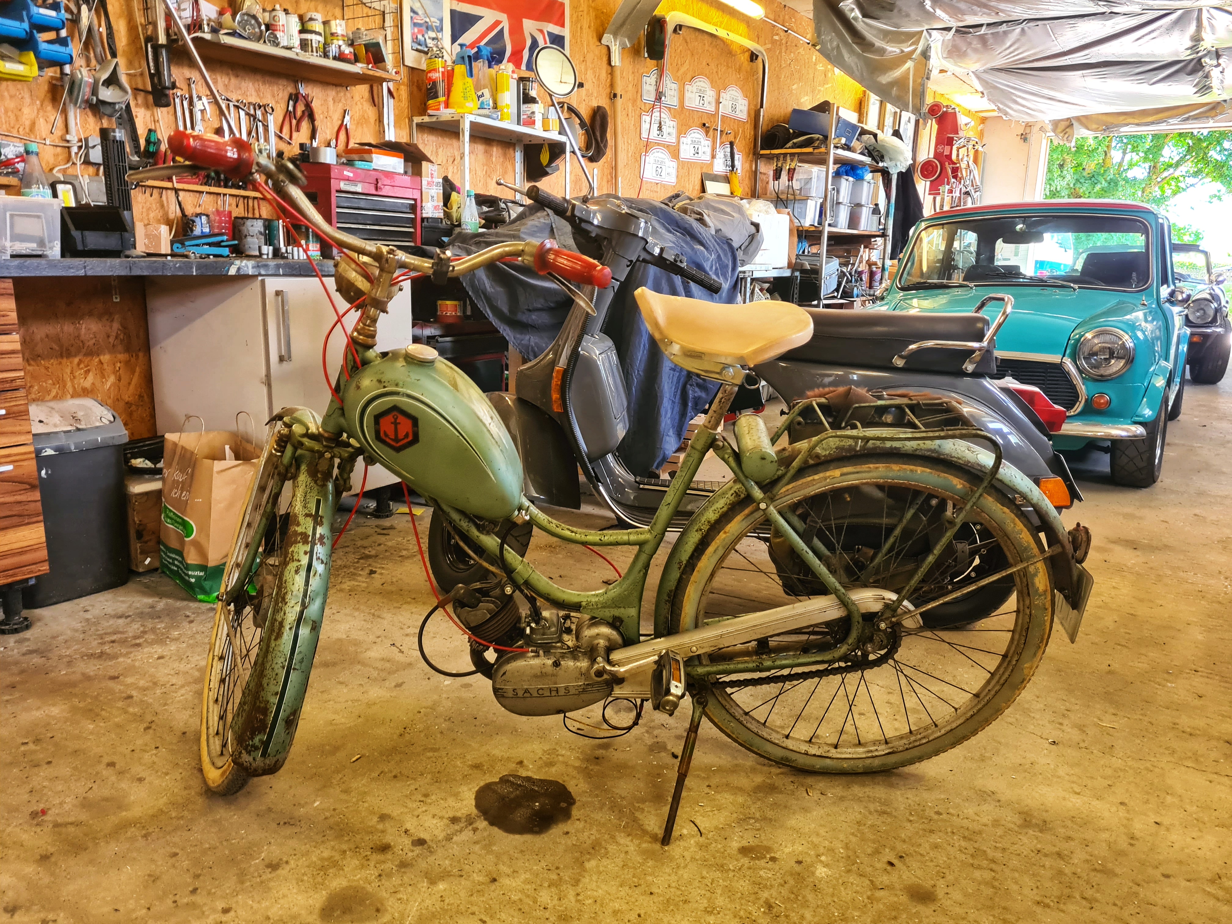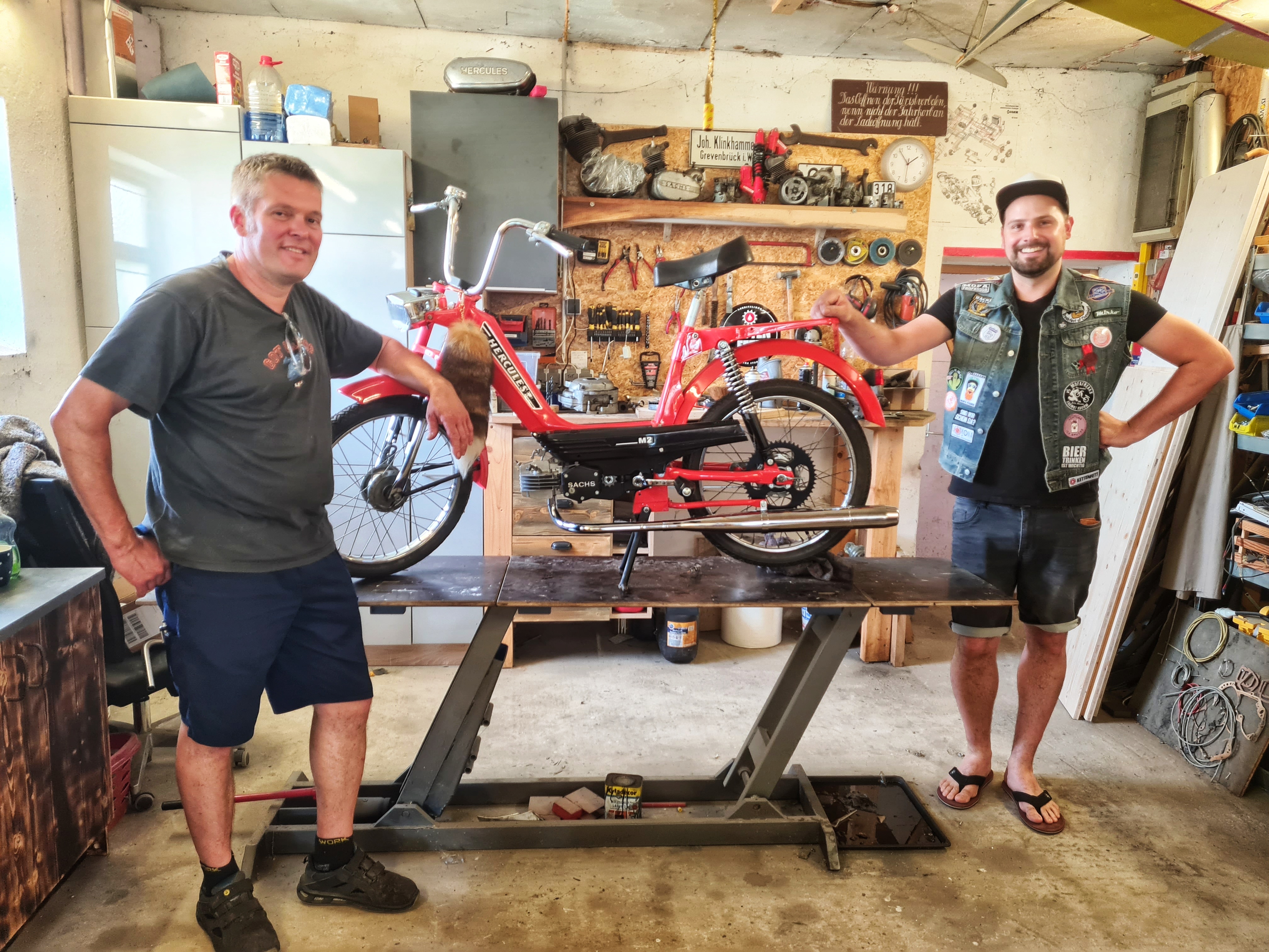 Wenn ein Mofa aus Altersgründen mal ein wenig schwächelt, ist die Bande auch hierfür gut aufgestellt: In einer Werkstatt in Sporke – in der übrigens auch noch andere Schätzchen auf vier Rädern stehen – wird fleißig geschraubt und getüftelt, bis der Patient wieder einsatzfähig ist.