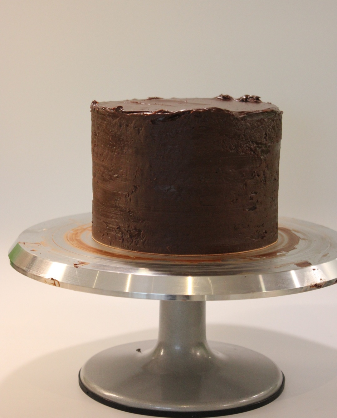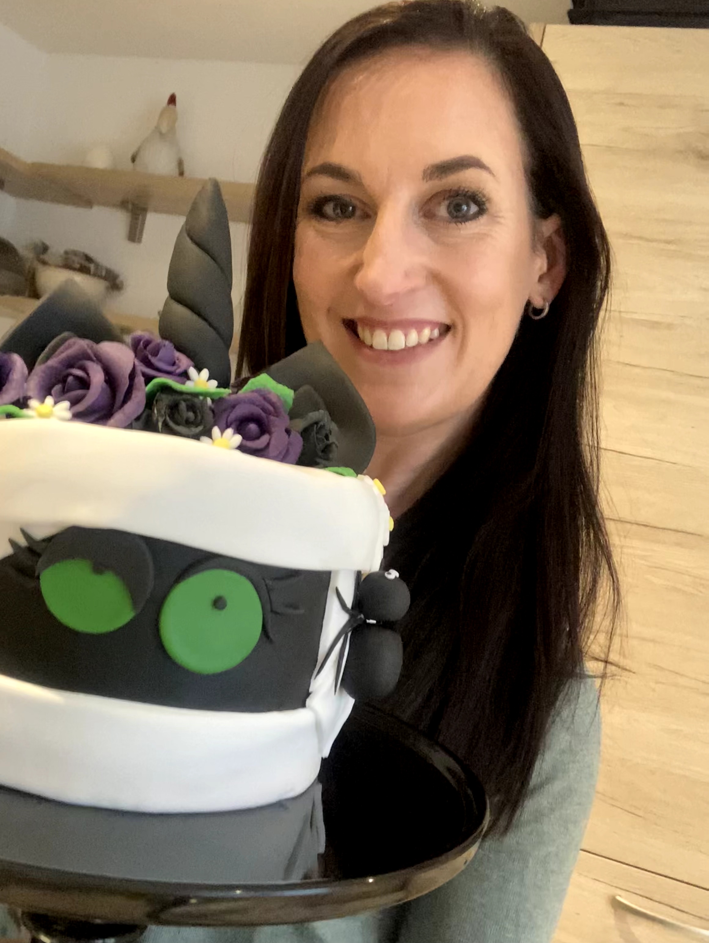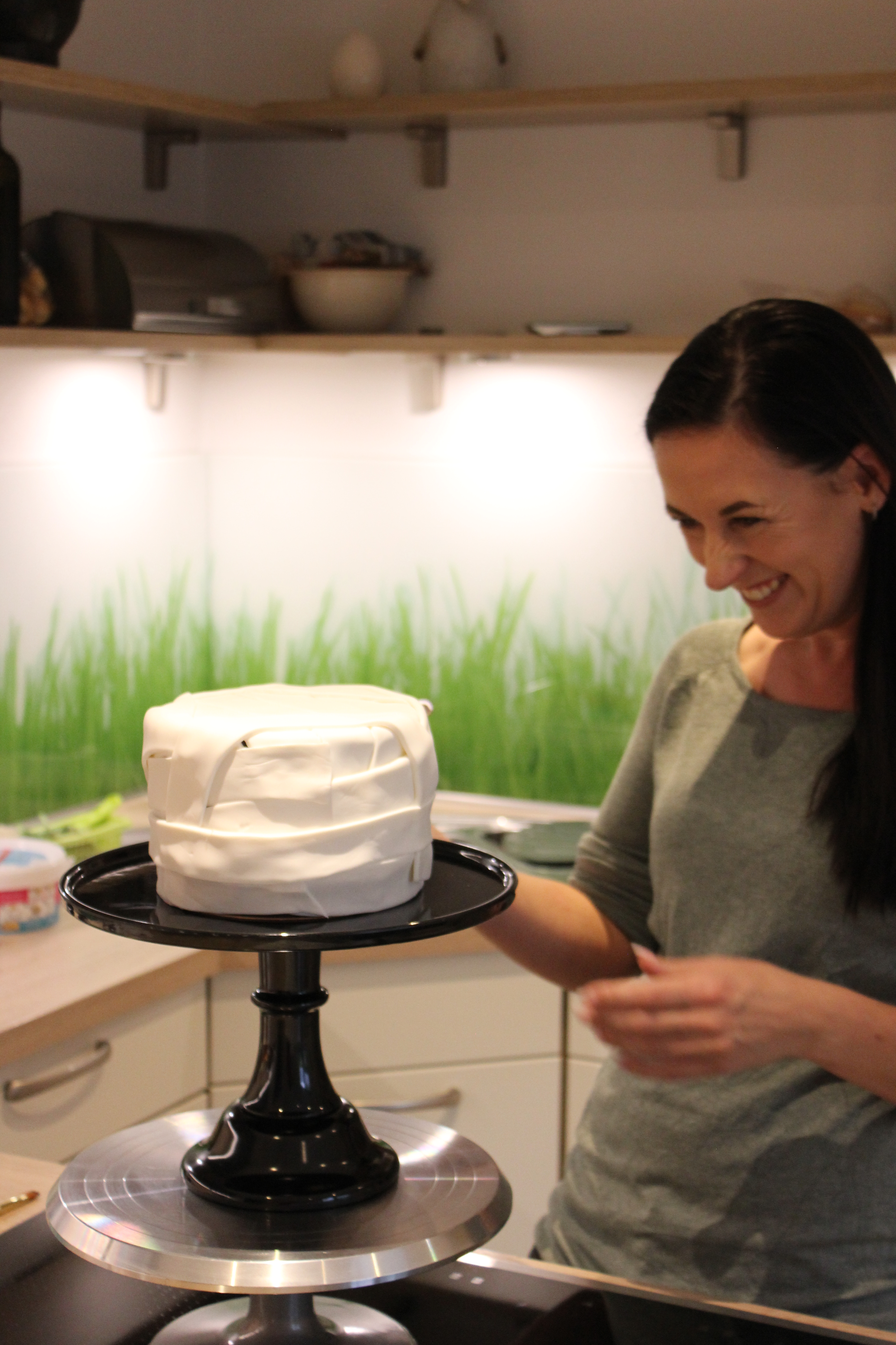Das Grundgerüst ist fertig, nun fehlt nur noch die äußere Erscheinung. Als erstes wird die Torte komplett mit Ganache eingekleidet, um sie für den Fondant vorzubereiten; dann ist erstmal wieder Pause, weil das Ganze weitere vier Stunden in den Kühlschrank muss, damit die Ganache sehr fest wird. Du kannst aber die Zeit auch schon nutzen, um aus Fondant die Dekoration für die Torte, also Blumen, Ohren, Horn, oder was auch immer du magst, vorzubereiten.