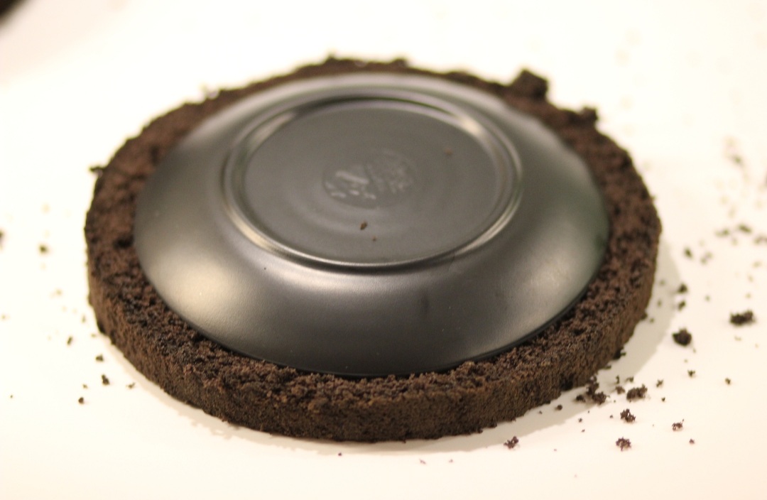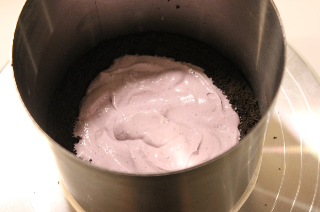 Nun geht´s auch schon an die Füllung der Torte; besonders schön ist es, wenn das Innenleben der äußeren Optik angepasst ist, wie hier der schwarze Boden und die violette Füllung! Du platzierst also den Tortenring auf einem Drehteller, nimmst einen Biscuit-Boden und legst ihn auf den Tortenring, dann nimmst du wieder einen Bisquit-Ring und legst ihn auf diesen Boden entlang des Tortenrings. In die Mitte gibst du die Creme, bevor du einen weiteren Boden auflegst. Das wiederholst du so lange, bis alle Böden und die Creme aufgebraucht ist!