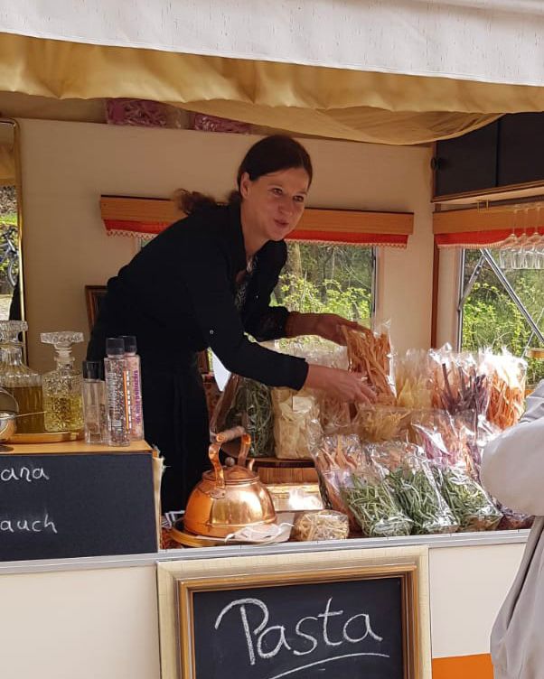 So wurde aus dem Nudelfahrrad irgendwann ein Wohnwagen im Vintage-Stil, der nicht nur auf Märkten, sondern auch auf Veranstaltungen richtig gut ankam; die manuelle Nudelpresse musste einer kleinen elektrischen Maschine weichen, bei Großbestellungen und anstehenden Veranstaltungen nutzt sie auch mal die große Küche in der „Kochbar Rönsahl“ – ansonsten ist Astrid Merschmann ihrer Idee treu geblieben: