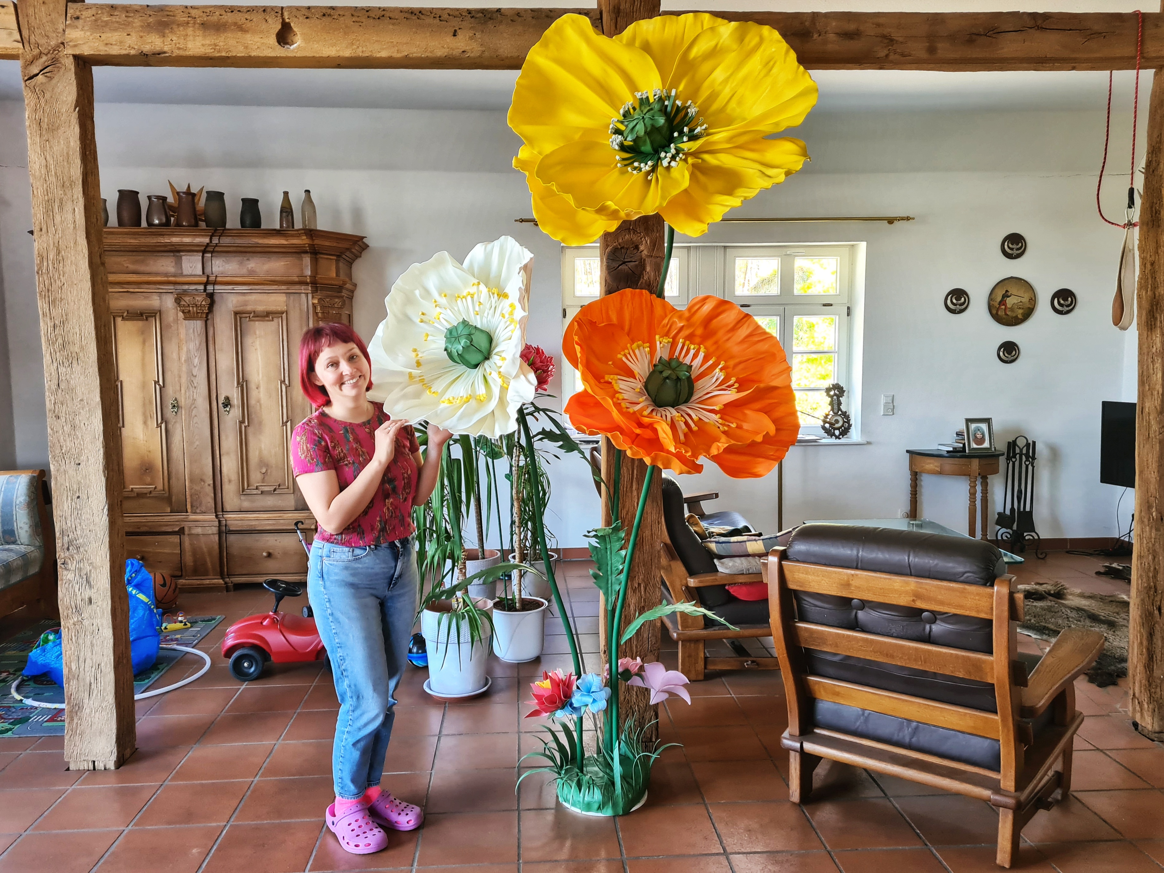 Sicherlich können die Messer und Ringe von „Stahl & Stein“ ebenfalls als Kunstwerke bezeichnet werden: Jan Düllmann aus Meschede fertigt in seiner Schmiede Unikate aus Damaststahl, die nicht nur toll aussehen, sondern auch für die Ewigkeit gemacht sind… Auch die „Grossen Blumen“ von Polina Schütz aus Arnsberg halten deutlich länger als der klassische Blumenstrauß: Aus Moosgummi und Krepppapier in liebevoller Handarbeit gefertigt sind sie ein schönes Geschenk – nicht nur zum Muttertag! Langlebigkeit – das Stichwort für Andi Kemper aus Brilon: Er schenkt besonderen Flaschen ein zweites Leben, indem er sie zum Leuchten bringt…
