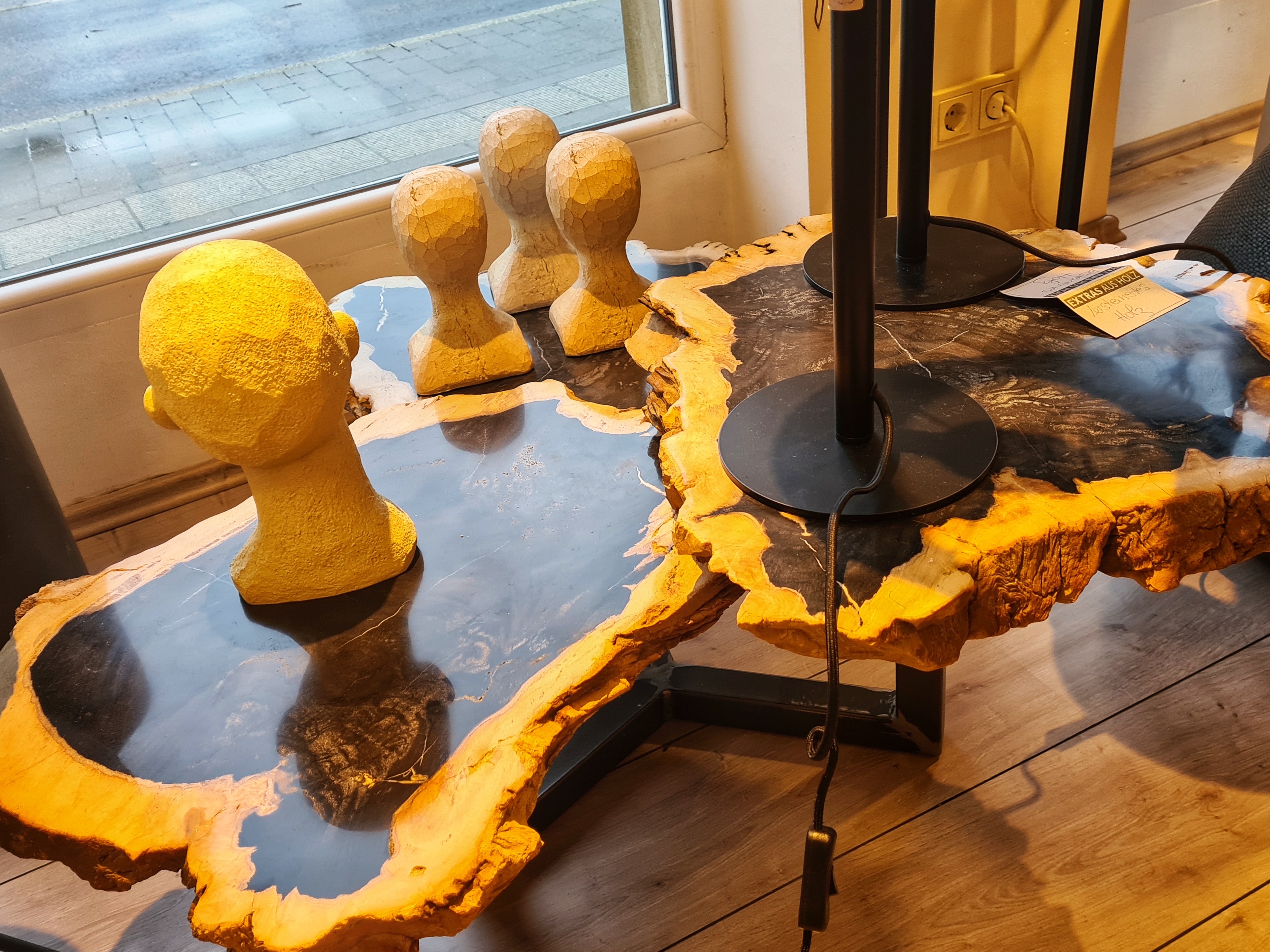 Ob einzelne Balken, die in der Werkstatt miteinander verleimt werden, ganze Wurzeln oder große Platten, die am Stück weiterverarbeitet werden – die Form des jeweiligen Holzstückes gibt vor, was am Ende daraus wird. So entstehen runde oder viereckige Tische, Stelen, Lampen, Garderoben, Hocker und vieles mehr!