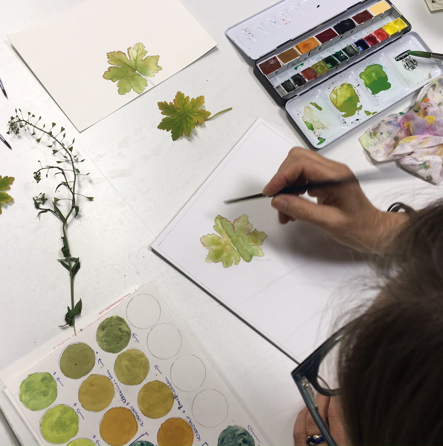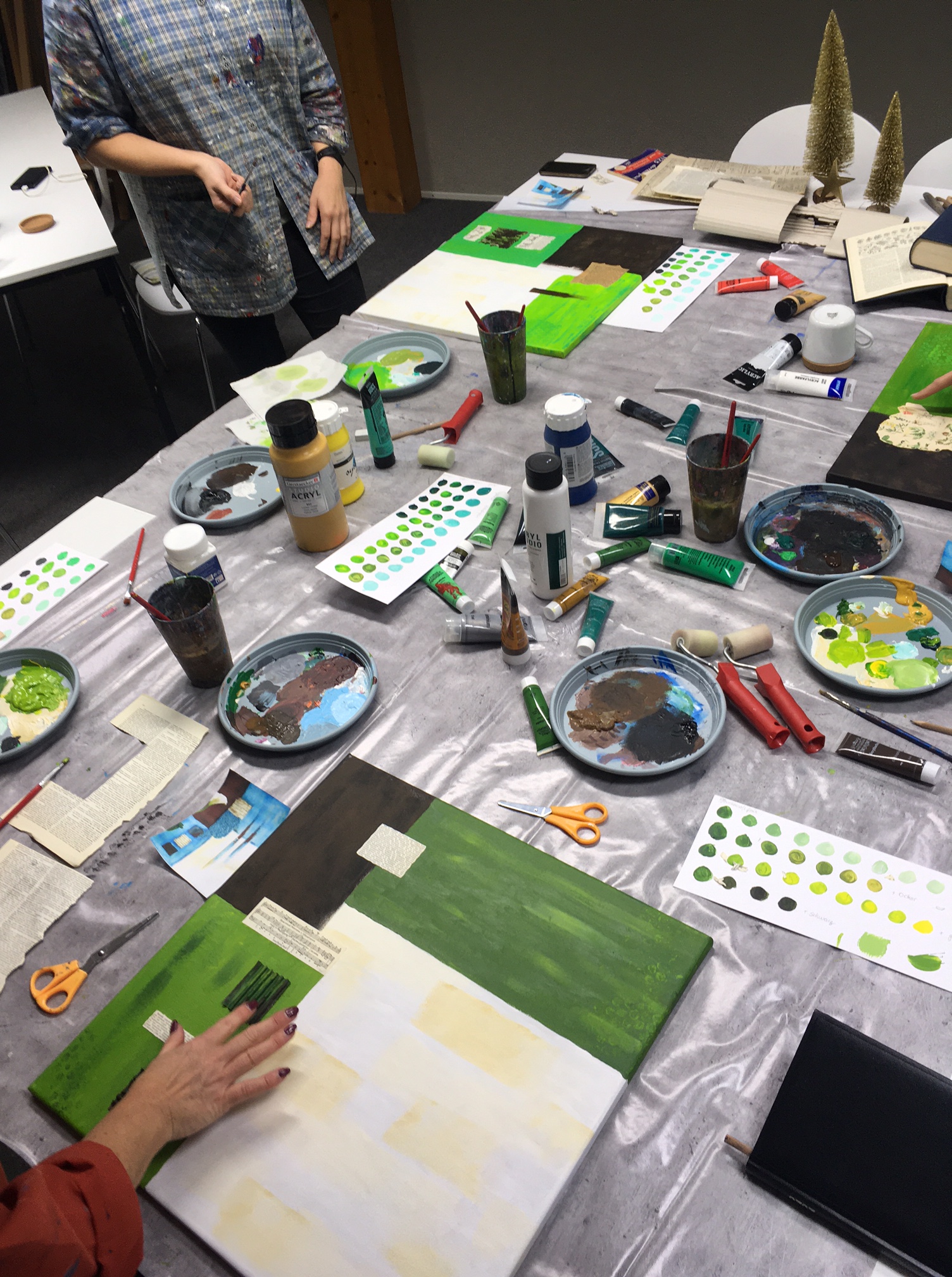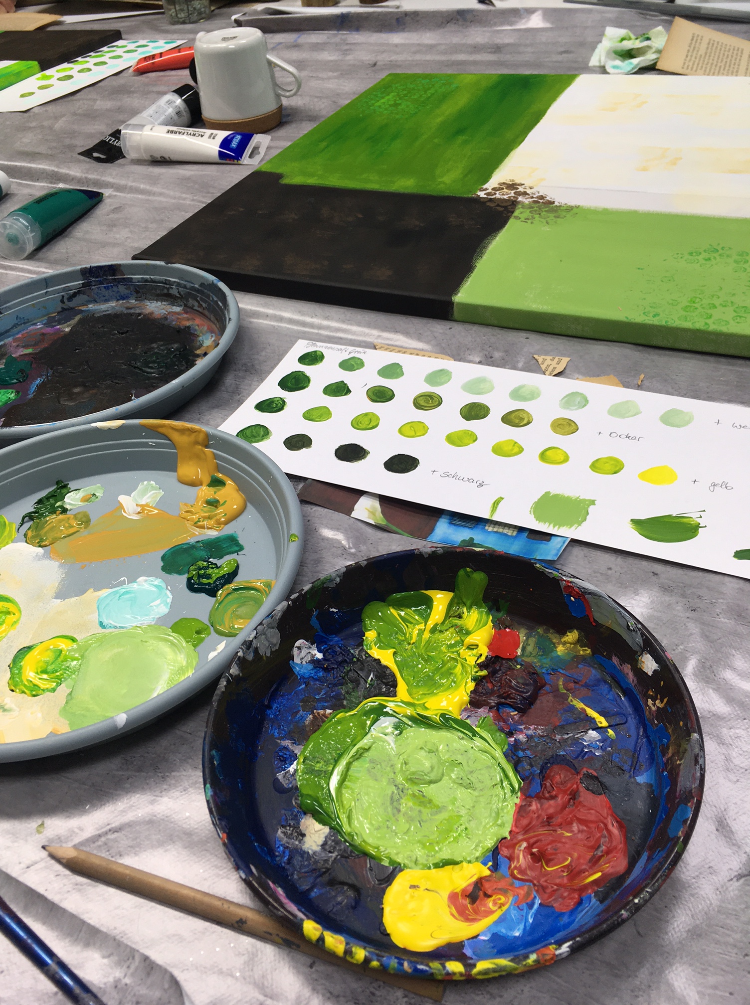 Jeder Kurs beginnt mit einer kleinen Materialkunde: Wie pflegst und transportierst du die Pinsel richtig, wie setzen sich Bleistifte zusammen, wie kannst du Acryl, Kreide, Aquarellfarben und Stifte passend einsetzen? Auch in der Farbenlehre werden die Grundlagen gelegt – du wirst staunen, wenn sich aus vier Tuben Farbe plötzlich über 100 Grüntöne mischen lassen! Am besten, du notierst dir die genaue Zusammensetzung; das erleichtert das Nachmischen, wenn dir dein Wunschton mitten im Bild ausgeht…