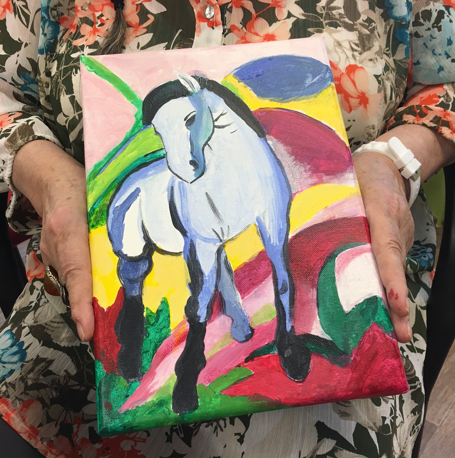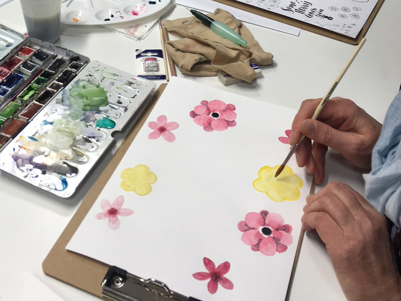 Auch in Seniorenheimen ist die Künstlerin regelmäßig mit ihren Malkursen unterwegs. Häufig stellt sie dabei fest, dass gewisse Hemmungen bestehen und keine guten Erfahrungen mit dem Kunstunterricht gemacht wurden; auch wenn der schon soooo lange her ist… Doch umso größer ist die Freude dann, wenn die Kursteilnehmer zu schönen Ergebnissen kommen, sie stolz ihren Verwandten präsentieren oder eine kleine Ausstellung im Foyer der jeweiligen Einrichtung veranstaltet wird. Während der Kurse wird gesungen, geredet und gelacht – Malen verbindet, egal ob jung oder alt!