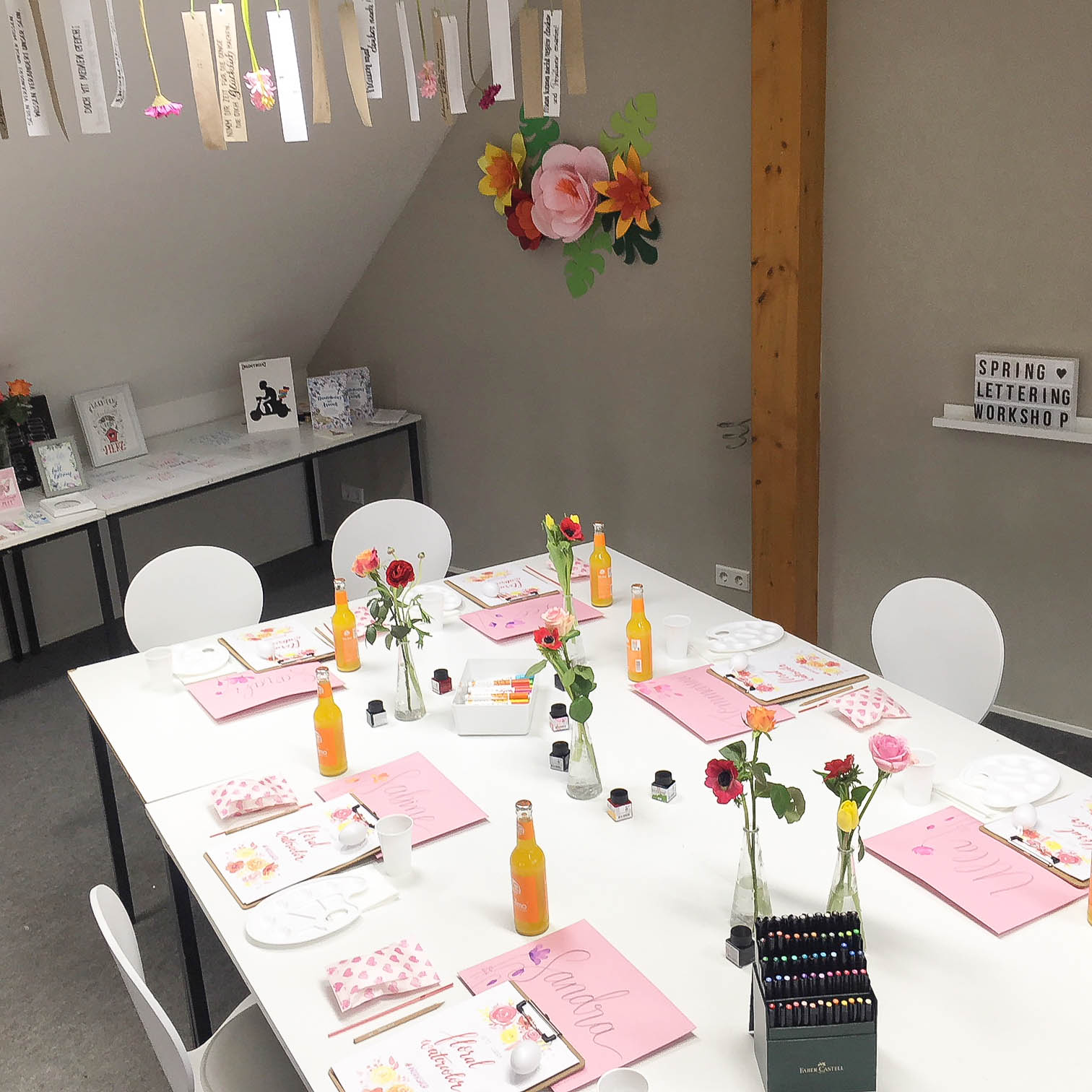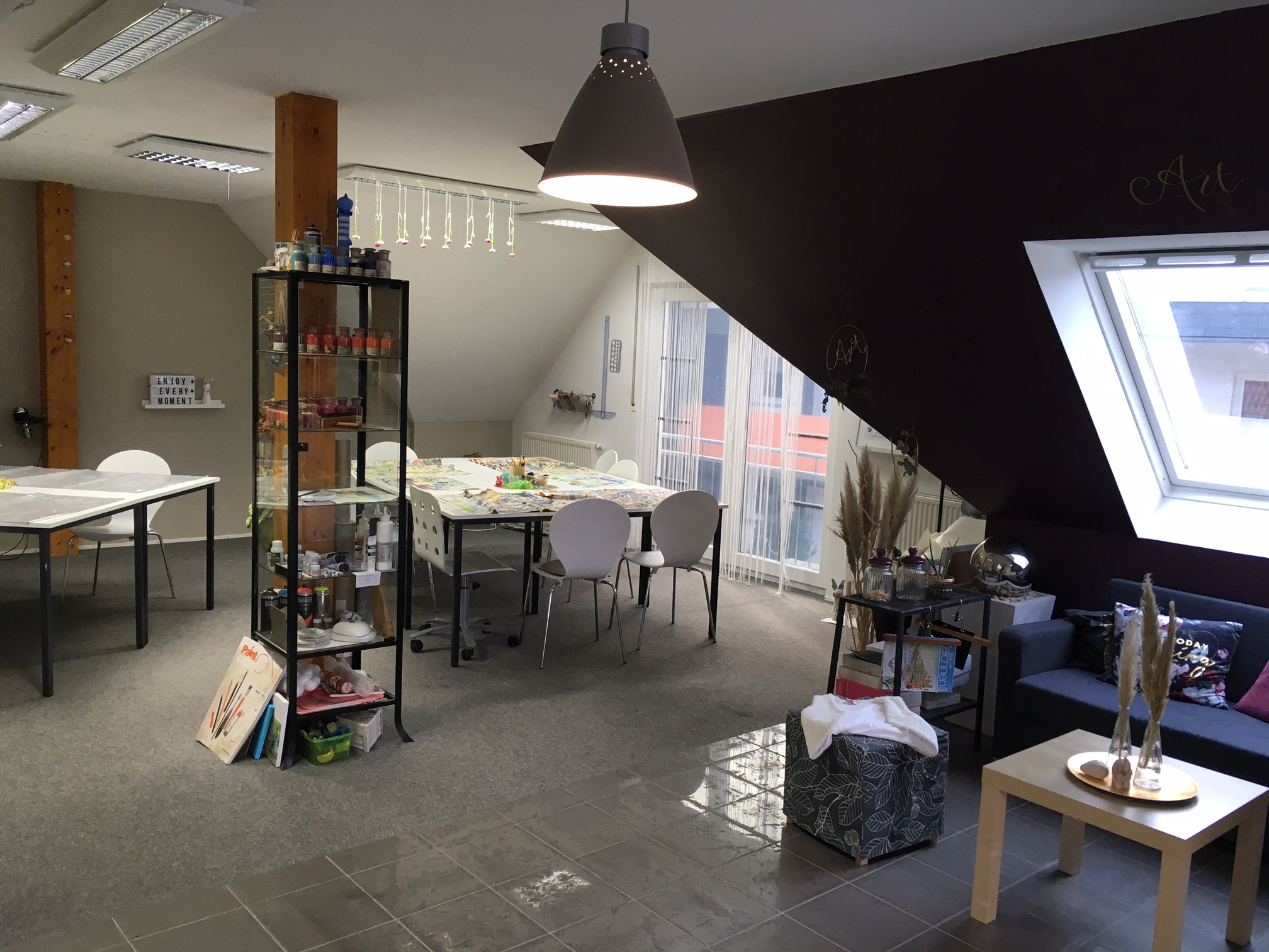Schon beim ersten Betreten war Claudia begeistert: So viel Licht, so viel Platz, so viel Offenheit und Wärme – noch bis heute hat die Künstlerin das Gefühl, dass dieser Raum sie gefunden hat und nicht umgekehrt. Eine eigene Küche mit riesiger Tee-Schublade, ein kleines Badezimmer und eine Lounge-Ecke mit gemütlichem Sofa – all das führt dazu, dass sich nicht nur Claudia, sondern auch ihre Malschüler hier pudelwohl fühlen! Und auch der derzeit so wichtige Abstand kann gewährleistet werden, so dass du dich bedenkenlos mal bei den Malkursen umschauen kannst: