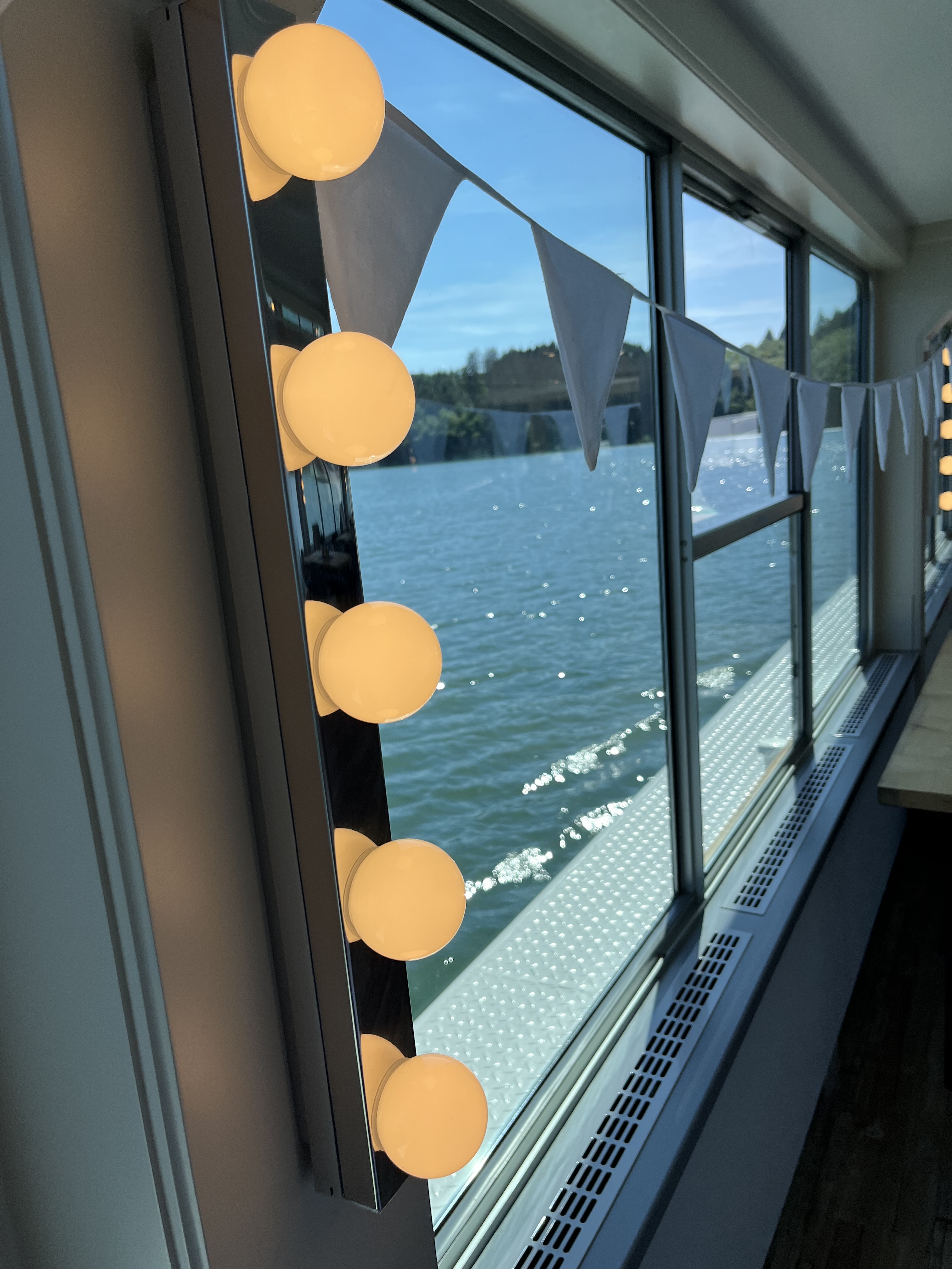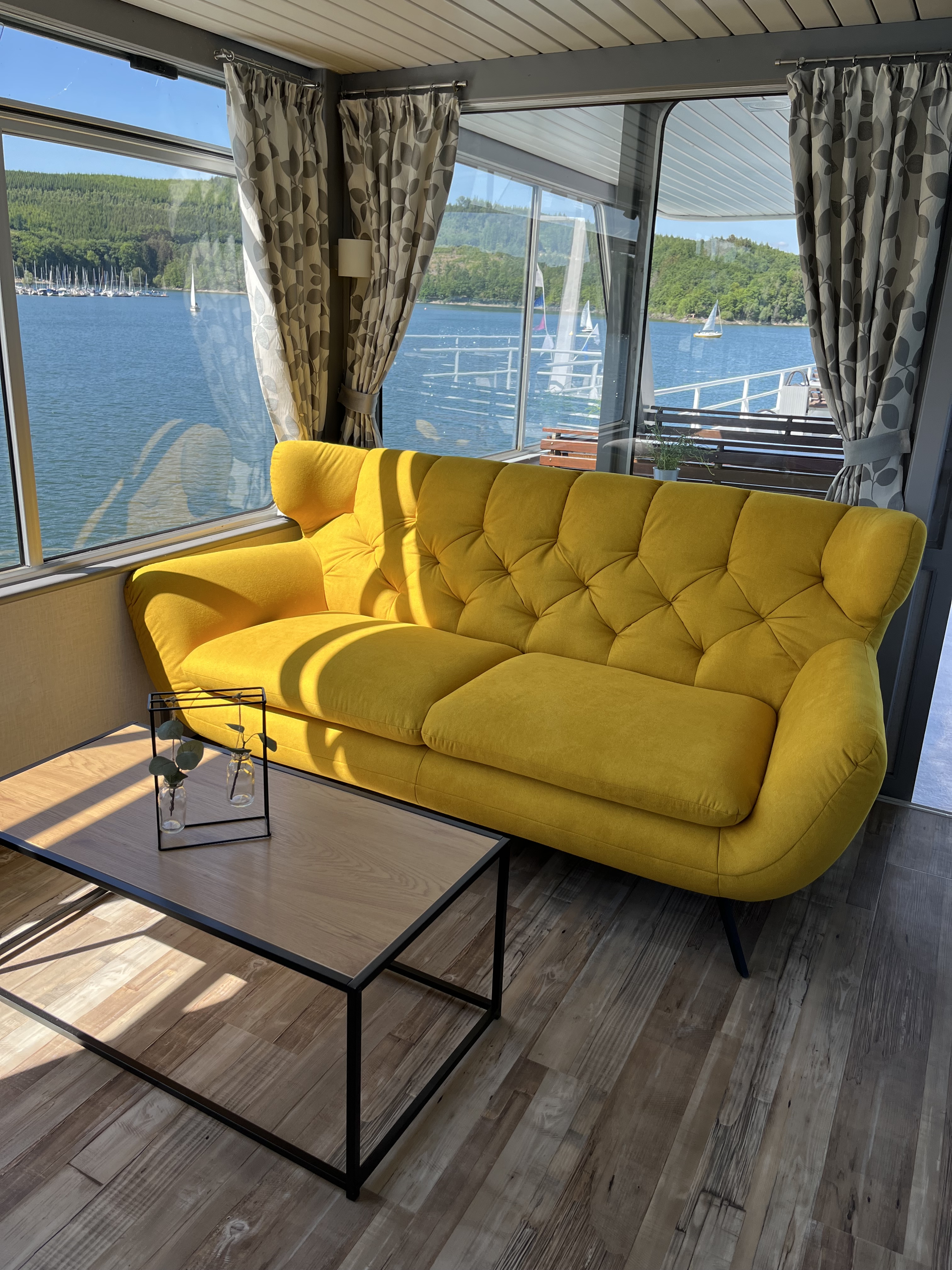 Alle festen Bänke und die in Jahre gekommenen Plastiktische mussten weichen und einer modernen, luftigen Einrichtung mit bodentiefen Fenstern und Sitzsäcken in der Chill-Area Platz machen. Für die Strandbar wurden eine Tonne Sand, Liegestühle und Sonnenschirme auf das Deck gebracht – schon echt etwas Besonderes, oder hast du anderswo schon einmal einen schwimmenden Strand gesehen? Das eigentliche Highlight ist aber sicherlich das Trauzimmer auf dem dritten Deck: Hier können sich die Gäste ganz gemütlich in fette Sofas fläzen und die feierliche Stimmung auf ganz unkonventionelle Art genießen; anschließend geht es nur eine Treppe nach unten, und schon darf ordentlich gefeiert werden!