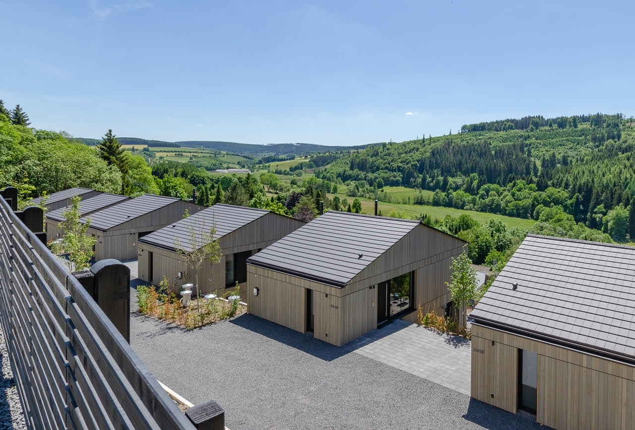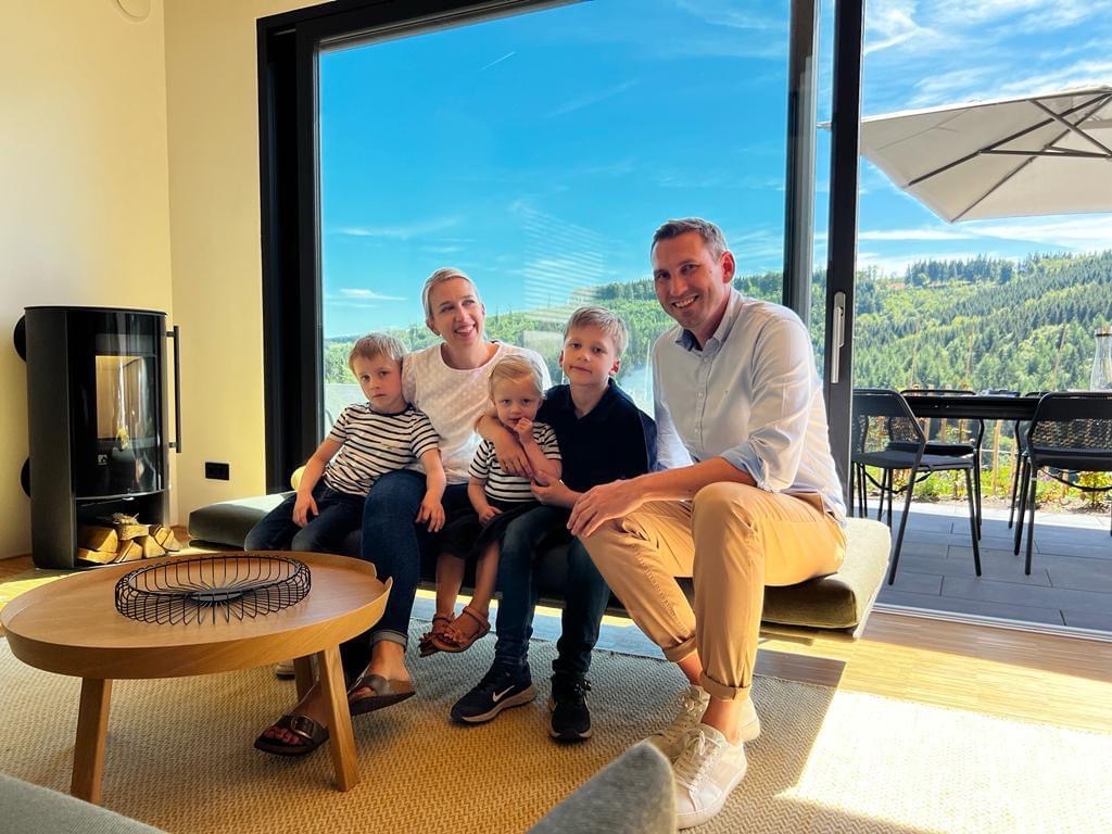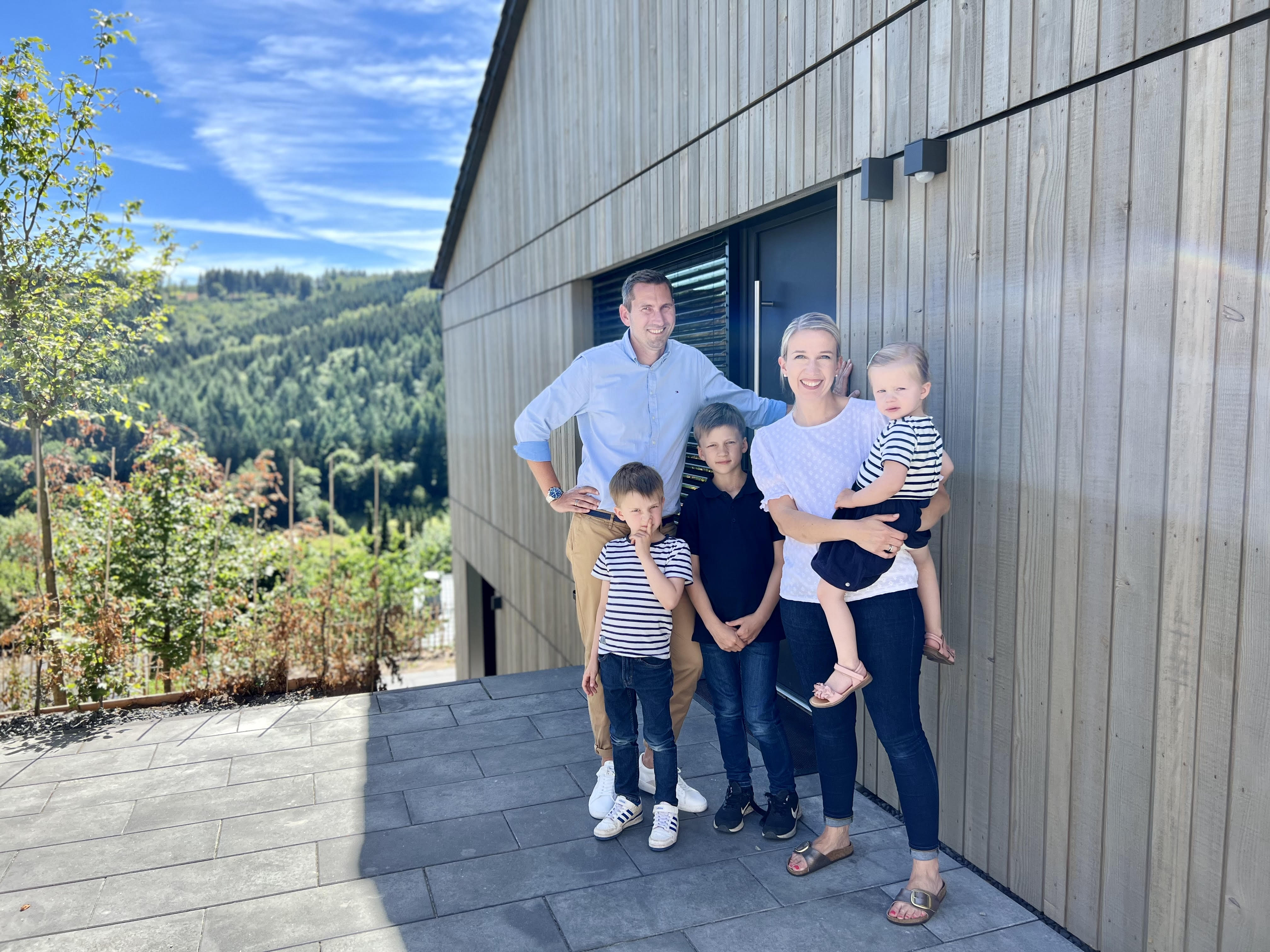 Und so machte er sich – inzwischen selbst Vater von drei Kindern – vor einiger Zeit auf die Suche nach einem geeigneten Platz, um ein Ferienhaus zu bauen, ein Refugium für die Familie, ein Rückzugsort mitten in der Natur. Das Potential des Hanggrundstücks im Niedersfelder „Heidedorf“ erkannte der selbstständige Architekt direkt, auch mit großen Projekten hatte er Erfahrung, und als er dann auch noch seine Frau Juliana überzeugen konnte, war die Entscheidung gefallen: Hier sollte nicht nur ein Urlaubsdomizil für die eigene Familie entstehen, sondern die „Sauerland Lodge“ mit sechs fast baugleichen Ferienhäusern.