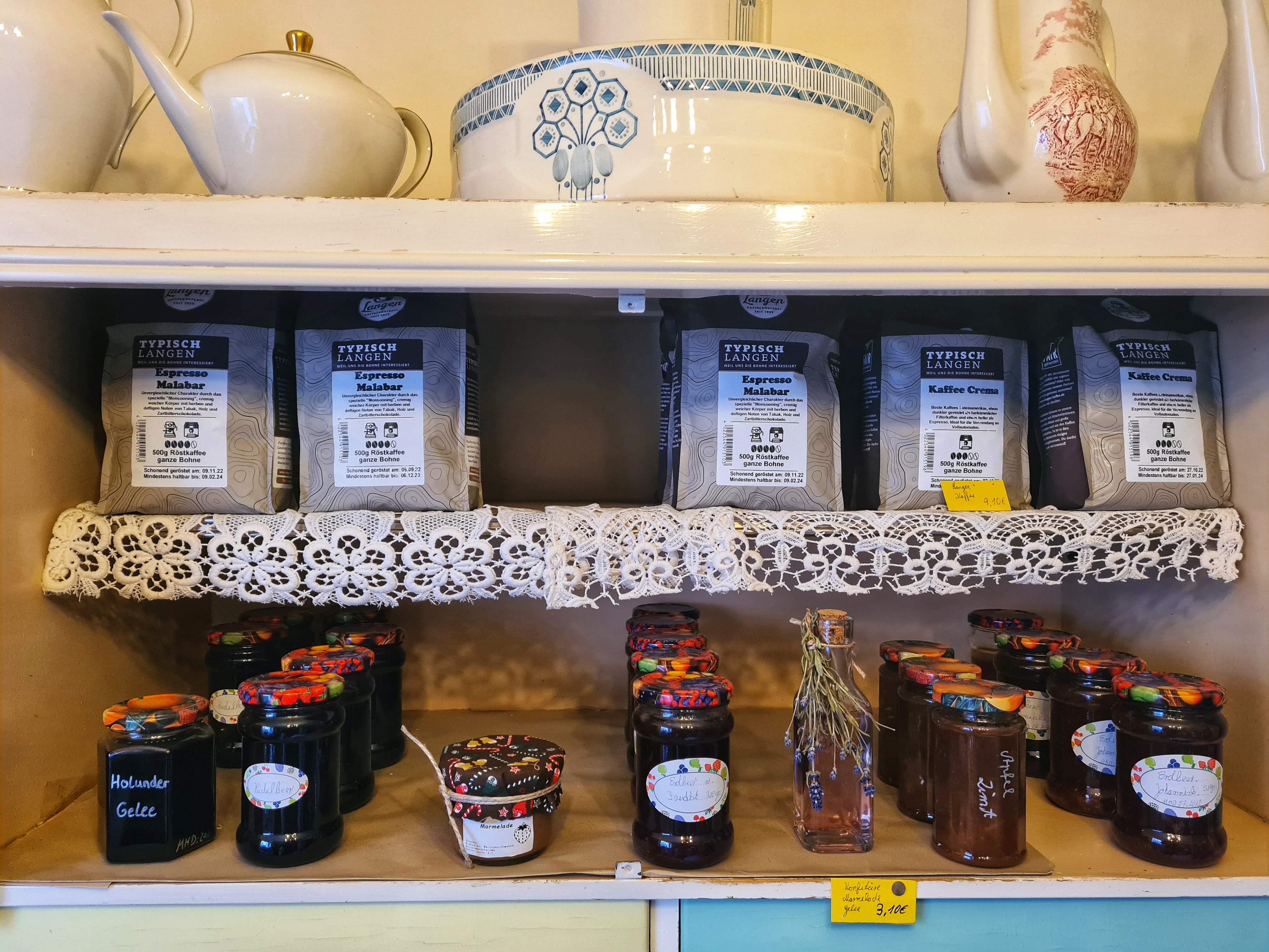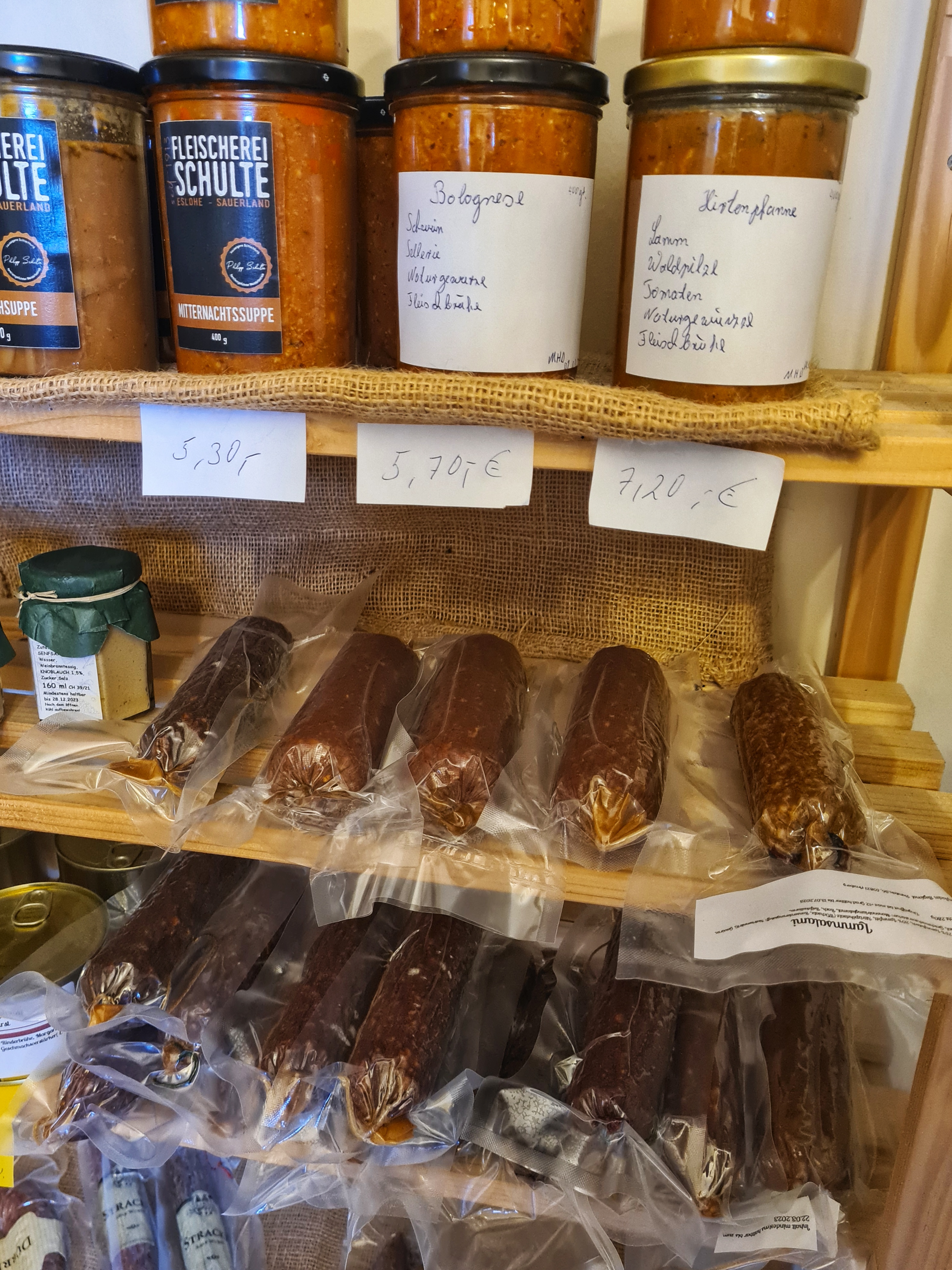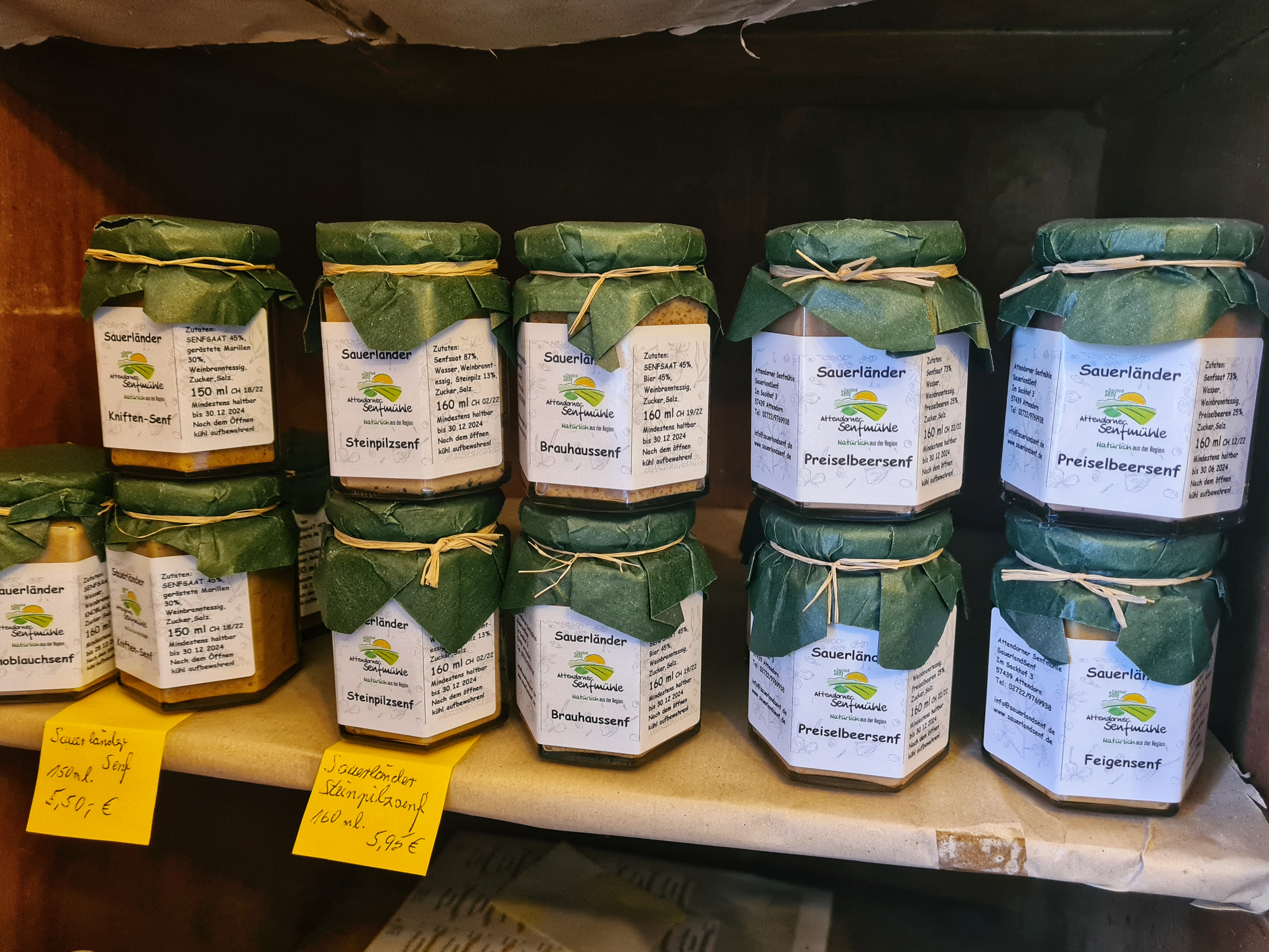 Auch der angebotene Honig und die Marmelade ist aus eigener Produktion; außerdem bieten Frederik und Ulrich Lörwald noch weitere Spezialitäten aus der Umgebung an: Kaffee von der Rösterei „Langen“ in Medebach – den du übrigens auch im Café serviert bekommst –, Senf von der „Senfmühle Attendorn“, verschiedene „Abteiwaren“ vom Klosterberg in Meschede, veredeltes Wild und vieles mehr… Schau dich einfach mal in Ruhe um – regionaler einkaufen kannst du nicht!