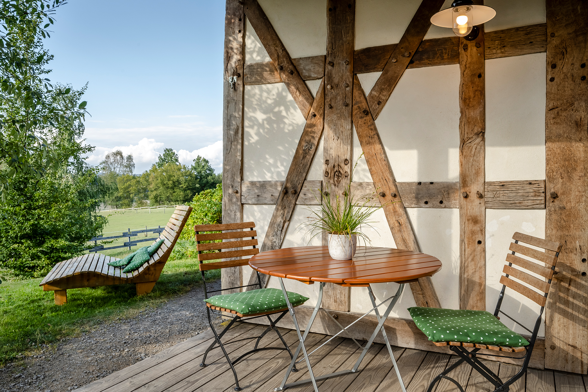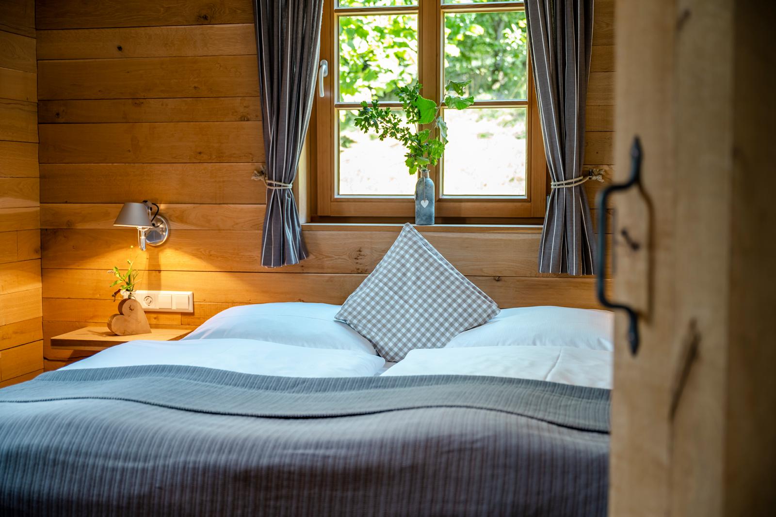 Na gut, ganz so plötzlich funktionierte das nun auch wieder nicht, denn das „Bergdorf LiebesGrün“ sollte ein echter Wohlfühlort, etwas wirklich Einzigartiges werden. Schlicht und reduziert, gleichzeitig funktional und großzügig wurden die Ideen von dem Schmallenberger Architekturbüro „Raumzenit“ umgesetzt, die Berghütten von lokalen Handwerksbetrieben aus regionalen Materialien gebaut. Das Sauerländer Holz blieb komplett unbehandelt, denn passend zur Umgebung sollte auch das Bergdorf eine natürliche und ursprüngliche Erscheinungsform bekommen. Und wie es der Zufall so wollte, wurde just zu dieser Zeit das Pfarrhaus in Dorlar zurückgebaut; die jahrhundertealten Eichenbalken durften nun einen neuen Lebensabschnitt beginnen – wenn du genau hinschaust, kannst du sogar die unterschiedlichen Fachwerk-Muster an den einzelnen Hütten erkennen!
