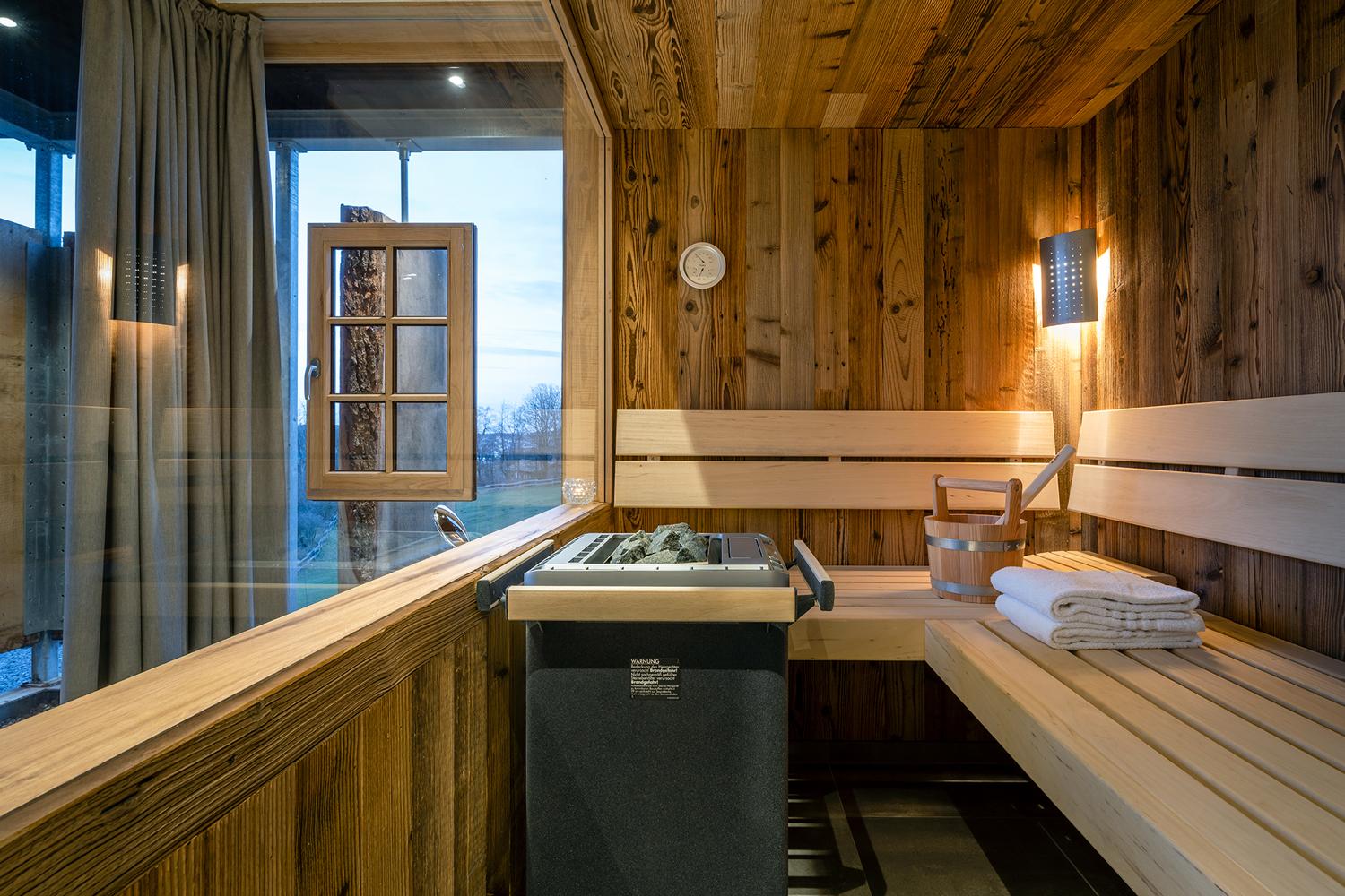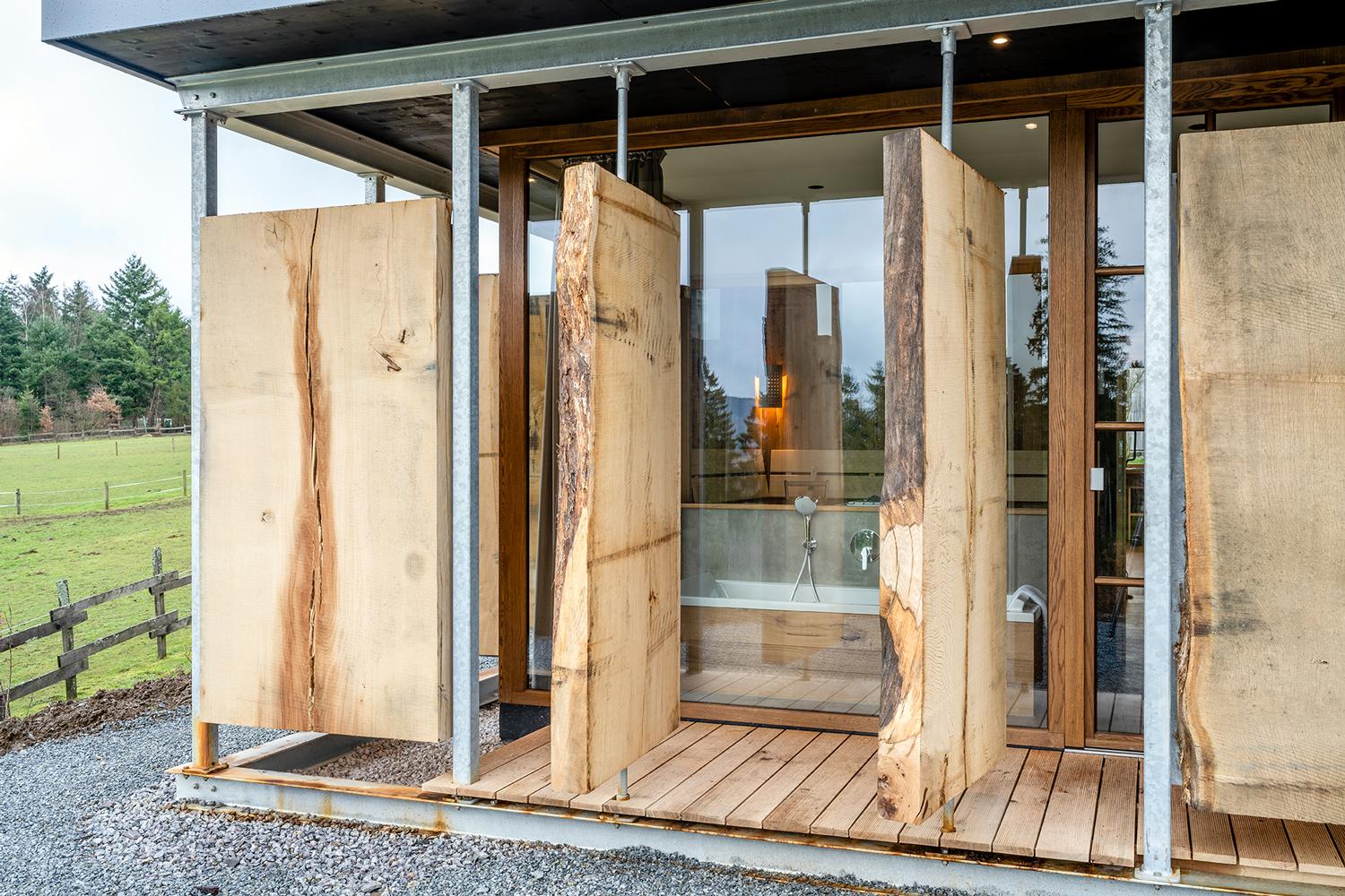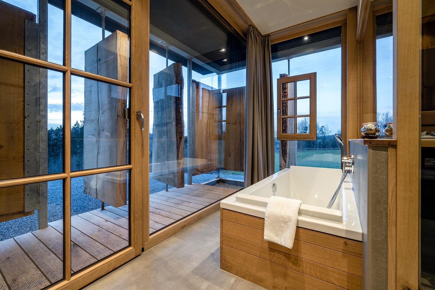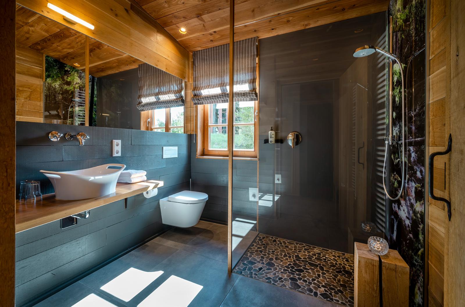 All diese Annehmlichkeiten haben auch die Bergchalets mit Platz für bis zu vier Personen zu bieten, hier wirst du aber sicherlich einige Zeit in deinem Private-SPA verbringen, das seinen Namen mehr als verdient hat: Regendusche, Badewanne oder Finnische Sauna – ob du das alles mit geöffneten oder geschlossenen bodentiefen Fenstern genießt, bleibt dir selbst überlassen! Drehbare Portale aus vierhundert Jahre altem Eichenholz sorgen – wenn gewünscht – für einen kompletten Sichtschutz; dahinter verbirgt sich auch mein persönliches Highlight: Eine Außendusche, in der du sozusagen mitten in der Natur allen Alltagsstress hinter dir lassen kannst.