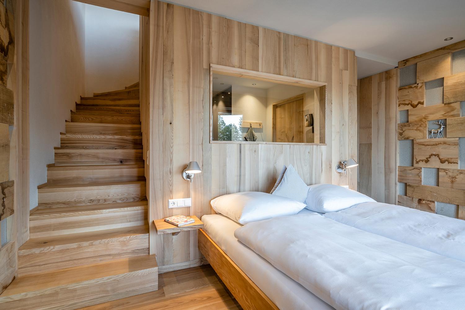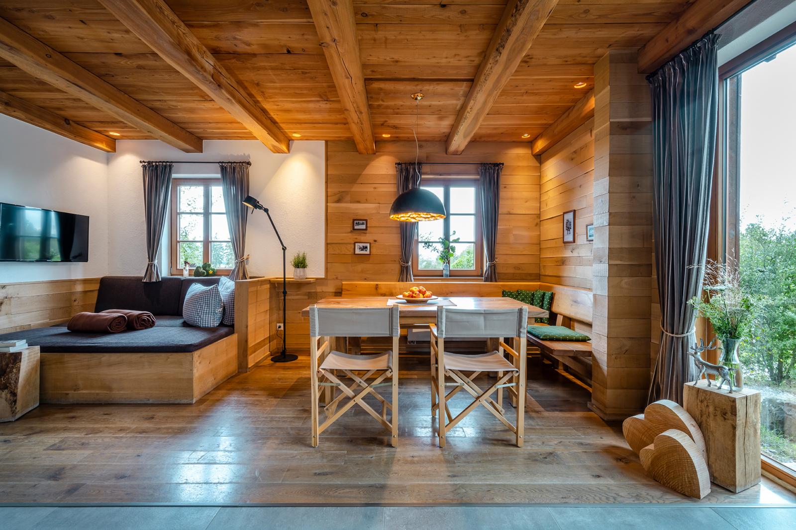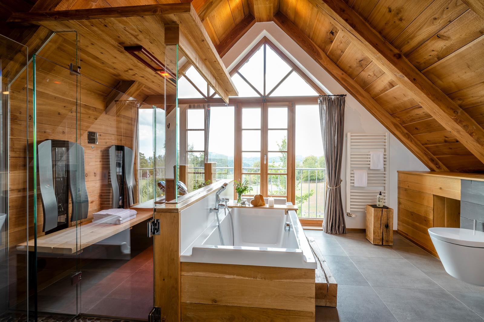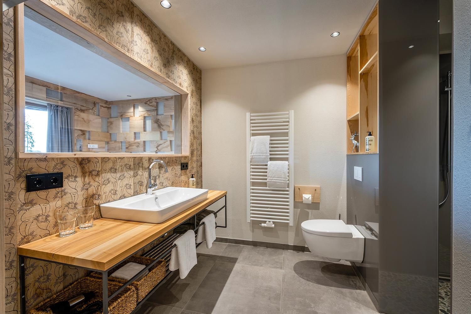 All diese Annehmlichkeiten haben auch die Bergchalets mit Platz für bis zu vier Personen zu bieten, hier wirst du aber sicherlich einige Zeit in deinem Private-SPA verbringen, das seinen Namen mehr als verdient hat: Regendusche, Badewanne oder Finnische Sauna – ob du das alles mit geöffneten oder geschlossenen bodentiefen Fenstern genießt, bleibt dir selbst überlassen! Drehbare Portale aus vierhundert Jahre altem Eichenholz sorgen – wenn gewünscht – für einen kompletten Sichtschutz; dahinter verbirgt sich auch mein persönliches Highlight: Eine Außendusche, in der du sozusagen mitten in der Natur allen Alltagsstress hinter dir lassen kannst.