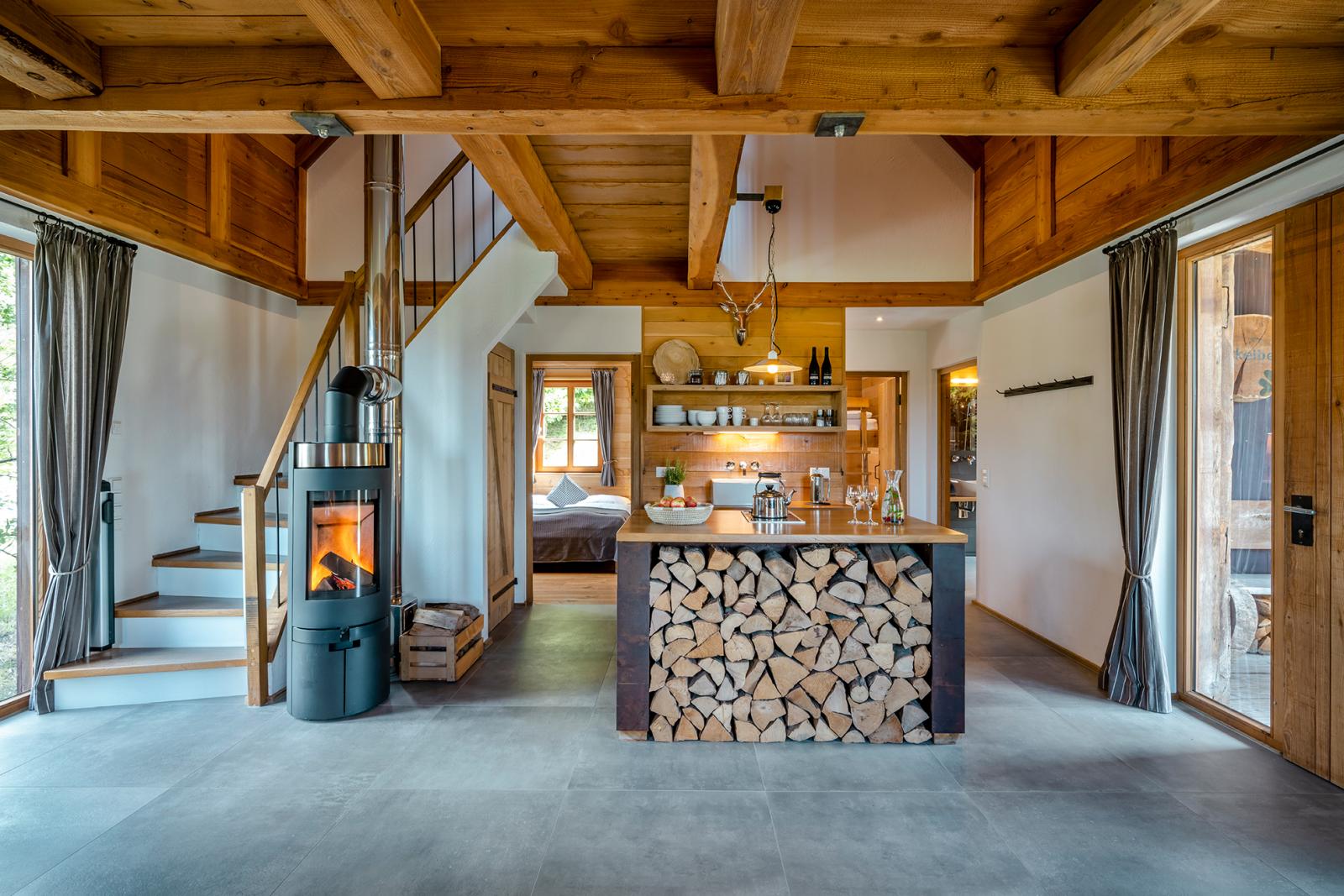 Dieser besondere Charme setzt sich im Inneren der Berghütten fort; das unbehandelte Eichenholz sorgt für einen angenehmen Geruch, eine wohlige Atmosphäre. Auch hier ist an jedes Detail gedacht, um dir eine besonders gute Zeit zu verschaffen: So findest du Entspannung in der Physiotherm-Infrarotkabine oder der Design-Badewanne mit Ausblick, stimmungsvolle Arrangements am Kaminofen mit Sauerländer Brennholz oder auf der überdachten Terrasse mit Sitzgelegenheit und Kuscheldecken sowie liebevolle Details wie das selbstgemachte Bio-Badesalz mit Lavendel oder die Bachkieseldusche, für die jeder einzelne Stein aus der nahe gelegenen Lenne gesammelt wurde.