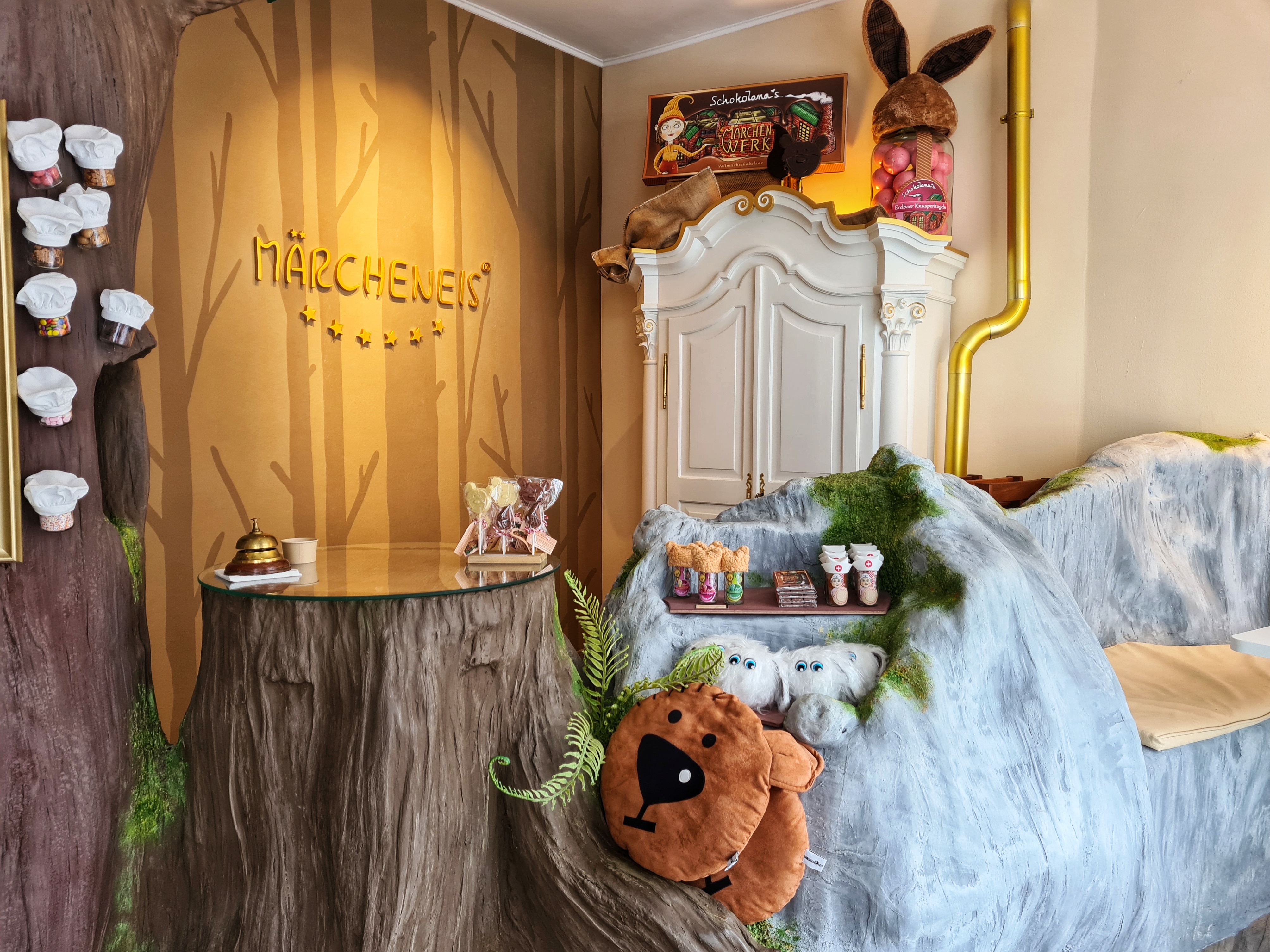 Was auf der Bühne lebte, sollte ein neues Zuhause finden; bestenfalls eins, in dem du die entzückenden Charaktere auch regelmäßig besuchen kannst. Und so zogen die Puppe „Anneliese“, der Teddy „Brummbär“ und der Pilz „Napoleon“ in die Neue Straße um – im Mai 2017 eröffneten Christina und Patrick hier ihr „Märcheneis“. Zunächst einmal war es kein Café im klassischen Sinne; die nach den Bühnenfiguren benannten Softeis-Becher gab es zunächst nur zum Mitnehmen. Doch mit einem hatten Christina und Patrick nicht gerechnet: Schon am ersten Tag war der Andrang so groß, dass die kleine Softeismaschine die große Nachfrage gar nicht bewältigen konnte, in der Neuen Straße bildete sich eine lange Schlange. Also rüsteten die Beiden mit größeren Maschinen nach, und auch im Innenbereich passierte eine Menge: Nach und nach entstand hier eine echte Märchenwelt!