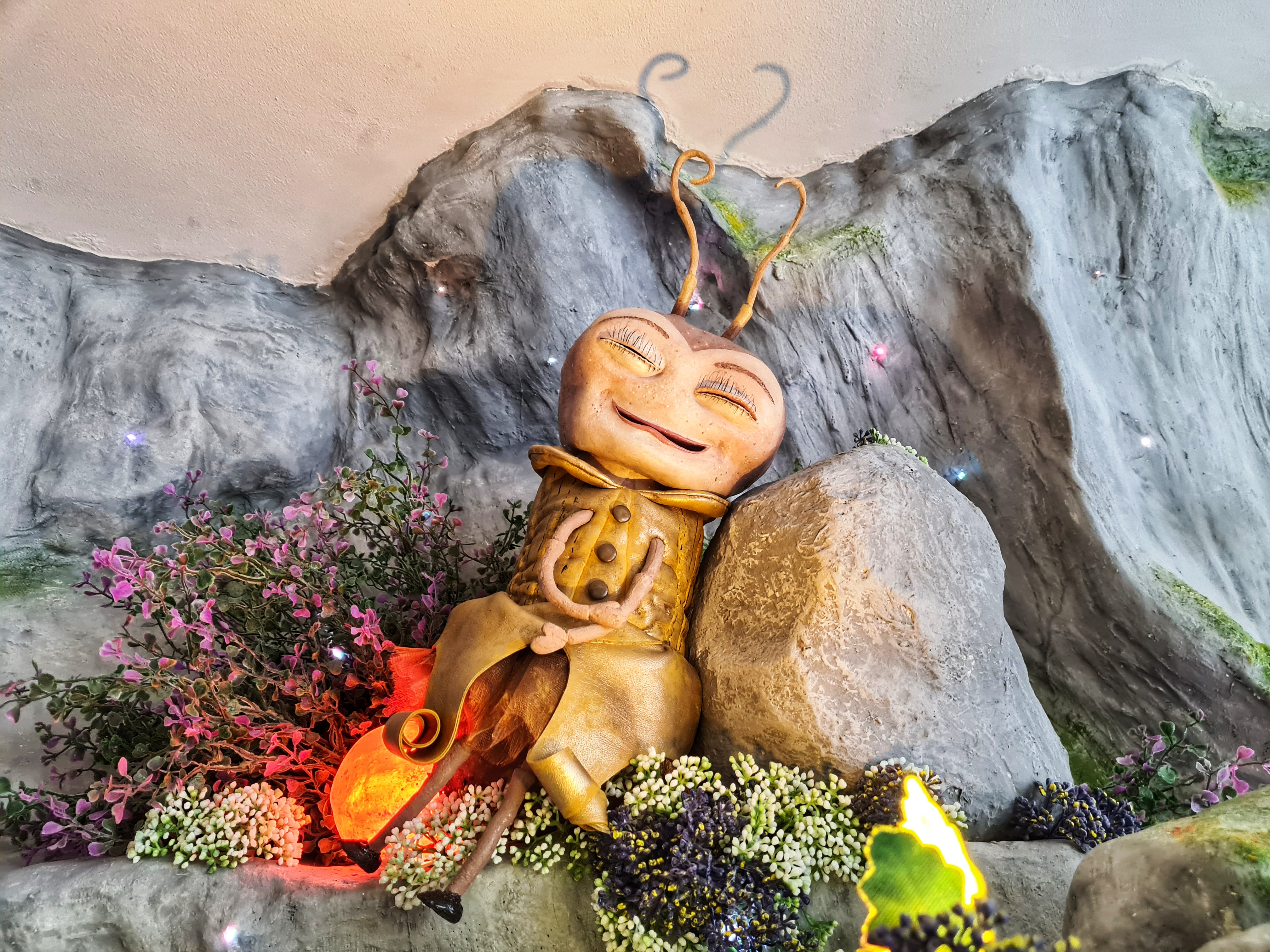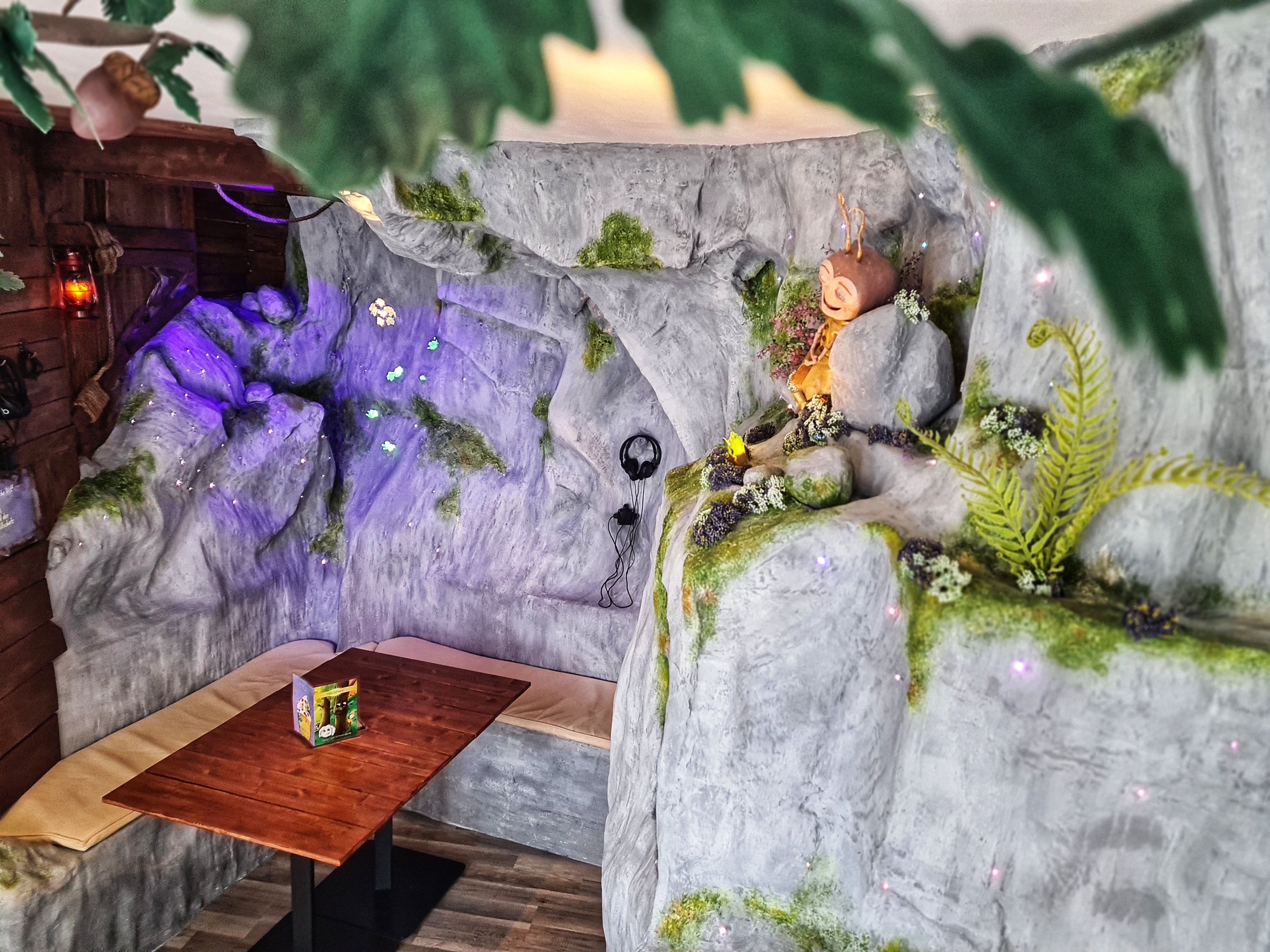 Ich bin selten sprachlos, aber als ich durch die Tür trat, fehlten mir kurz die Worte… Wenn es dir genauso geht, kein Problem – nimm einfach Platz und lass dich mit allen Sinnen verzaubern, das Reden übernehmen andere für dich: Hoch oben auf einem Felsvorsprung sitzt Glühkäfer „Angellia“ – komplett entworfen, gebaut und gestaltet von Christina und Patrick – und gibt dir Bescheid, wenn ein neues Hörspiel beginnt.