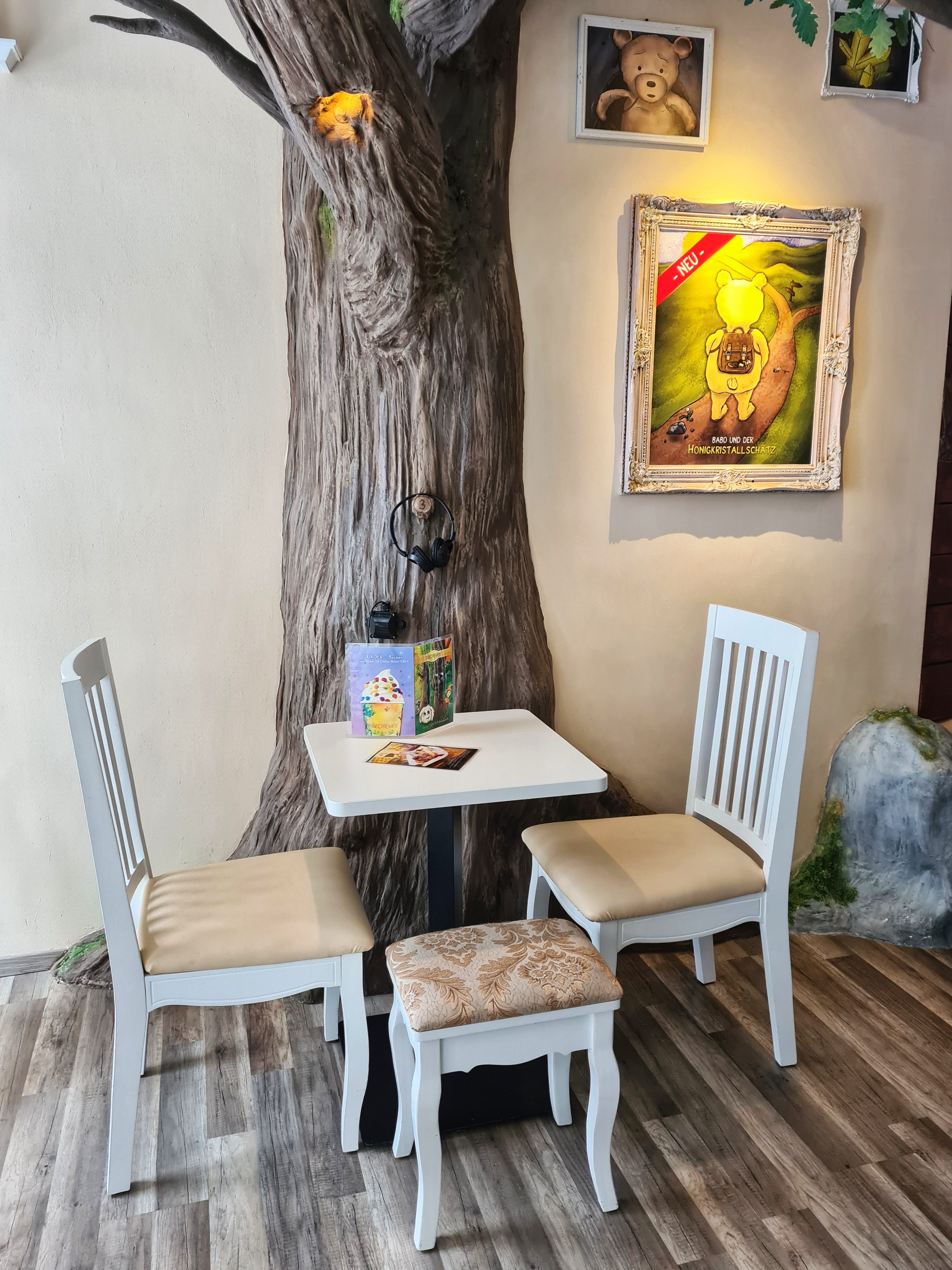 Hörspiel? Ja, genau, an jedem Tisch befinden sich Kopfhörer, mit denen du in die spannenden Geschichten eintauchen kannst: In dem Hörspiel „Angellias magische Welt“ erfährst du mehr über den charmanten Glühkäfer; ganz neu ist das Hörbuch „Babo und der Honigkristallschatz“ hinzugekommen – aus der Feder von Christina und mit Illustrationen von Patrick. Etwa zwanzig Minuten kannst du nun den Abenteuern des knuffigen Bären lauschen, oder, wenn du deine Kinder dabei hast, einfach mal die Ruhe genießen. 😉