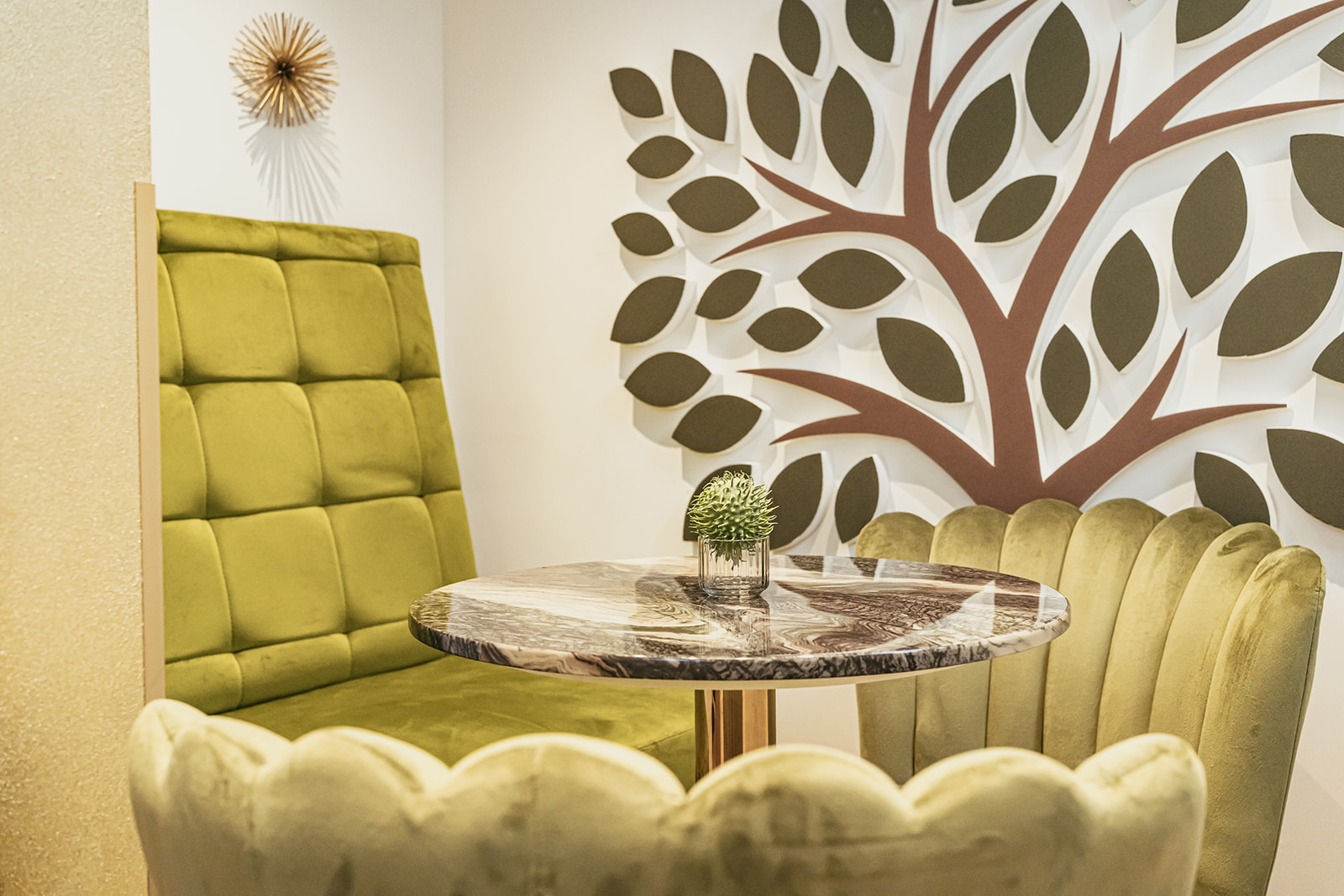 Ein süßes Tagescafé mit offenem Bar-Charakter sollte es werden, innovativer Industrial-Style gemischt mit einem Hauch Retro-Touch, viel Holz und Leder, kurz gesagt: Ein bisschen Großstadt inmitten von Arnsberg. Doch auch den originalen Charme des Gebäudes wollte Familie Kremer erhalten; so durfte zum Beispiel das alte Treppengeländer bleiben, dessen Farbe sich dann auch in den gemütlichen Polstermöbeln im oberen Bereich wiederfindet.