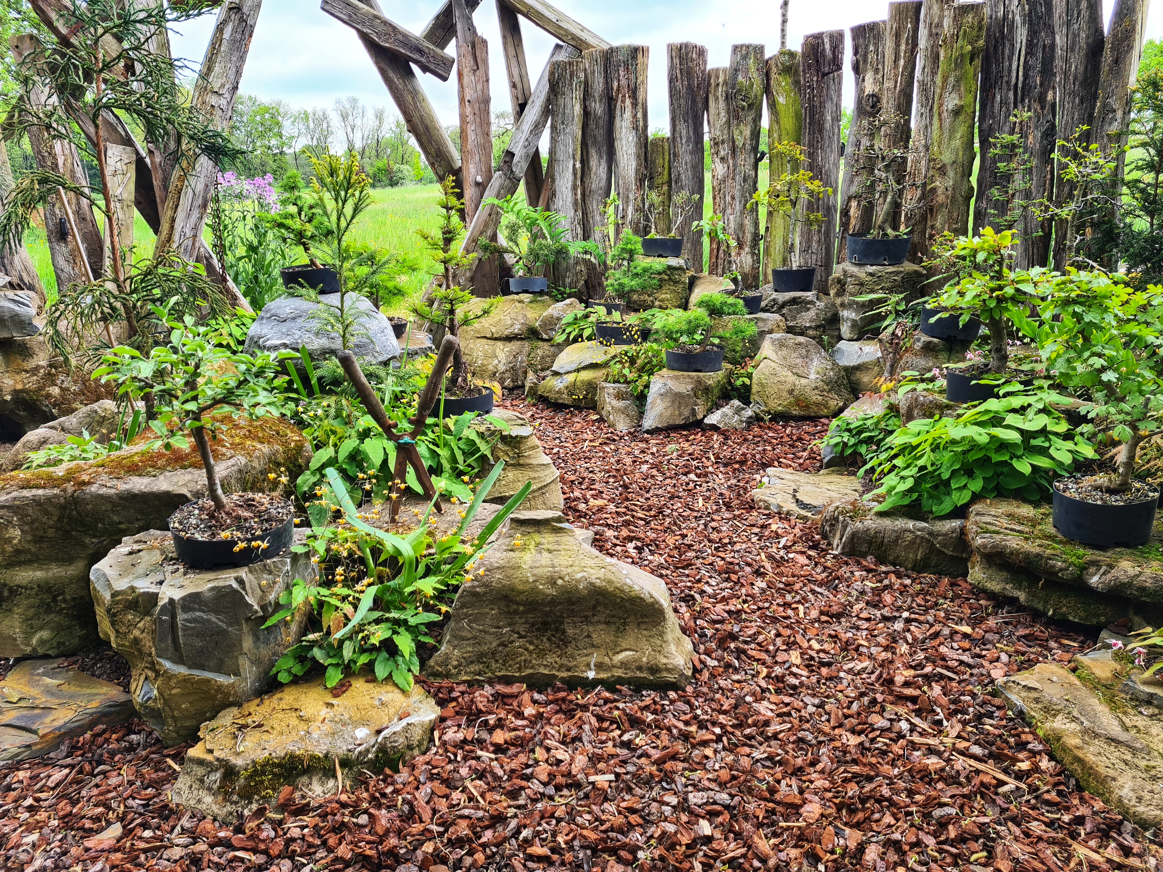Es ist zwar schwer, sich für ein Highlight des Gartens zu entscheiden, aber für mich kommt Ulis Bonsai-Garten schon ganz nah daran! Die rund vierzig Bäumchen hat er alle selbst gezogen, gekonnt gedrahtet, mit Totholz gestaltet. Dazwischen darf die Elfenblume in verschiedenen Farben wachsen – eine Pflanze, die ihren Namen wirklich verdient hat und in ihrer Zierlichkeit einen wunderbaren Kontrast zu den Bäumen bildet.