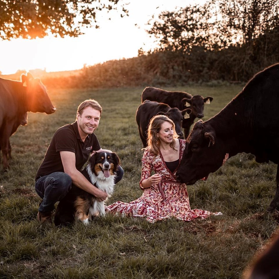 Wir haben beide Landwirtschaft studiert. Christoph war direkt nach dem Studium als Erntehelfer in Australien und ist da auf diese Tiere, die auf einem Nachbarhof gezüchtet wurden, aufmerksam geworden. Er war begeistert von dieser ruhigen Wesensart der Tiere und ist dann mit dem Farmer ins Gespräch gekommen. So hat er dann auch von der besonderen Qualität, der intensiven Marmorierung und dem niedrigen Schmelzpunkt des Fleisches erfahren und es probiert. Der buttrig-nussige Geschmack, dass es auf der Zunge zergeht – das hat ihn absolut fasziniert. Und Wagyu-Fleisch ist tatsächlich auch das gesündeste Fleisch, weil es die beste Fettsäuren-Zusammensetzung hat und viel mehr Omega-3 und Omega-6 enthält als andere Sorten. Daher können es auch Leute essen, die sonst nicht so gut Fleisch vertragen. Mit der Idee vom Wagyu im Sauerland im Gepäck kam Christoph dann nach Hause… Wir konnten uns ohnehin nicht vorstellen, auf Massentierhaltung zu gehen, und so haben wir es einfach ausprobiert. Vor fünf Jahren sind wir in Christophs Heimat Marsberg gestartet, durch viel Glück haben wir dann diesen wunderbaren Hof hier in der Nähe von Arnsberg gefunden und sind Ende 2019 mit zwanzig Wagyus umgezogen. Am Anfang hatten wir nicht einmal eine Schaufel, geschweige denn einen Trecker; außerdem hatten wir beide noch einen Job und haben das am Anfang nebenbei aufgebaut – wenn ich jetzt zurückblicke, kann ich selbst kaum glauben, dass wir das alles geschafft haben. Aber bereut haben wir es nicht für eine Sekunde, wir leben hier auf einem wunderschönen Fleckchen Erde umringt von glücklichen Tieren und fühlen uns einfach rundum wohl. Wir haben so viel Liebe und Leidenschaft für das, was wir tun, und unsere Tiere geben uns das zurück.
