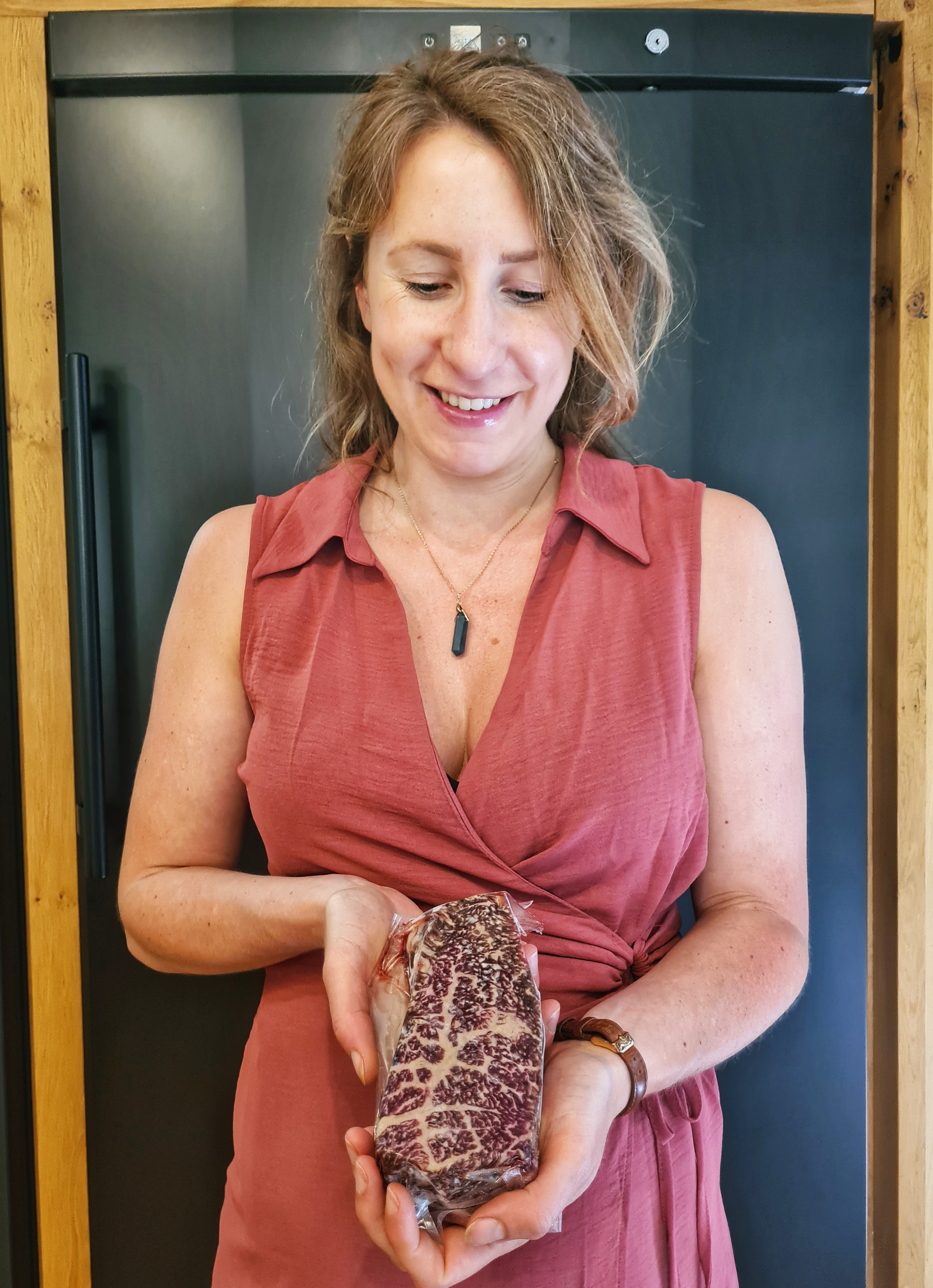 Damit wir die Qualität selbst in der Hand haben. Es gibt viele Vermarkter, die die Tiere zukaufen, und da weiß man natürlich nicht, welche Qualität man am Ende hat. Dadurch, dass wir die Tiere von klein aufziehen und dann auch mästen, wissen wir genau, was wir füttern und wie wir sie halten. So haben wir alles selbst im Griff, und daher haben wir uns dafür entschieden, alles selbst zu machen, um auch wirklich einen ganz, ganz hohen Standard an Qualität anbieten zu können. Es ist schon recht hochpreisig, da muss man sich sicher sein, dass das Fleisch absolut super ist! Wir möchten regional vermarkten, damit sich die Leute die Tiere auch ansehen können; unser Hofladen ist freitags von 15 bis 17 Uhr und samstags von 10 bis 14 Uhr geöffnet, da kann man auch ohne Vorbestellung einfach vorbeikommen… Der Onlineshop bietet auch den Wagyu-Fans, die nicht aus dem Sauerland kommen, sogar europaweit, die Möglichkeit, sich diesen Genuss zu gönnen.