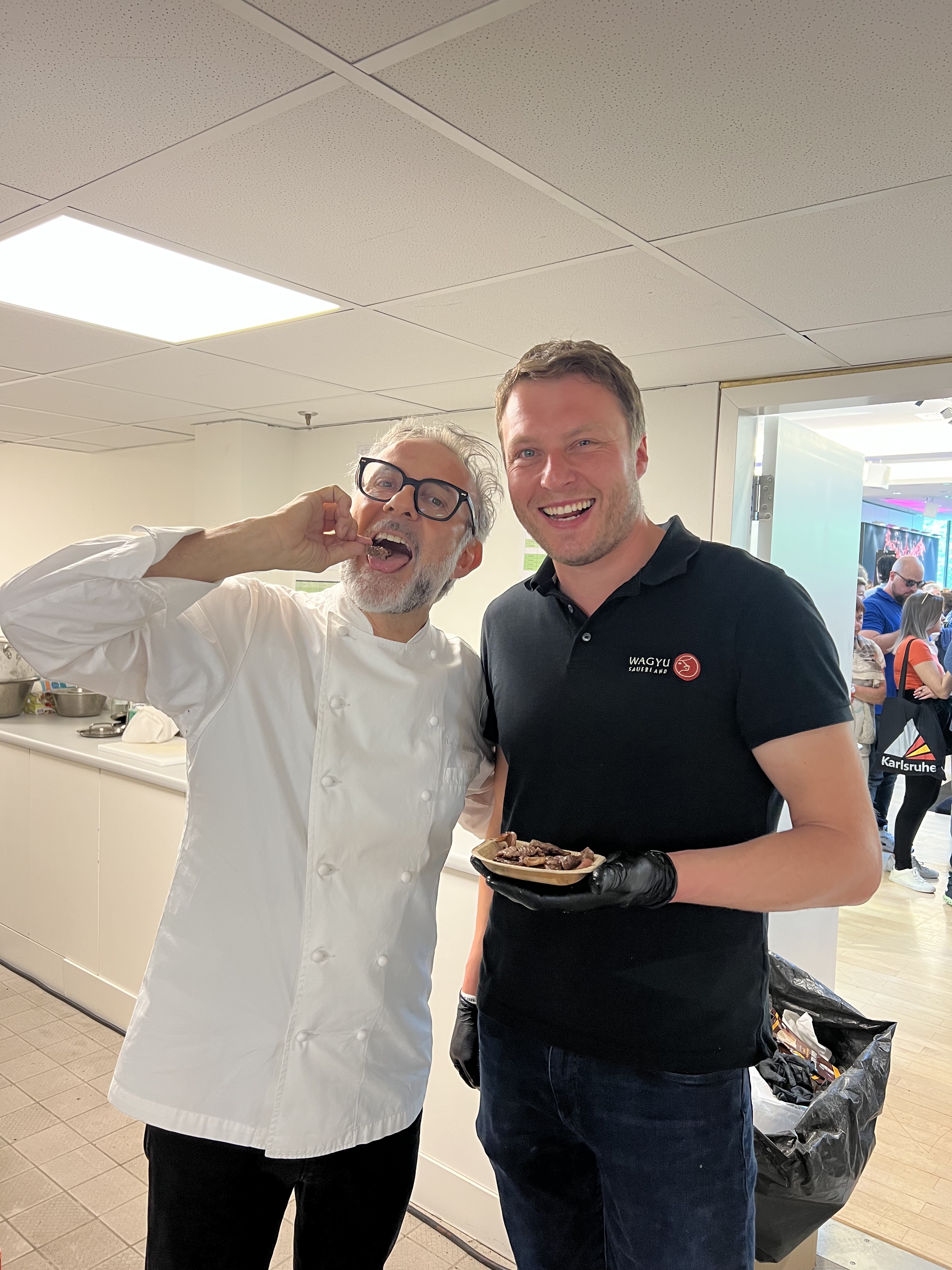 Ganz besonders haben wir uns gefreut, vor zwei Jahren den „Fleisch Contest“ vom „Wagyuverband Deutschland e.V.“ gewinnen zu können. Wir mussten zuvor ein Rib Eye Steak Bone einsenden, das von einer unabhängigen, vierköpfigen Jury auf Merkmale wie Marmorierung, äußere Erscheinung, Sensorik und natürlich den Geschmack geprüft wurde. Wir konnten uns gegen 22 Mitbewerber durchsetzen und waren damit Deutscher Meister mit unserem Wagyu Fleisch; das ist schon eine ganz besondere Auszeichnung, zumal wir das erste Mal teilgenommen haben. Das hat uns darin bestätigt, dass wir auf dem richtigen Weg sind. Wir haben auch noch weitere Wettbewerbe gewonnen, besonders stolz sind wir aber, wenn echte Spitzen-Köche so überzeugt von unserem Fleisch sind, dass sie es in ihrer Küche einsetzen: In den Restaurants von Steffen Henssler zum Beispiel gibt es unser Wagyu-Fleisch auf Sushi, außerdem durften wir Massimo Bottura kennenlernen, der seit zehn Jahren drei Michelin-Sterne hat und zu den besten Köchen der Welt zählt. Als er probierte und bezogen auf die Leidenschaft für unsere Arbeit sagte „I can feel it“, haben wir wirklich Gänsehaut bekommen. Tatsächlich möchte er nun auch unser Fleisch für sein Drei-Sterne-Restaurant beziehen. Auch Gastronomen in der Umgebung sind auf uns aufmerksam geworden; so gibt es unser Fleisch zum Beispiel in der „Pension Becker“ und im „Hotel Menge“ in Arnsberg und im „Hotel Antoniushütte“ in Balve.
