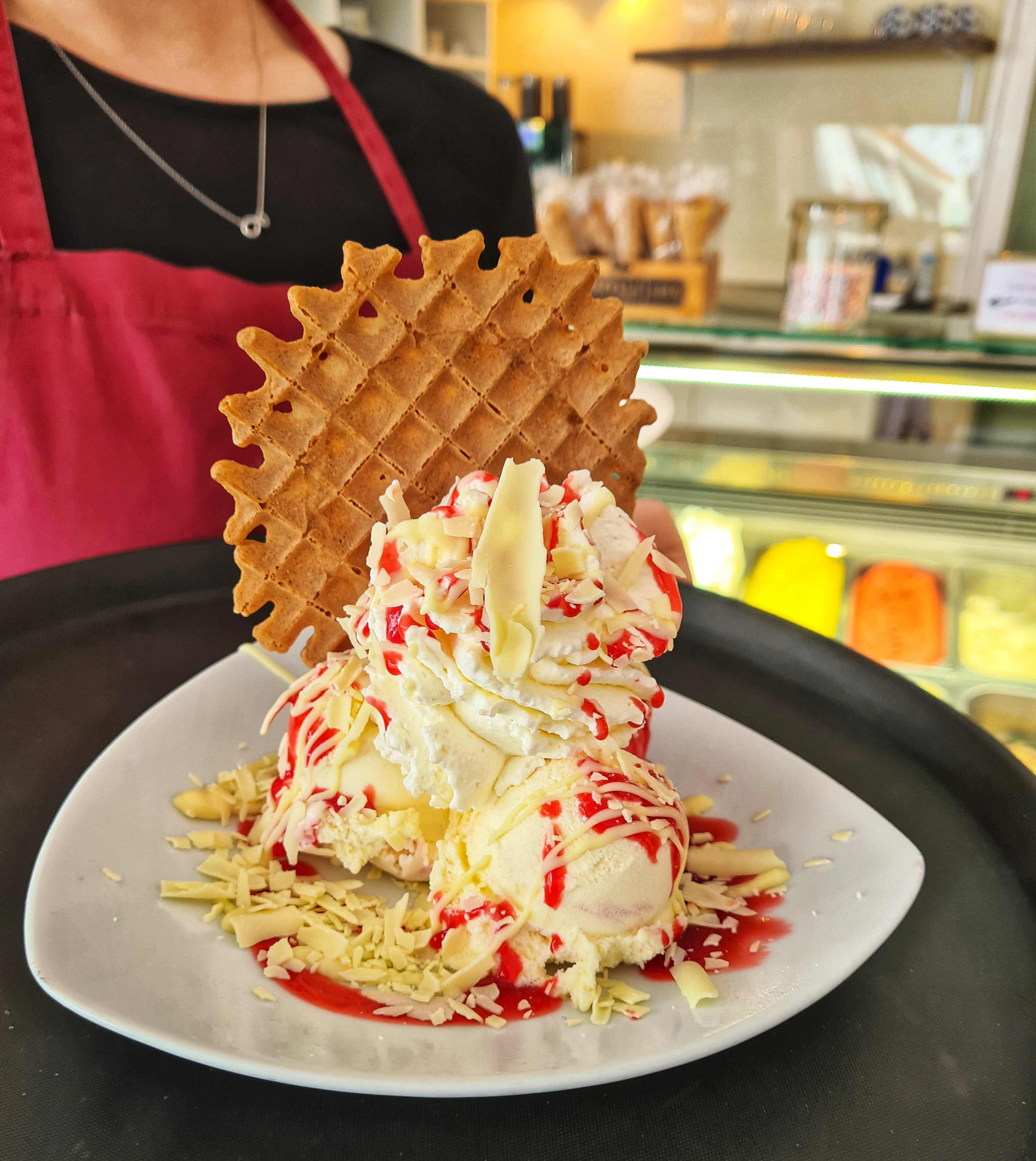 Ob nun ein echter Klassiker oder eine extravagante Neuheit – in der Theke findest du immer sechzehn Sorten: Acht, die es immer gibt, und acht, die ständig wechseln. Es lohnt sich also, häufiger mal vorbeizuschauen; gern kannst du auch dein eigenes Gefäß – idealerweise eine Tasse oder einen Becher – mitbringen und dir Eis oder Getränke hineinfüllen lassen. So bekommst du nicht nur einen kleinen Rabatt, sondern tust auch noch etwas Gutes für die Umwelt.