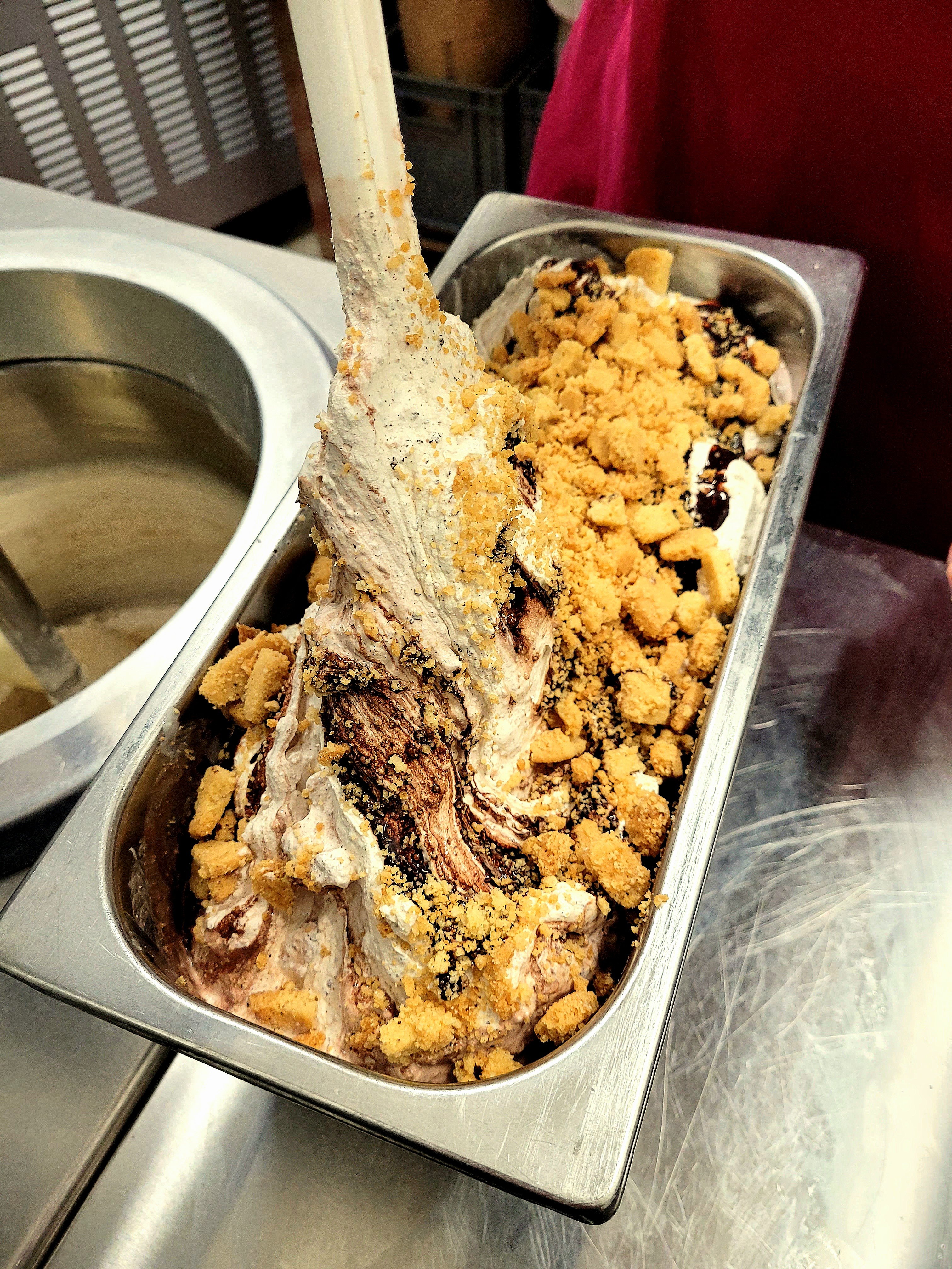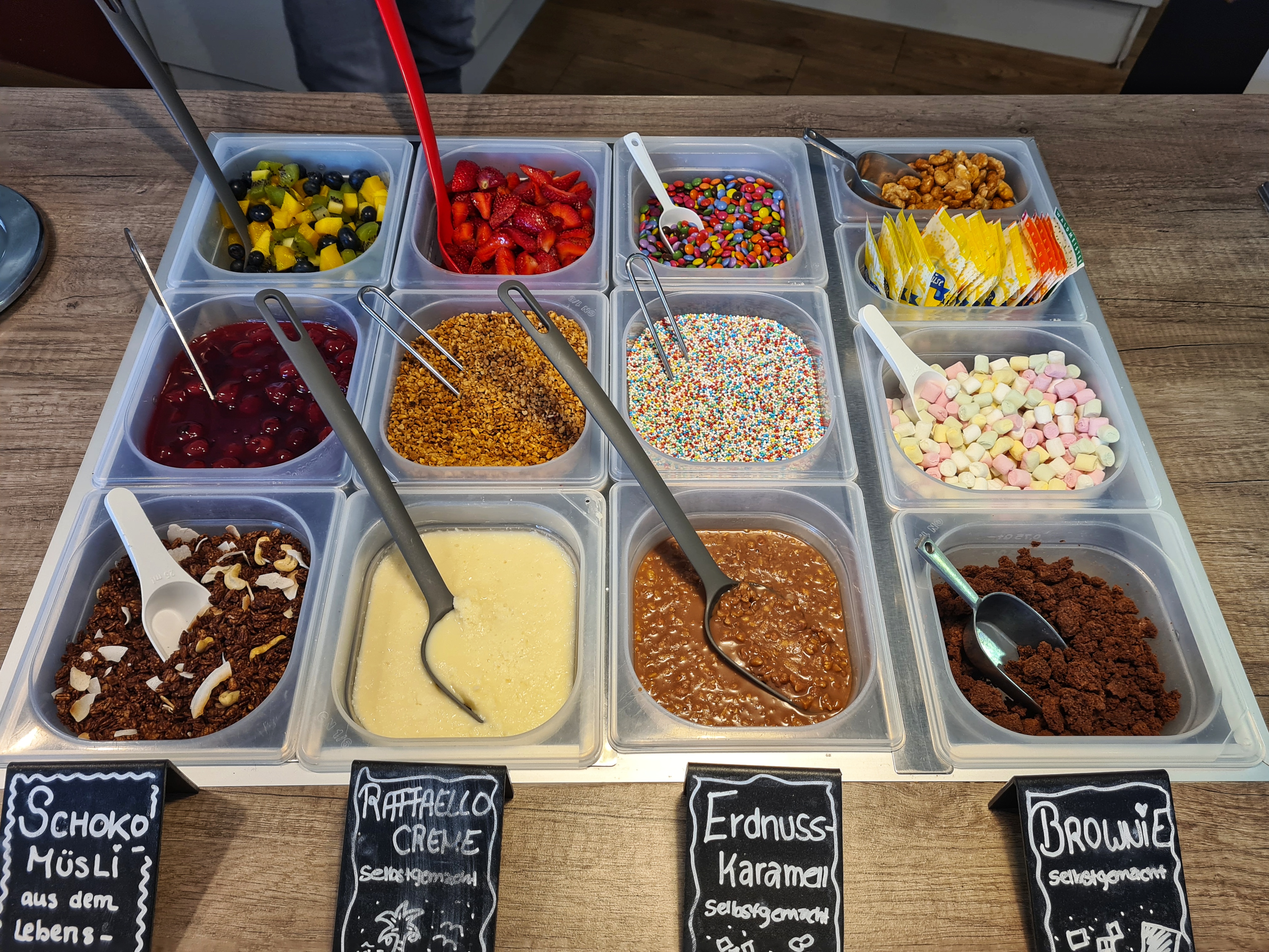Und auch sonst macht Torsten einiges anders: Im Eis-Raum hinter der Theke stehen keine neumodischen Freezer, sondern bereits etwas in die Jahre gekommene Vertikal-Eismaschinen der Firma „Boku“. Zwar ist diese Methode etwas oldschool, ohne digitalen Schickschnack und erfordert mehr menschlichen als technischen Einsatz, aber so kommen nun einmal viel hochwertigere Ergebnisse dabei raus! Das Eis hat einen Luftanteil von maximal 25 Prozent – bei anderen Herstellungsweisen sind es bis zu 75 Prozent –, wird schön cremig und hat die perfekte Konsistenz…