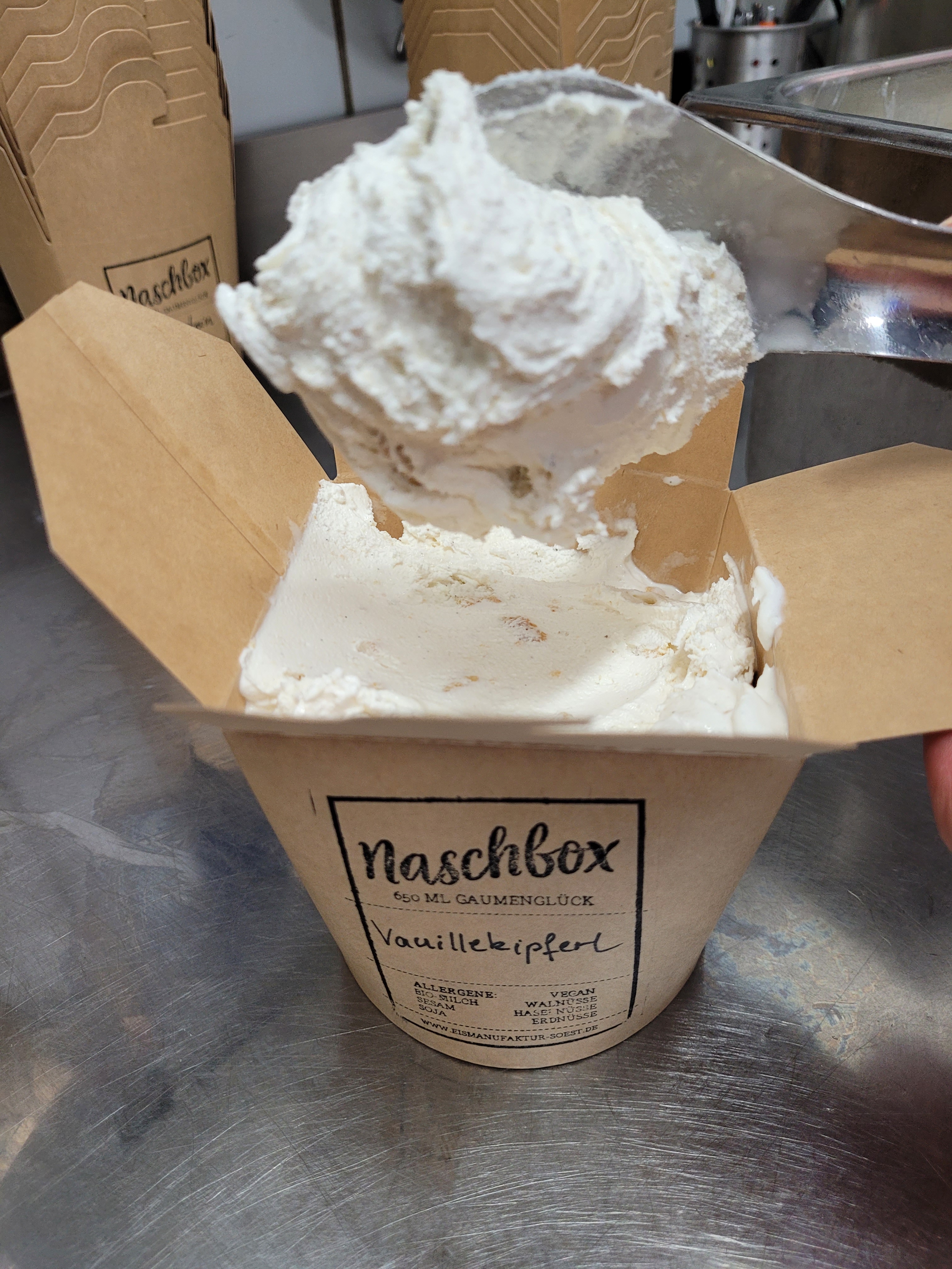 Übrigens: Für Torsten und sein Team wäre es ein leichtes, das Eis ganz frisch aus der Maschine in die Theke zu packen, aber das macht überhaupt keinen Sinn. Die guten Zutaten müssen erst einmal in Ruhe durchziehen, bevor sie ihren vollen Geschmack entfalten – ein sonniges Wochenende wie dieses will also gut vorbereitet sein!