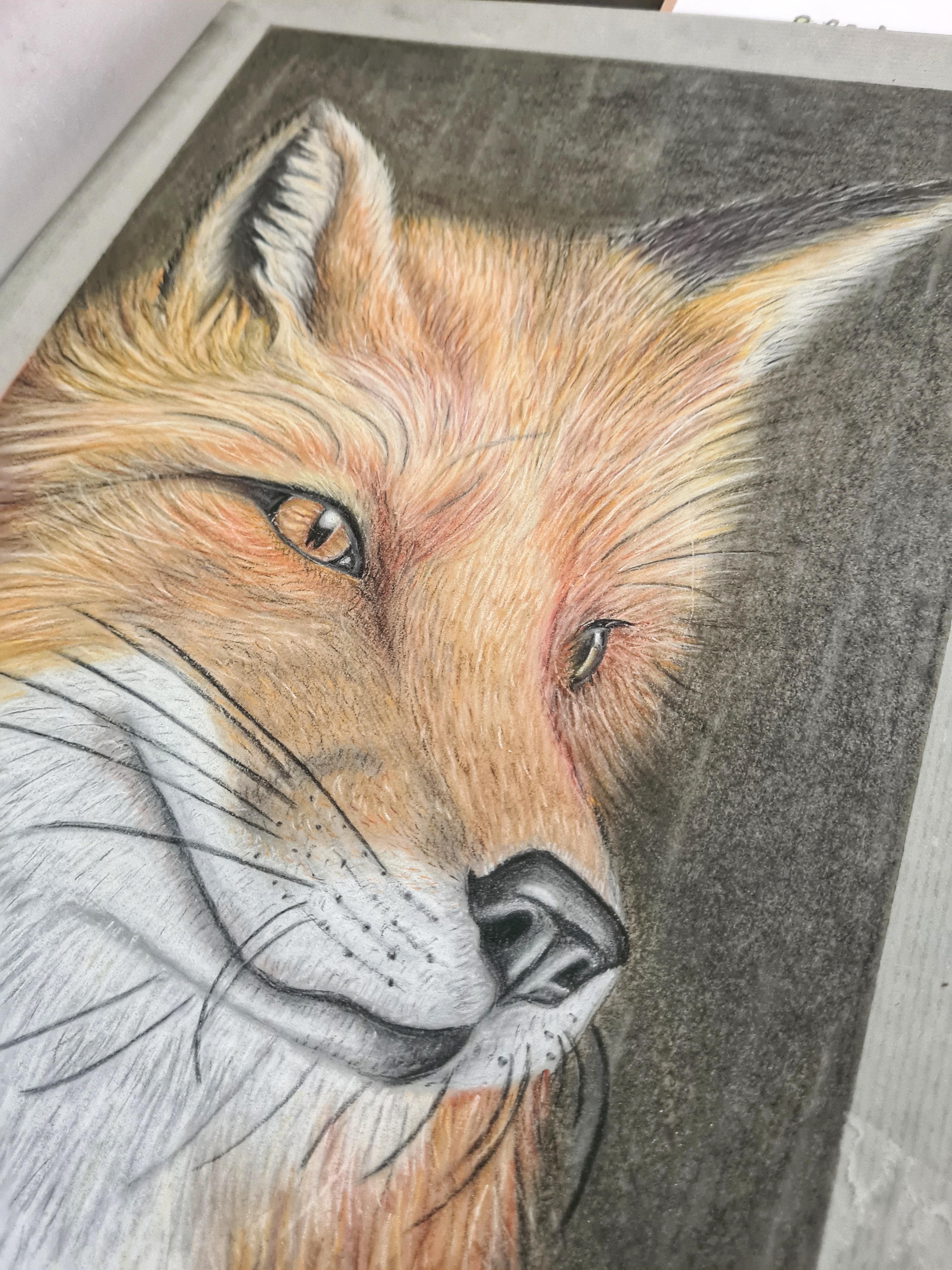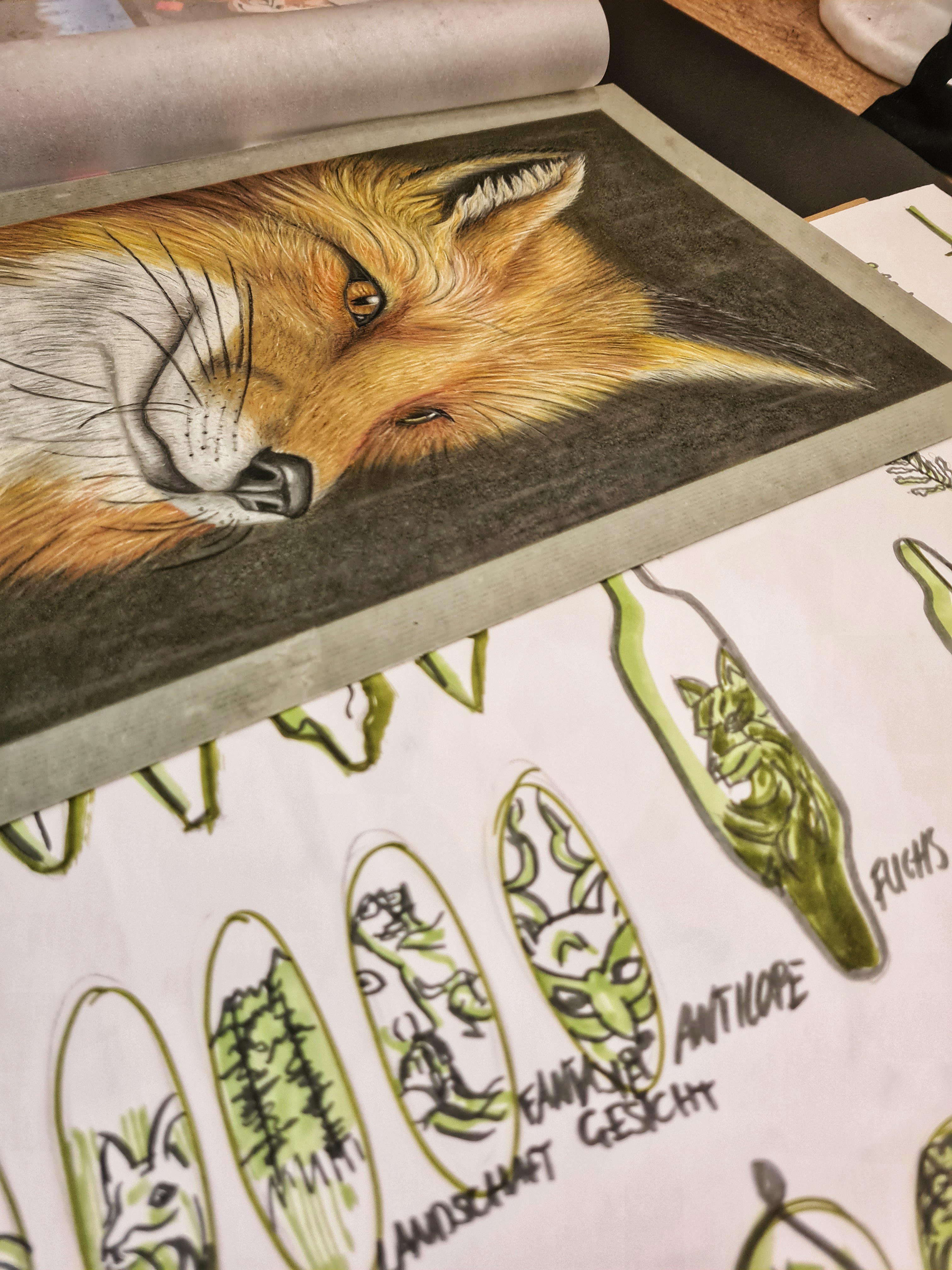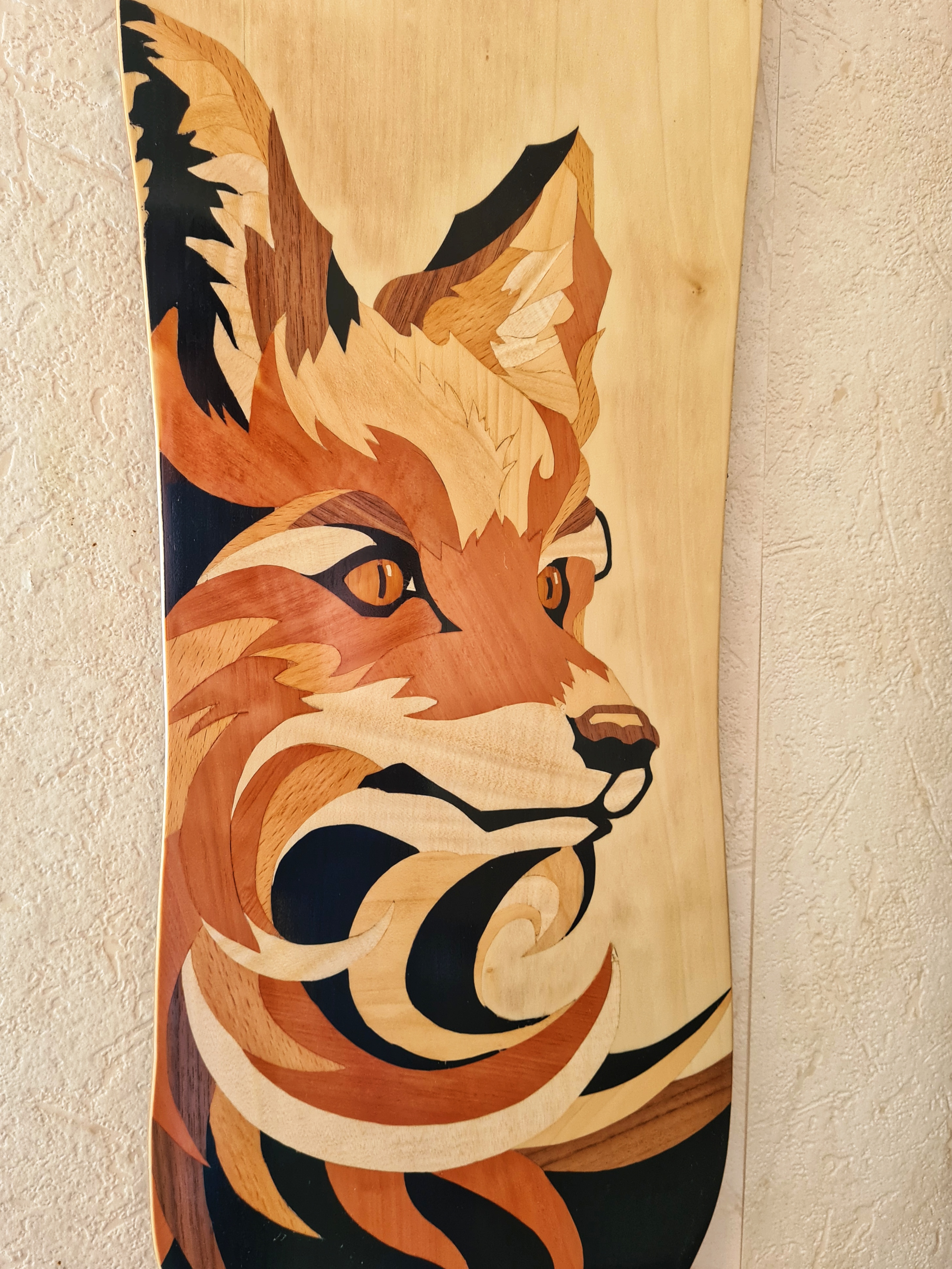 Doch ihr Lieblingstier ist ganz eindeutig der Fuchs! Von ihm entstand zunächst nur eine Portraitzeichnung; als Madlen aber ein ausrangiertes Skateboard fand, kam ihr gleich die Idee, im Rahmen eines Oberflächenkurses ein Longboard nach ihren eigenen Vorstellungen zu entwerfen. Aus sieben unterschiedlichen Furnieren, die Madlen teils auch auf dem Dachboden fand, wurde die Unterseite gestaltet, die Basis bildet massive Birkenmultiplex.