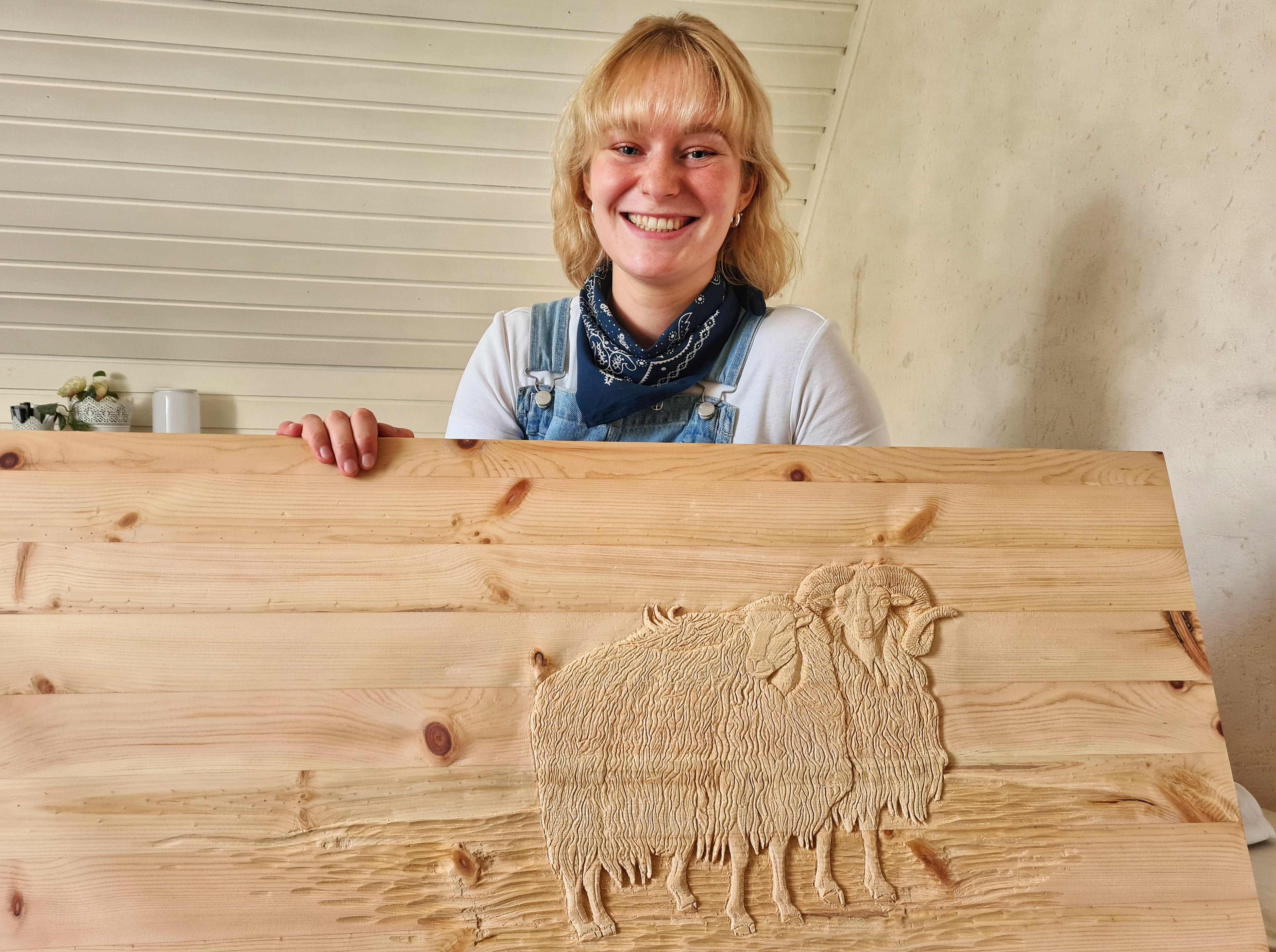 Nicht viel anders ist es mit der Bank „Scha(r)f verpackt“: Gefertigt aus massivem Zirbenholz, das einen wohligen Duft verbreitet, und mit der Brennholzoptik als Frontgestaltung ist es detailverliebt und gut durchdacht; die in den Deckel geschnitzten Skudden erinnern Madlen an ihre Kindheit, früher gehörten zu ihrer Familie nämlich auch einige Exemplare dieser Hausschafrasse.