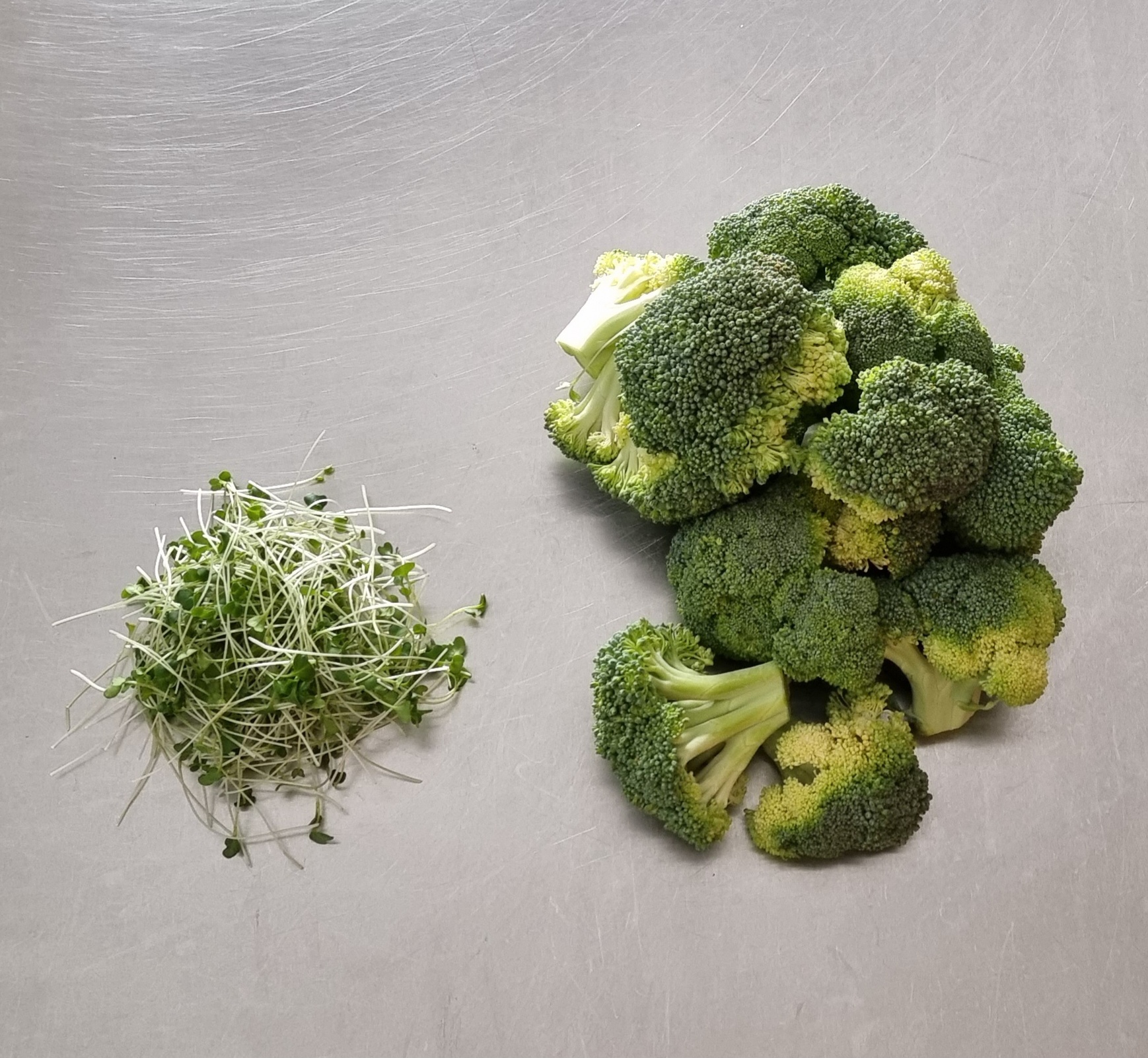 Ja, Gemüse ist gesund! Doch hast du eine Ahnung, wieviel du davon essen musst, um ausreichend mit Vitaminen, Proteinen, Mineralstoffen, Chlorophyllen und anderen wichtigen Nährstoffen versorgt zu sein? Machen wir das mal an einem Beispiel deutlich: Das folgende Bild zeigt zehn Gramm Brokkoli-Microgreens und fünfhundert Gramm des ausgewachsenen Gemüses. Kaum zu glauben, aber die beiden Portionen enthalten in etwa die gleiche Menge an Sulforaphan, einem sekundären Pflanzenstoff mit antimikrobieller und antioxidativer Wirkung, dessen Effektivität im Kampf gegen Tumore von der Krebsforschung nachgewiesen wurde.