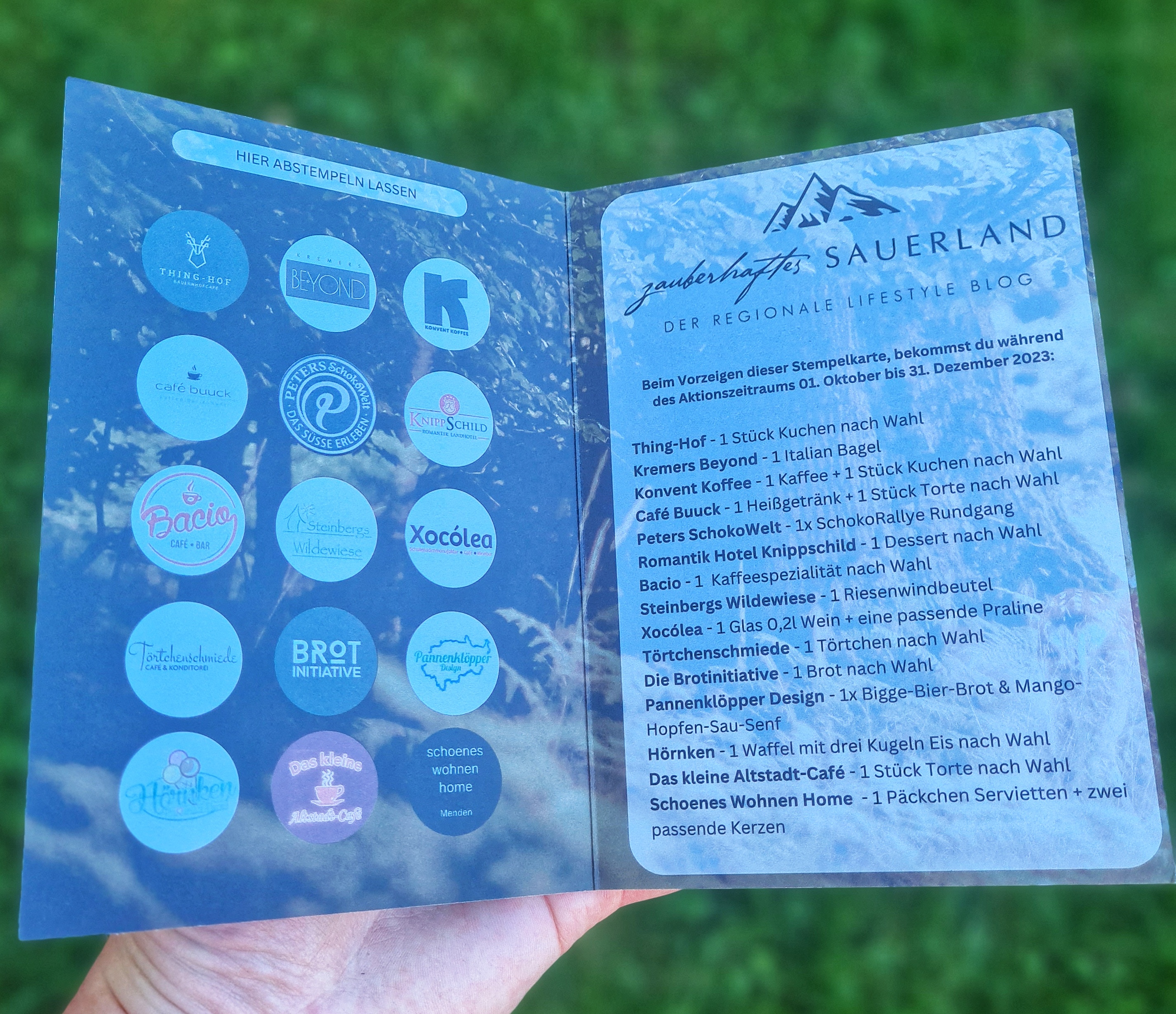 Mein herzlicher Dank geht an alle Kooperationspartner für die tollen Angebote sowie an Julie Henning von „julful media“ und an Dunja Afsari von „Dunja Afsari Fotografie“ für die perfekte Gestaltung der Stempelkarte und das zauberhafte Foto des herbstlichen Waldes.