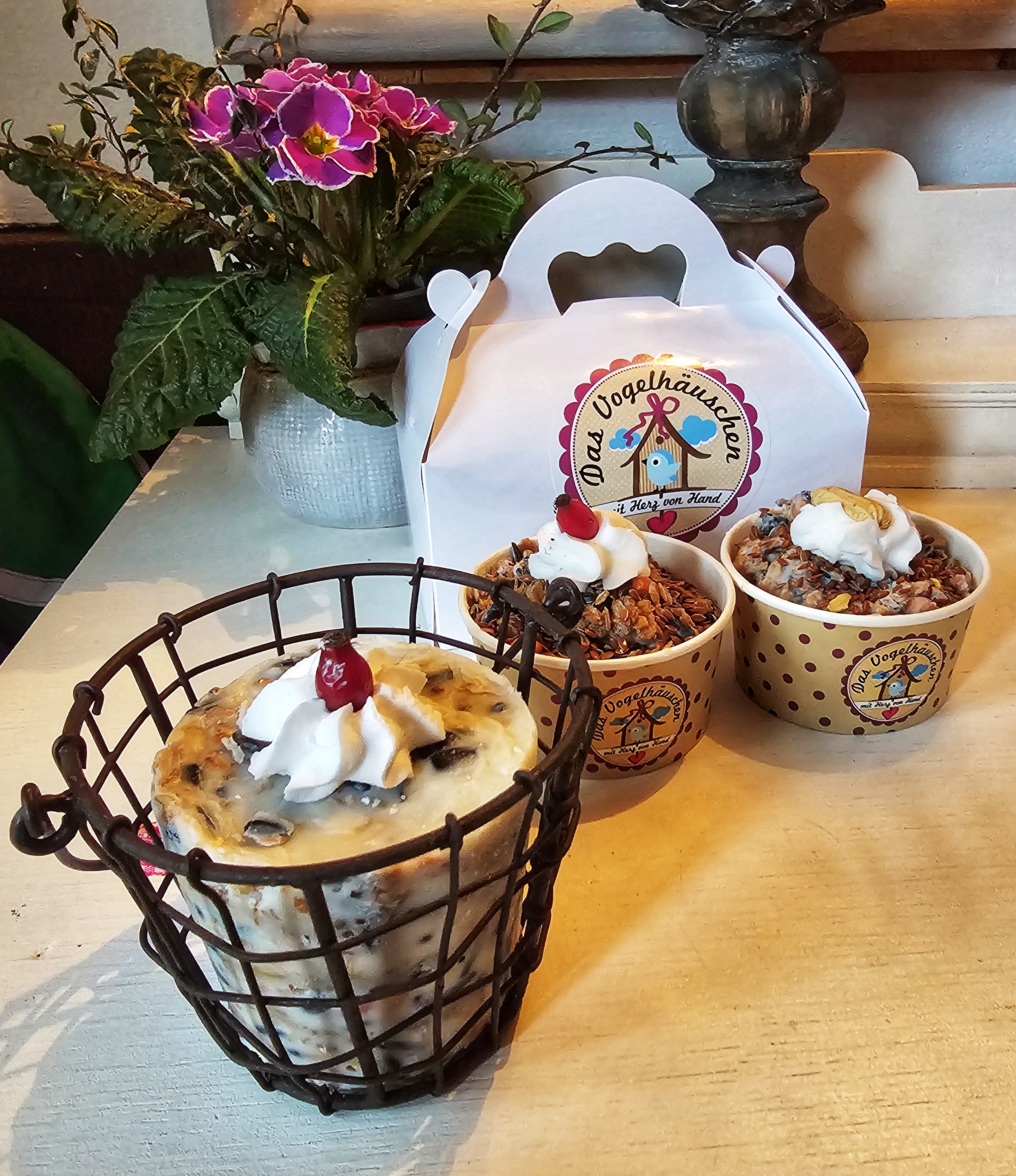 In einer riesigen Fritteuse schmelzen Patrick und Sandra den Rindertalg ein, dann kommen – je nachdem, welche Futtersorte gerade hergestellt wird – Sonnenblumenkerne und Erdnüsse, Hafer- und Weizenflocken, Rosinen und alles, was das Vogelherz begehrt, hinzu. Anschließend wird die flüssige Masse in handelsübliche Backformen gefüllt, heraus kommen Hafer-Nuss-Herzen, Cupcakes oder ganze Torten, die liebevoll mit einem „Sahnehäubchen“ dekoriert werden. Ja, es sieht wirklich zum Anbeißen aus, aber diese Leckereien solltest du nun wirklich deinen gefiederten Freunden überlassen!