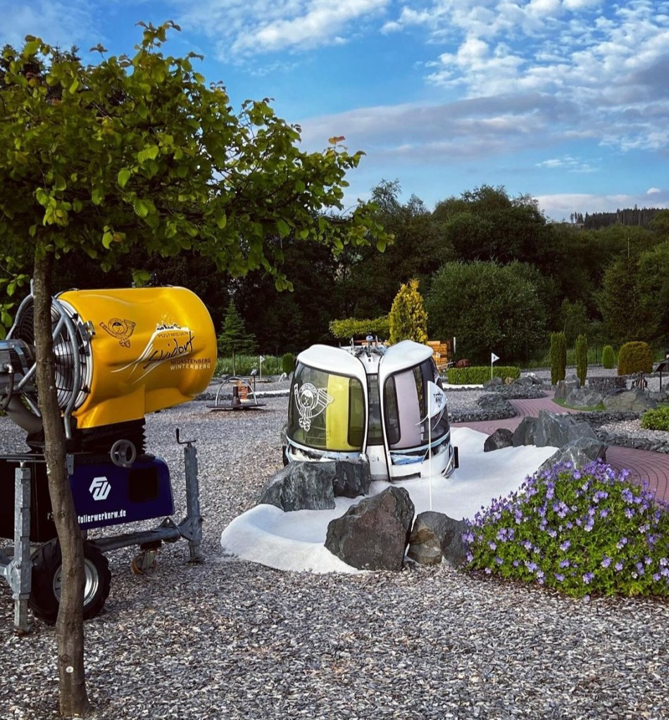 18 Bahnen, jeweils versehen mit Hinweistafeln, sodass ganz nebenbei noch etwas gelernt werden kann – vieles haben Monique und Robin in Eigenleistung erbracht, haben sich ein weiteres Mal auf den Weg durch ganz Deutschland gemacht, um die verschiedenen Utensilien zusammenzustellen – die Gondel stammt beispielsweise aus Bayern –, so hat es dann eineinhalb Jahre gedauert, bis alles fertig war. Für Ostern 2020 war die Eröffnung geplant, aus allseits bekannten Gründen wurde es dann Mai, bis die ersten abenteuerhungrigen Gäste empfangen werden durften. Doch die Geduld, hat sich gelohnt: Das „Adventure Golf Winterberg“ ist zu einem echten Highlight der Region geworden – eigentlich wäre es selbst auch eine Bahn wert 😉 –, und durfte im vergangen Jahr sogar die ersten Deutschen Meisterschaften im Adventure Golf austragen.