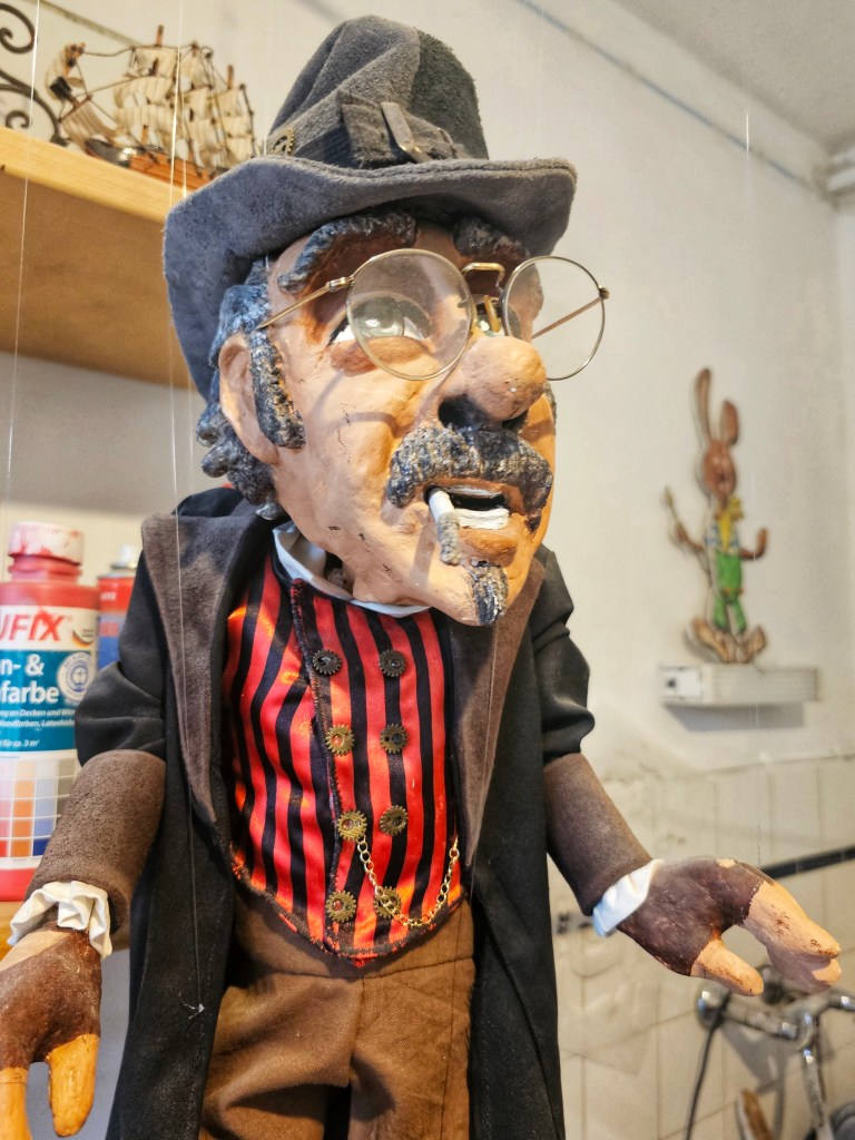 Was war zuerst, die Marionette oder das Stück? Historisch kann ich dir das nicht beantworten, im Fall der „Marionettenbühne Mummenschanz“ hingegen schon: Am Anfang steht immer das Stück, das zur Aufführung gebracht werden soll, erst dann macht sich Andreas Ermster Gedanken darum, welche Rollen er hierfür braucht und wie die Figuren aussehen sollen. Inspiration dazu findet er im Alltag – erst neulich entdeckte er an der Supermarkt-Kasse einen Mann, der – ohne sein Wissen, versteht sich – als Modell für eine Marionette dienen sollte…