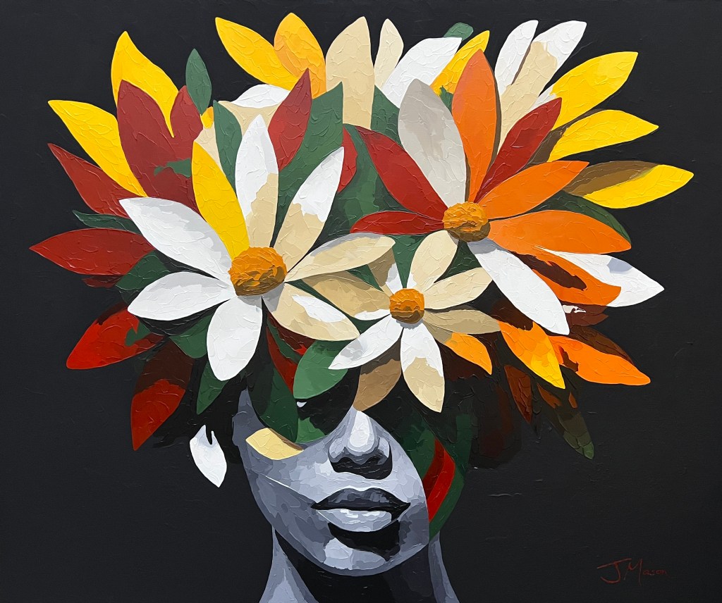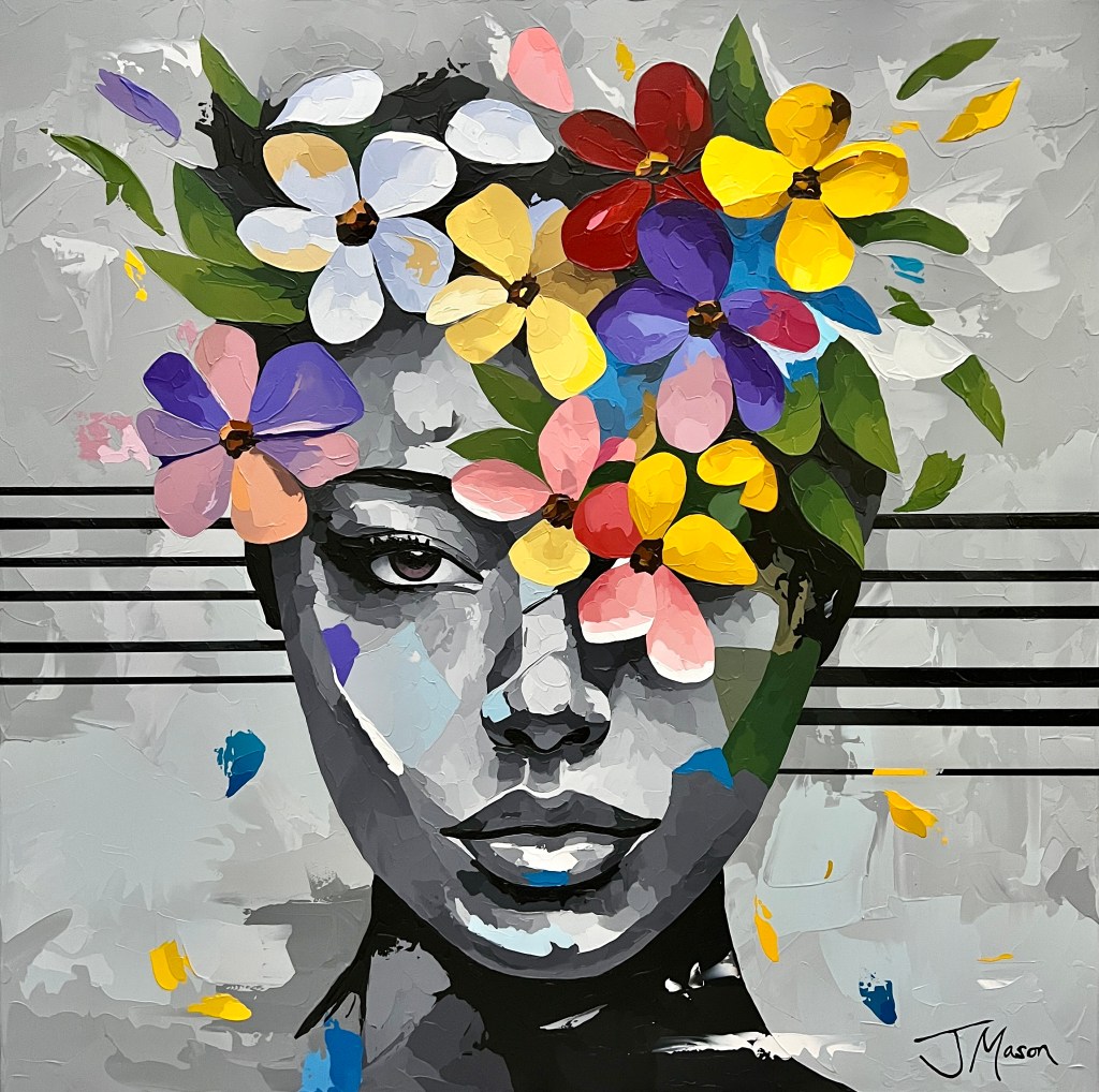 Ich glaube schon… Meine aktuelle Serie „In Bloom“, an der ich seit knapp einem Jahr arbeite, ist etwas mehr surrealistisch geprägt. Anfangs habe ich Tiere und Portraits von berühmten Persönlichkeiten gemalt, aber das macht ja jeder. Inspiriert vom Stil „Pop Surrealism“, ein kleines Stück der großen Kunstwelt, sind es jetzt häufig auch Portraits von Menschen, mit denen dann allerdings etwas Merkwürdiges geschieht. Ich wollte etwas eigenes schaffen, und das ist mir mit meiner aktuellen Serie gelungen: Den Menschen auf den Portraits wachsen Blumen auf dem Kopf und im Gesicht. Zentrales Element sind hier die Augen, die ich teilweise hinter den Blüten verstecke. Augen sind die Türöffner für die Seele – so bleibt dann viel Interpretationsspielraum beim Betrachter.