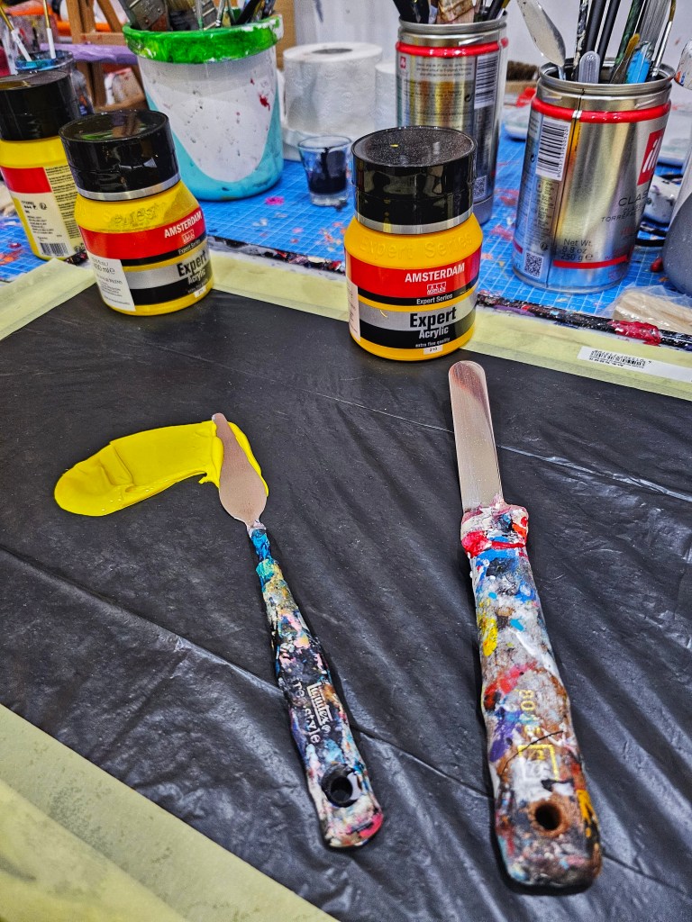 Ja, der Spachtel ist absolut mein Ding, fast schon mein Markenzeichen. Ich habe ihn in jeder Größe und in jeder Form. Alle meine Bilder entstehen so, Pinsel brauche ich überhaupt nicht – das einzige Werkzeug, was sonst noch zum Einsatz kommt, ist ein Bleistift, um die Umrisse zu skizzieren.