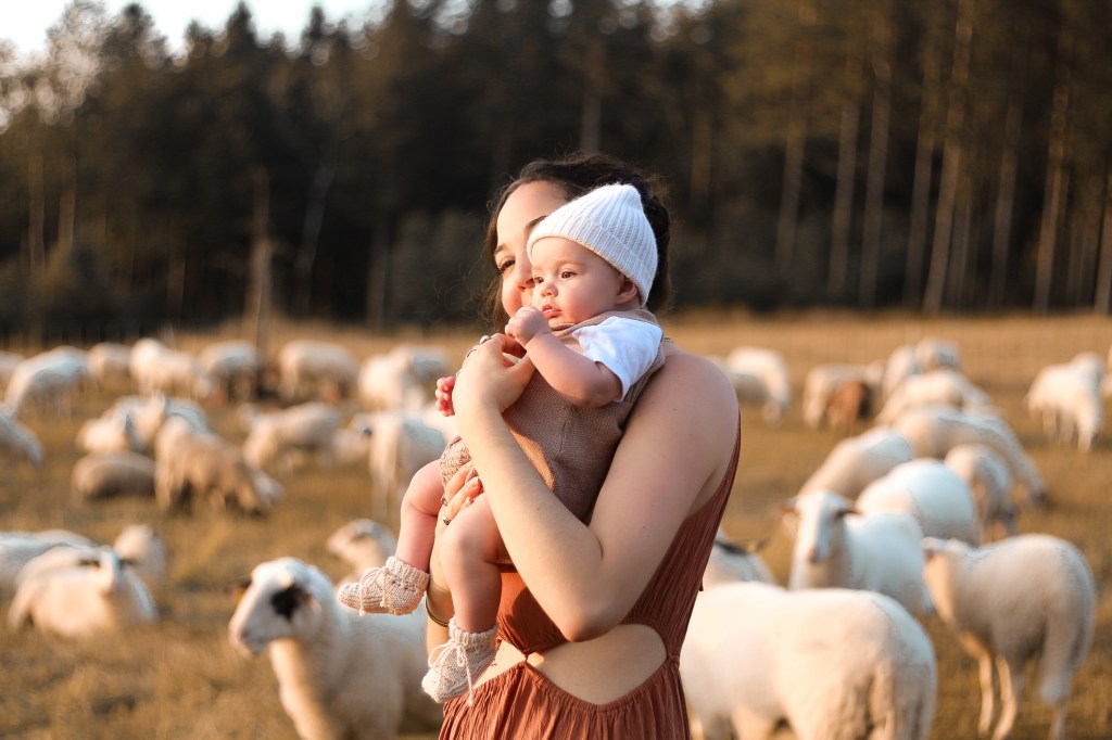 Selbstverständlich sollte Rumi auch so schöne Sachen wie ich bekommen, also designten Kasey und Manuel kleine Mützen, Söckchen und Decken aus reiner Merino-Wolle; die ist wohl perfekt für die empfindliche Babyhaut, weil sie temperaturregulierend, hypoallergen und antibakteriell ist und unglaublich feine, weiche Fasern hat, die nicht so kratzig wie „normale“ Wolle sind.