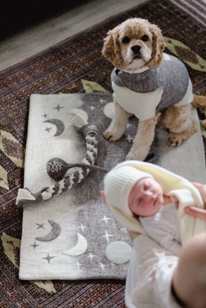 Rumi bekam auch eine Spielmatte, ähnlich wie meine, aber ein bisschen größer – kein Problem, das kann ich verstehen, so ein Baby braucht ja auch etwas mehr Platz als ein bescheidener Cockerpoo… Auf so einer Matte können übrigens auch Erwachsene sitzen, ich habe gesehen, dass Kasey sogar darauf meditiert.