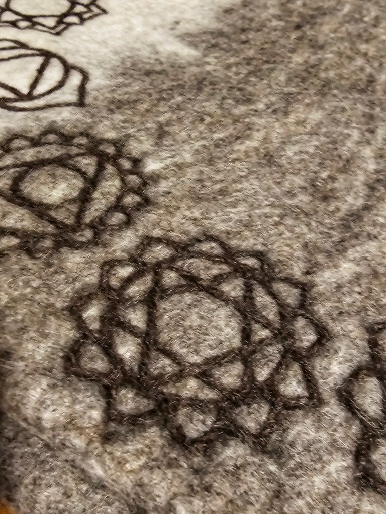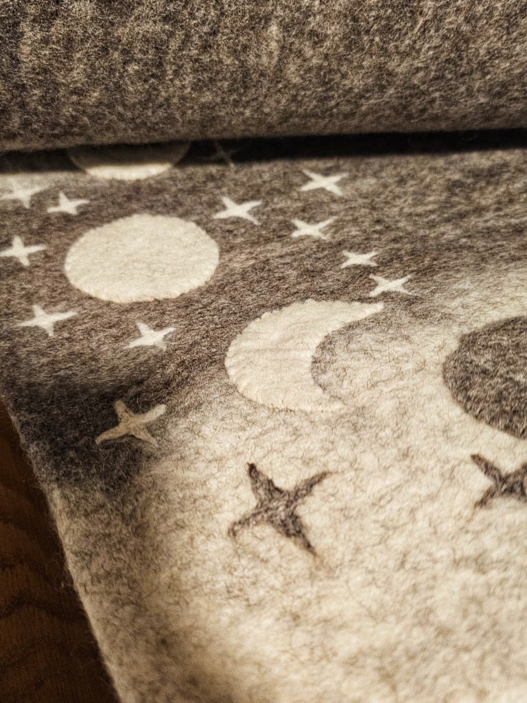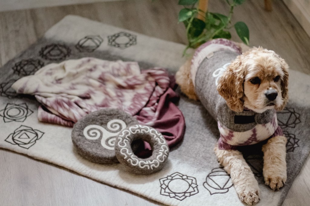 Inzwischen hatte das Ganze einen Namen bekommen, „Wooliie“, wie passend, oder!? Und Kasey und Manuel hatten immer wieder neue Ideen: Wenn wir auf Reisen waren, habe ich an den Bahnhöfen manchmal einen ganz schön kalten Popo bekommen, wenn wir mal wieder etwas länger warten mussten. Deswegen bekam ich als nächstes eine dicke Matte, die Manuel immer in einer passenden Tasche mit sich herumgetragen und bei passender Gelegenheit einfach ausgerollt hat – selbstverständlich auch mit den wunderschönen Designs, schließlich bin ich ja nun auch ein bisschen verwöhnt.